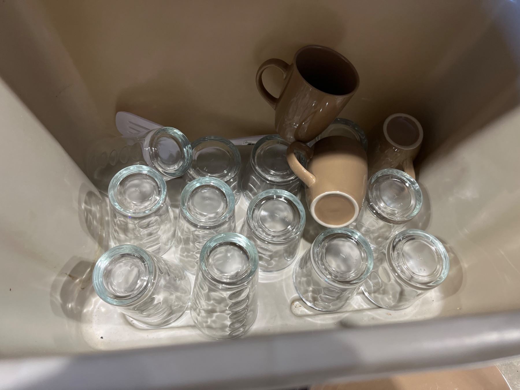 Lot 7565 Lot of Assorted Plates, Bowls, Mugs, and Glasses in Beige and Clear Tones