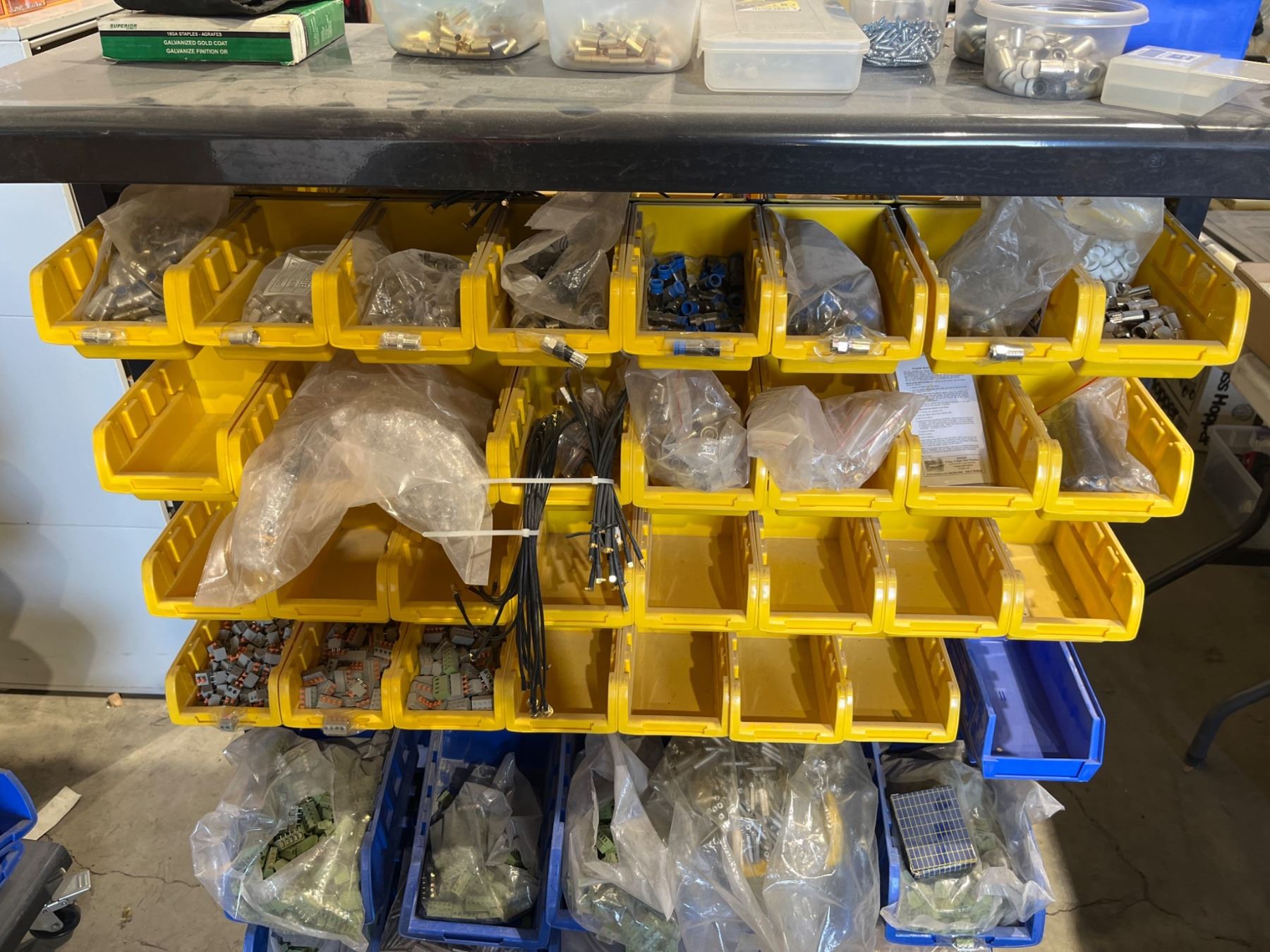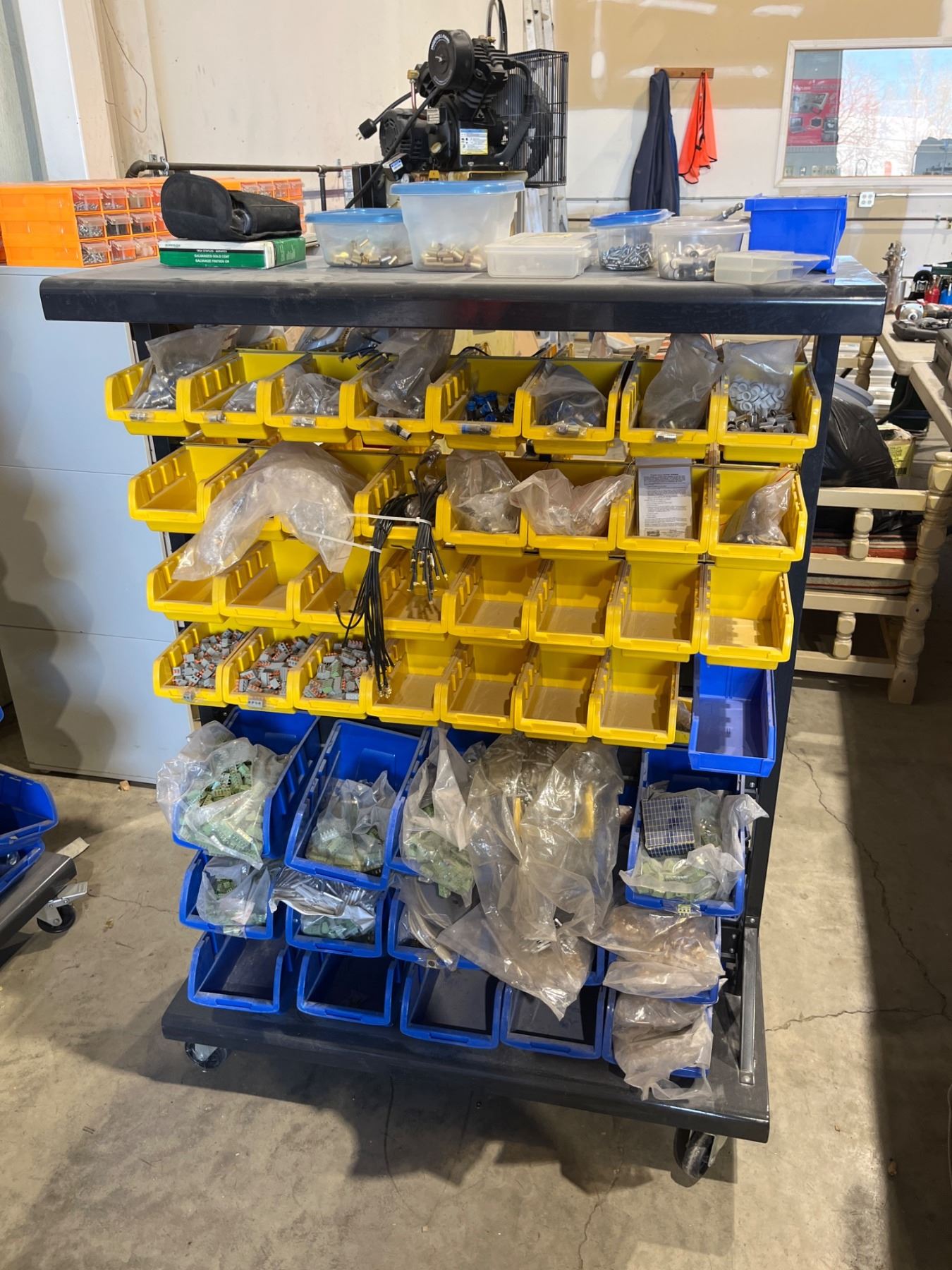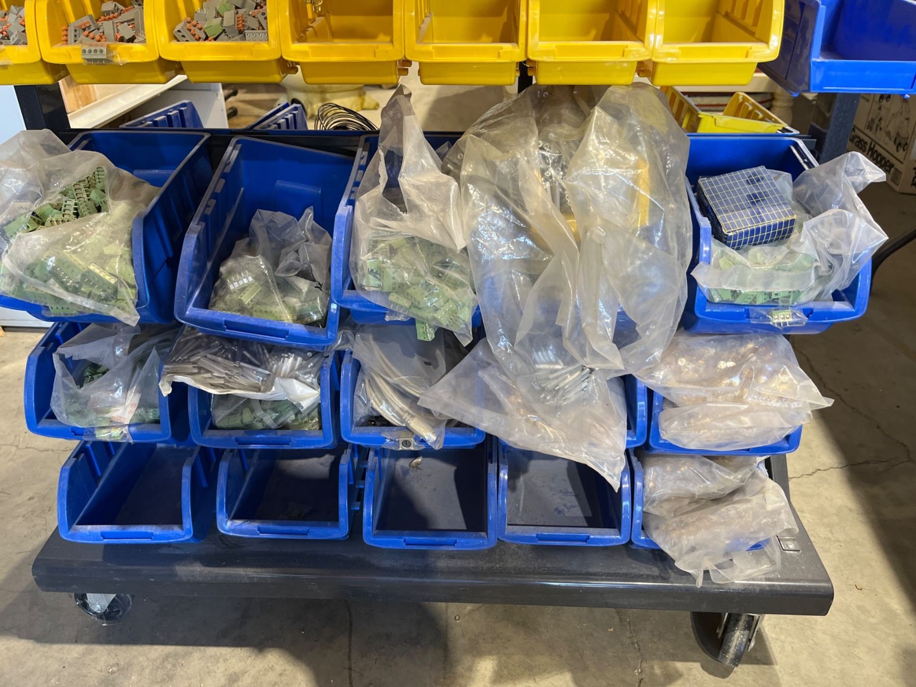 Mobile Rolling Steel Shelf With Plastic Bins Containing Assorted Fasteners And Hardware