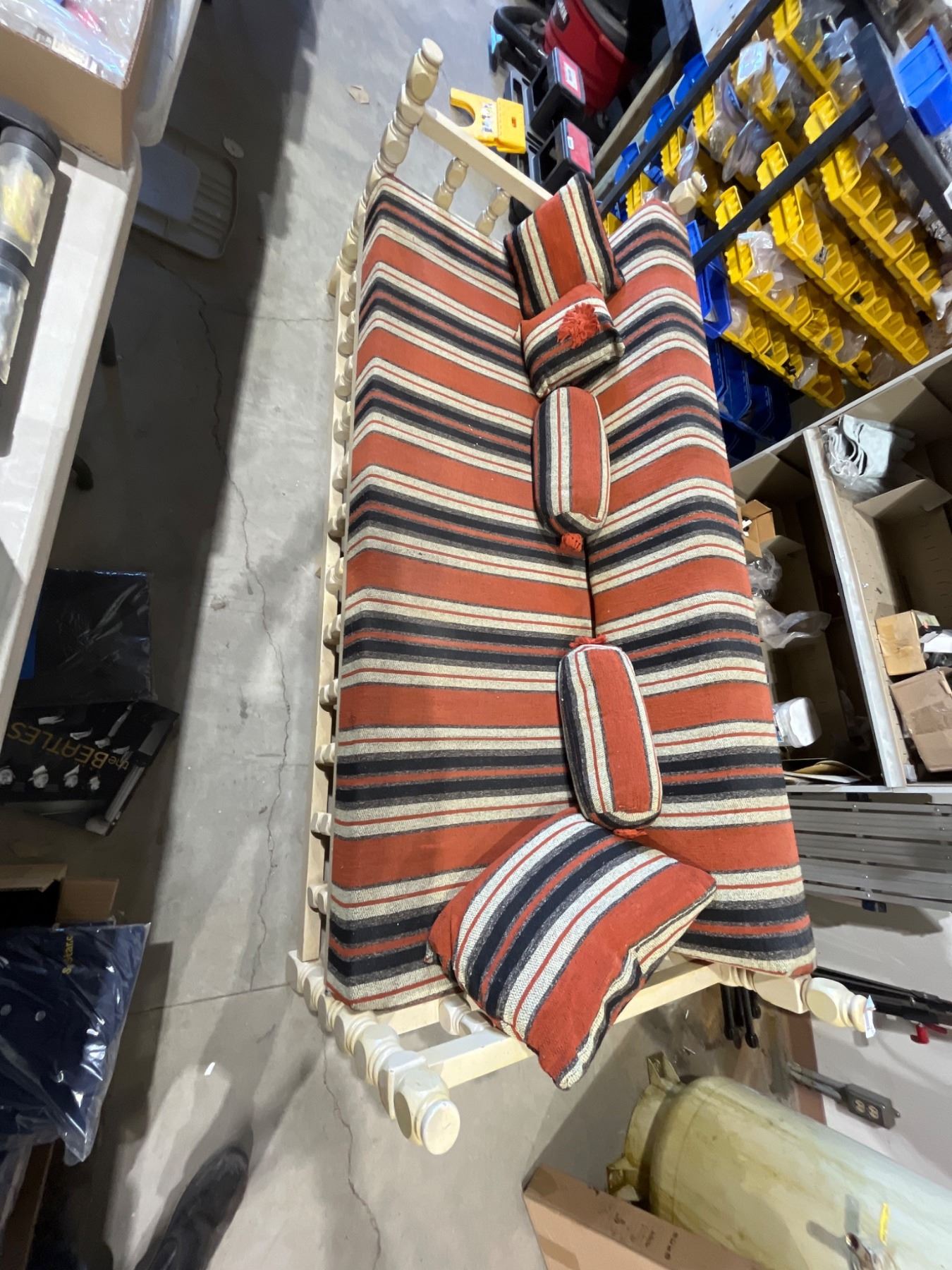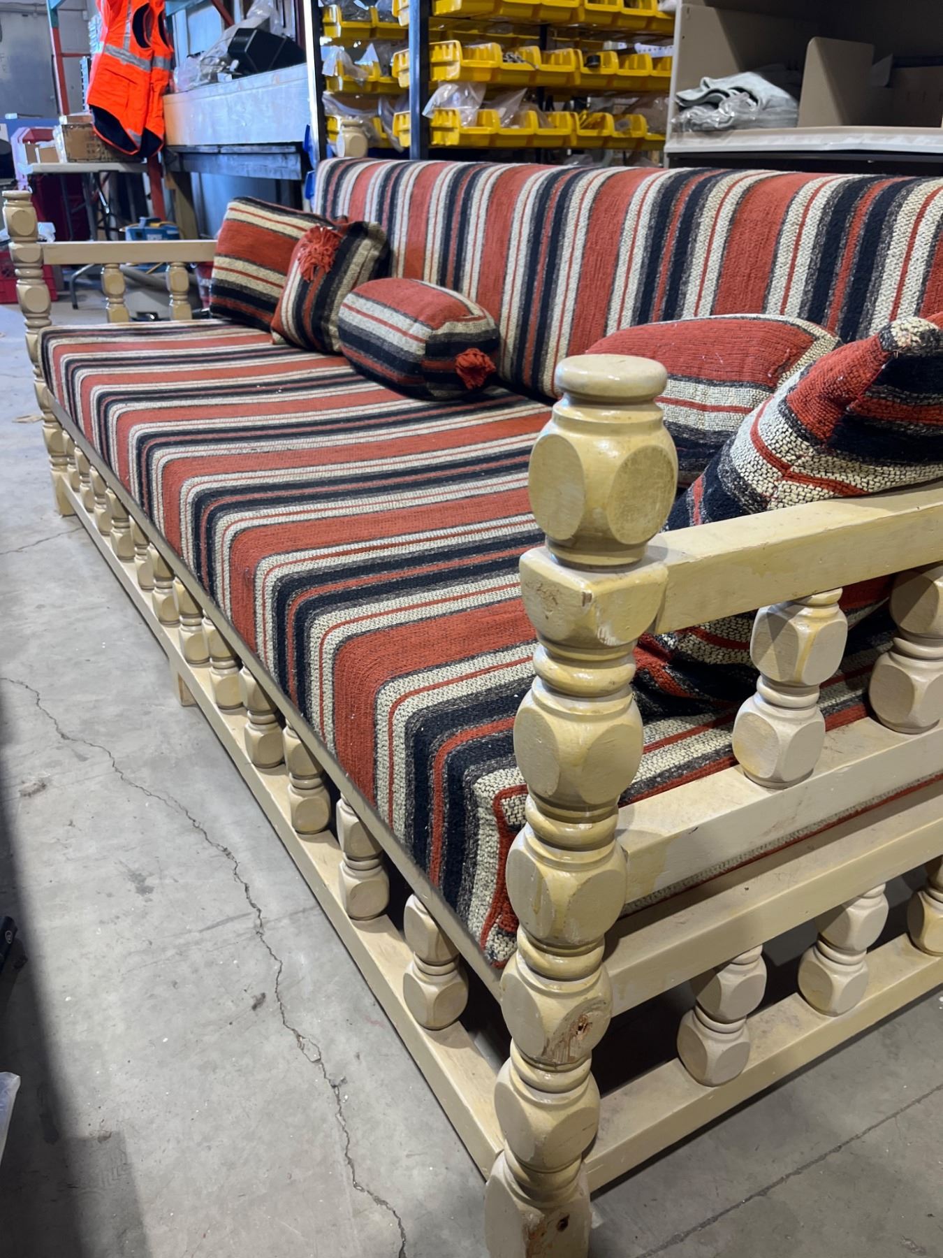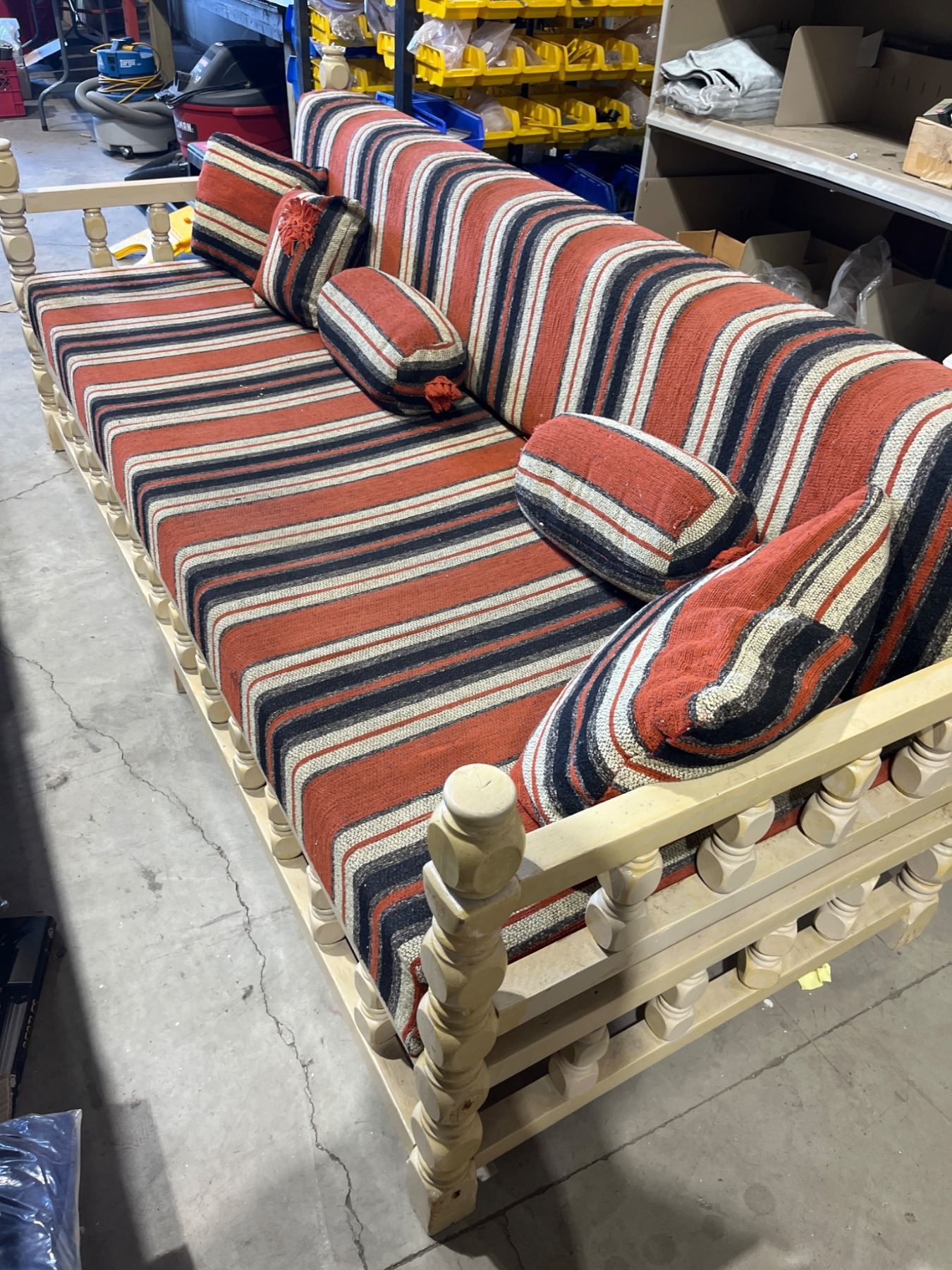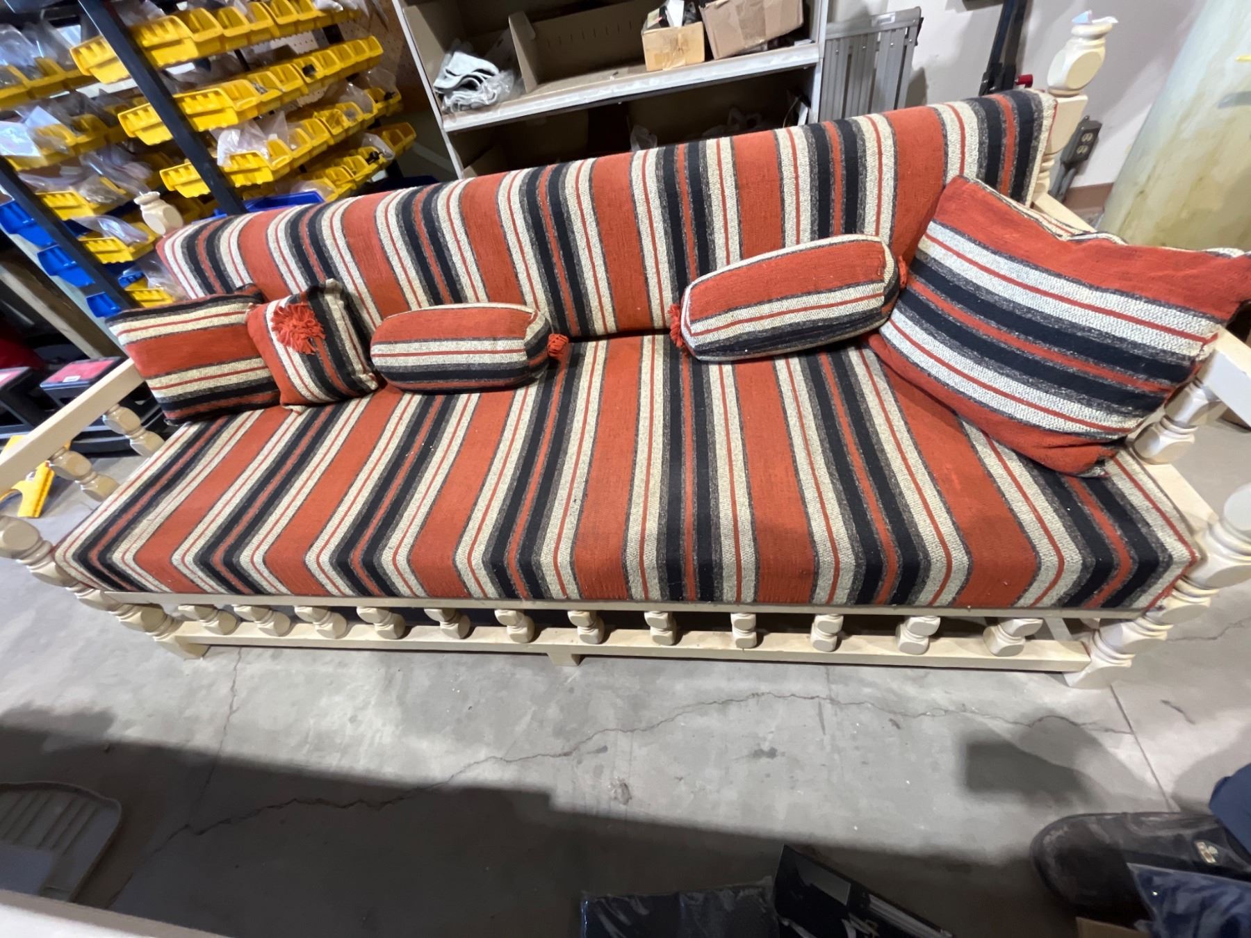 Lot 7620 8ft Wood-Framed Sofa with Striped Fabric and Cushions