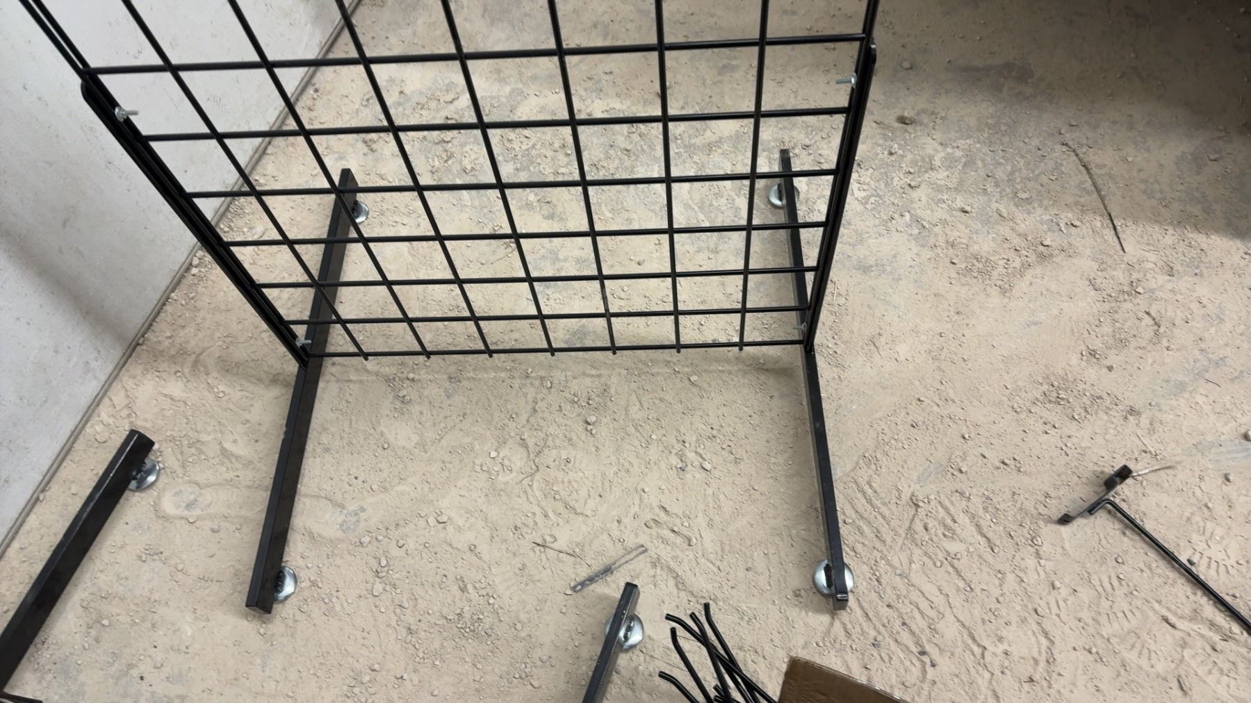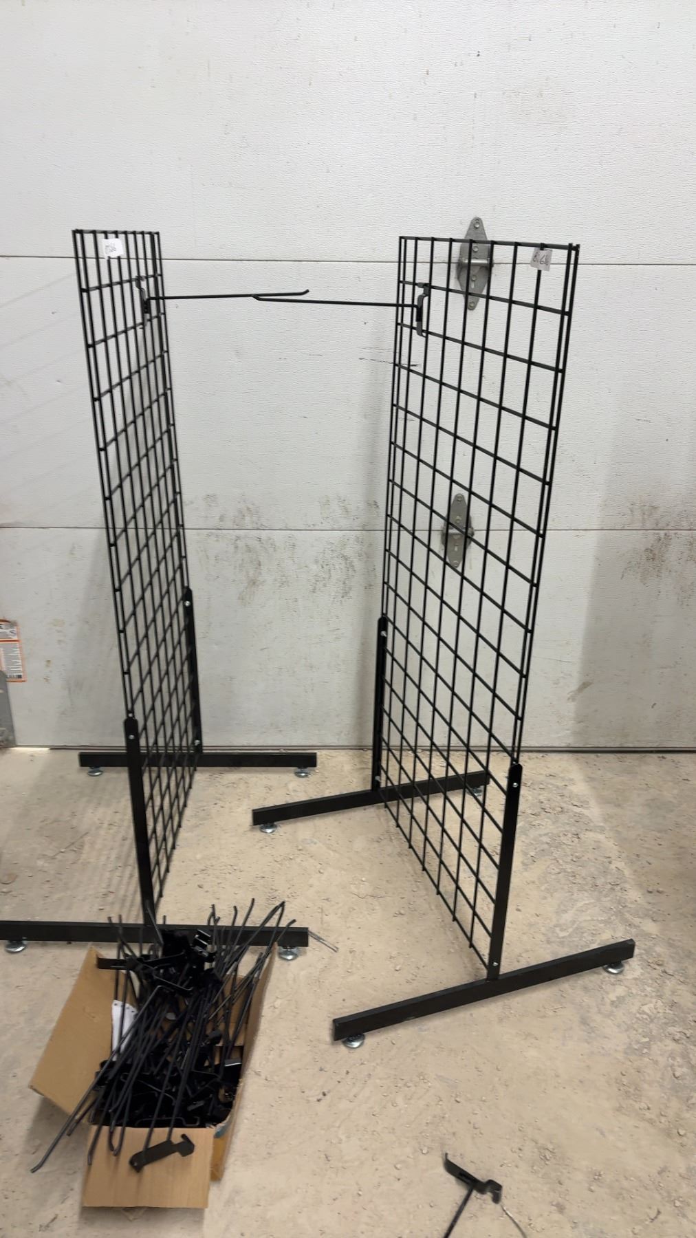 Two Black Metal Gridwall Display Panels with T-Base Stands and Display Hooks 51 x 24 x 24