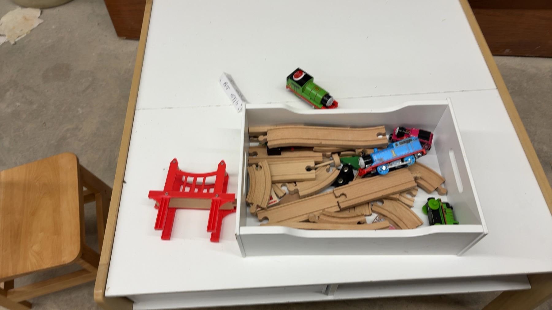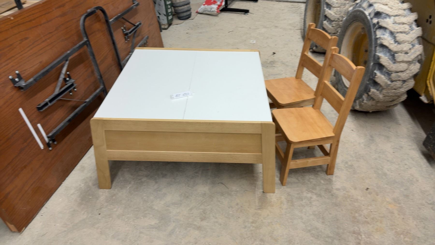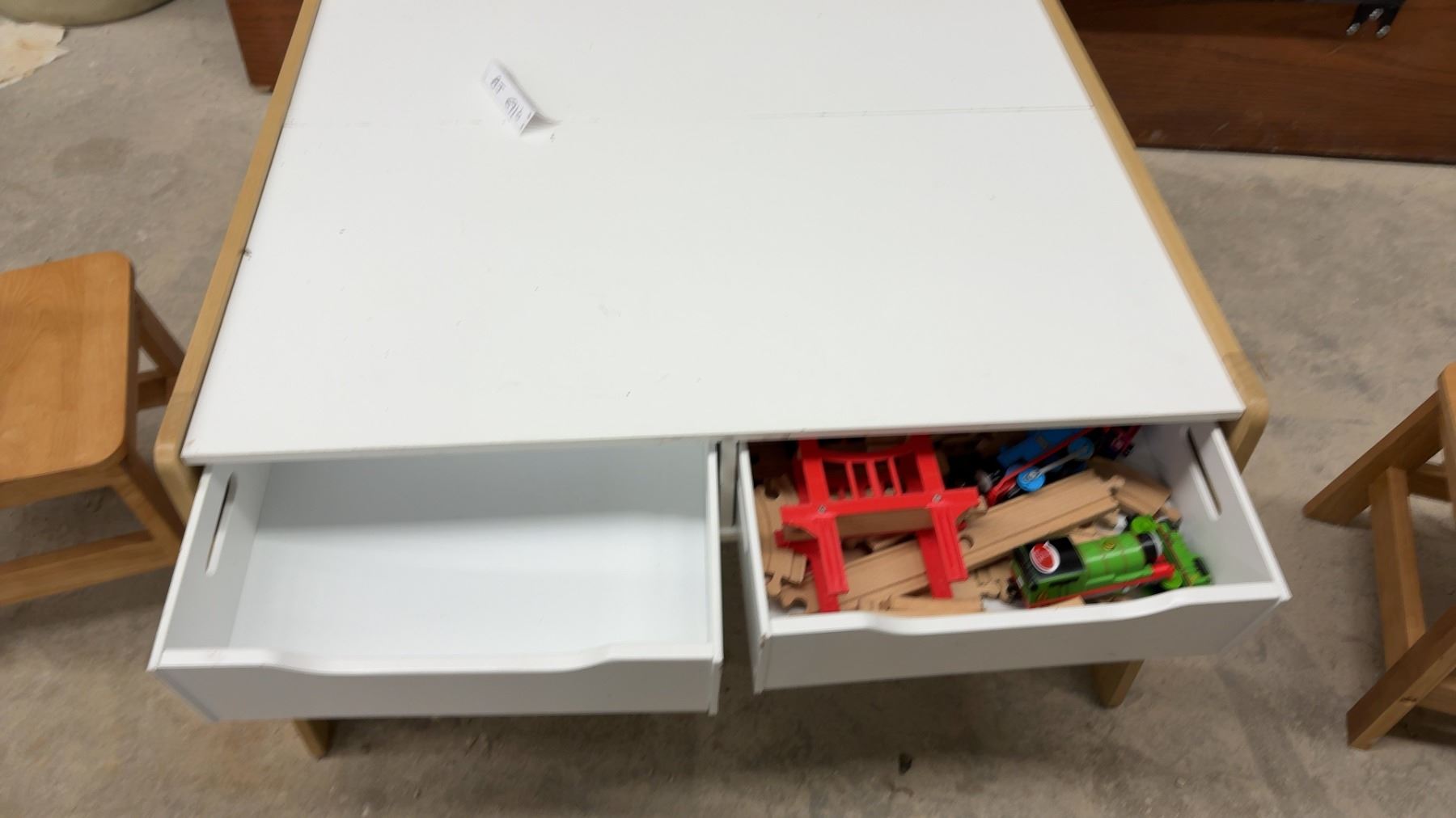 Lot 691B Children's Activity Table 17 x 33 x 32" with Storage Bins, Two Wooden Chairs, and Train Set