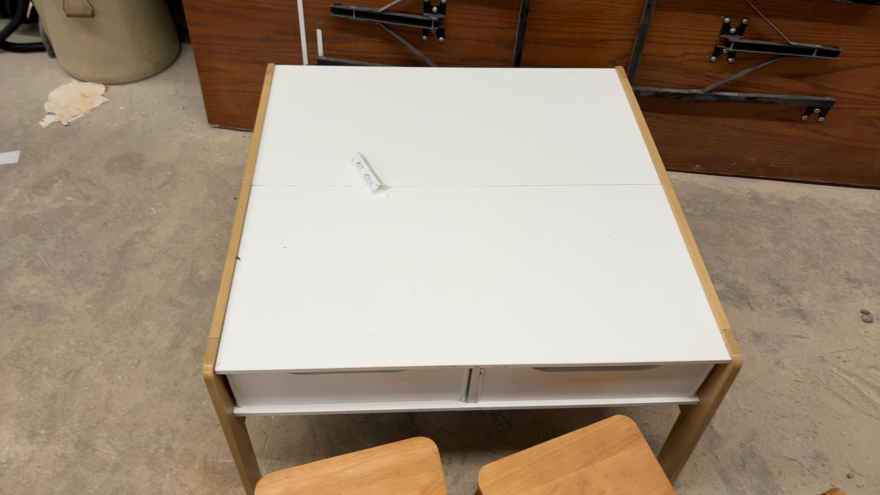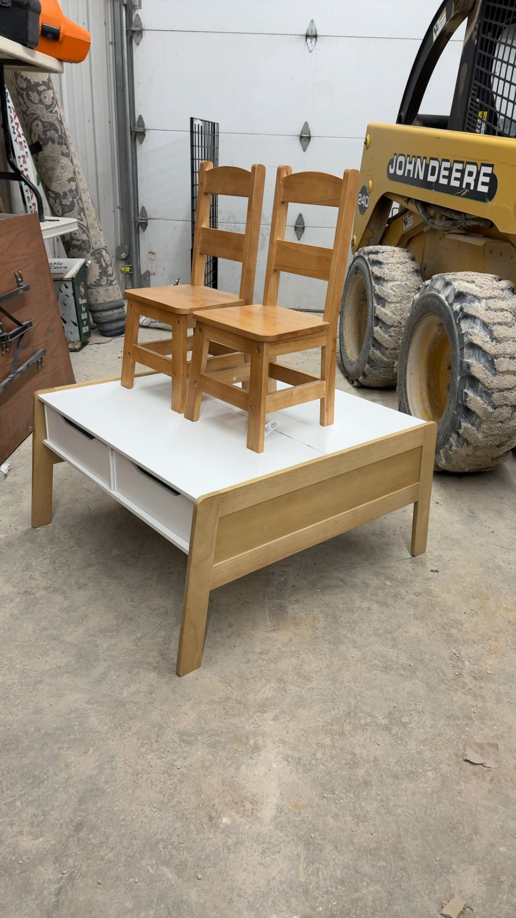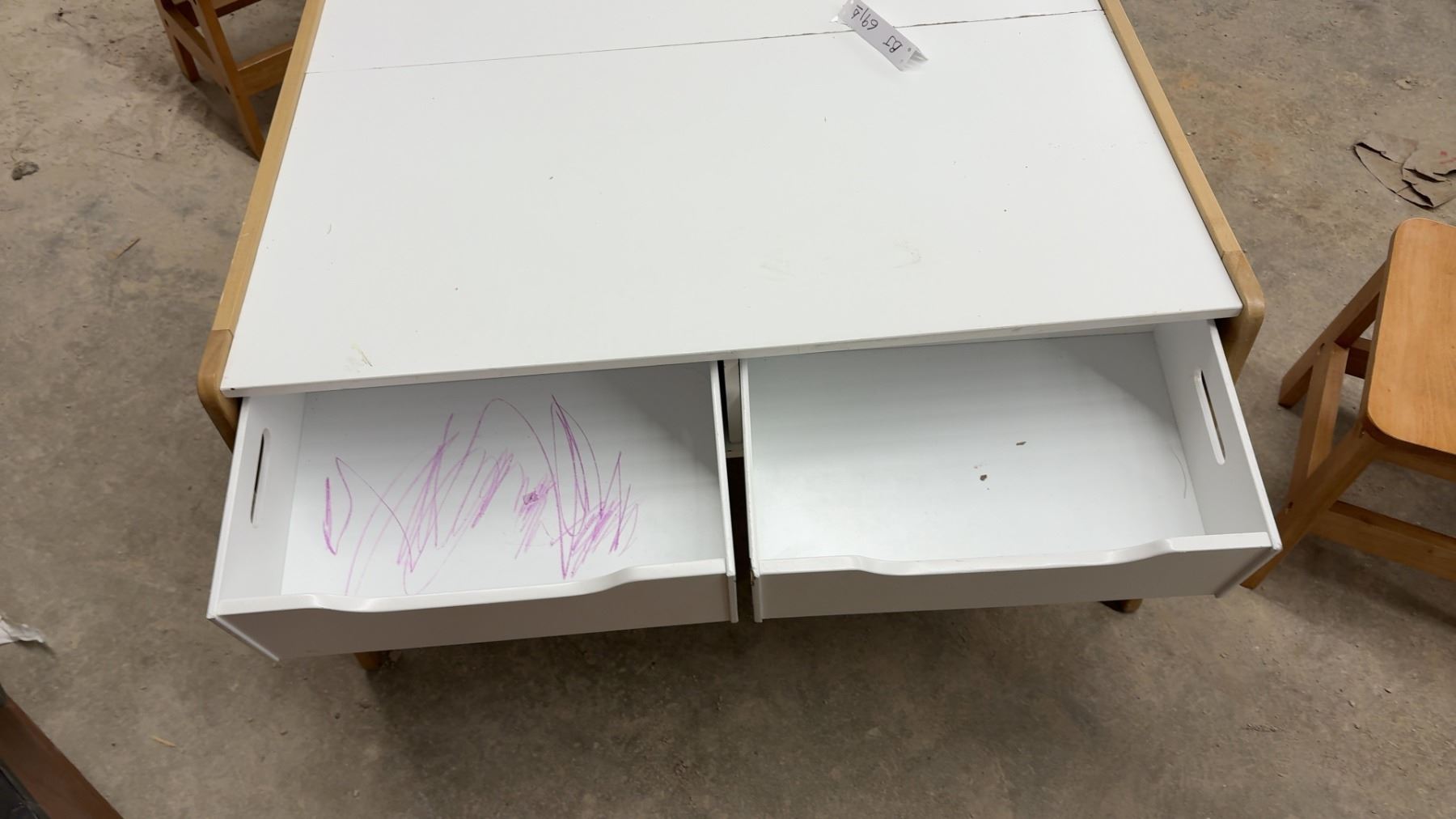 Lot 691B Children's Activity Table 17 x 33 x 32" with Storage Bins, Two Wooden Chairs, and Train Set