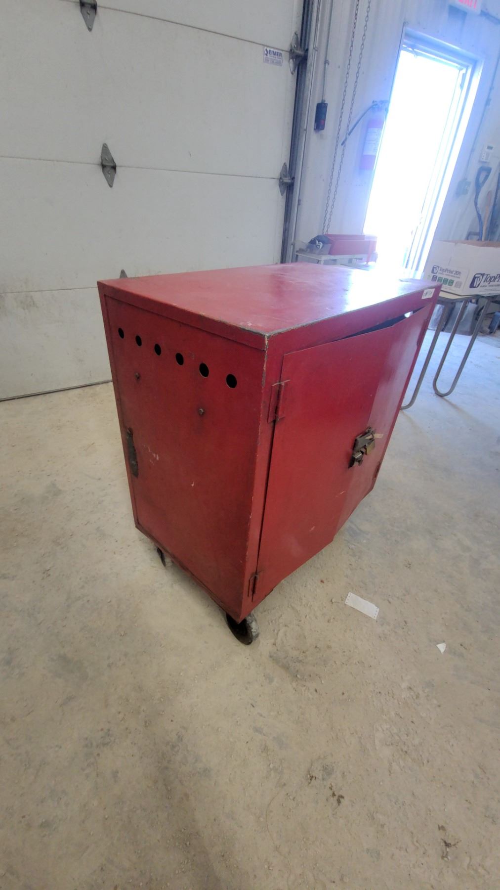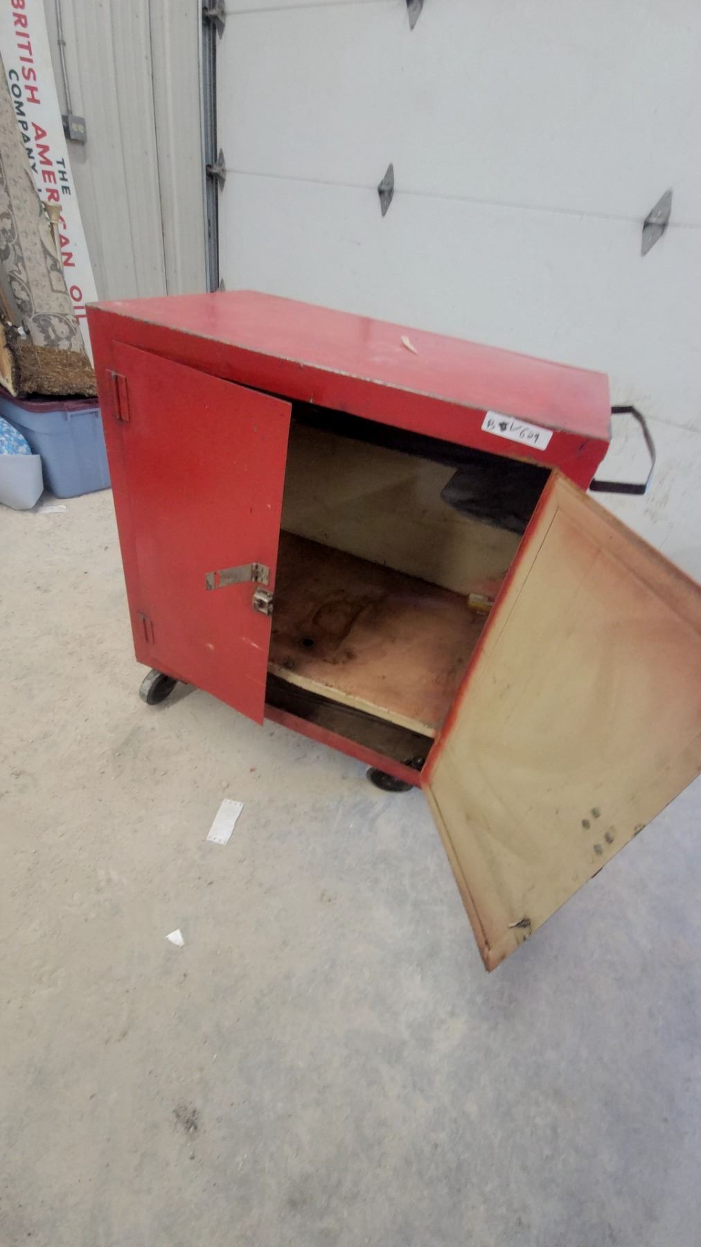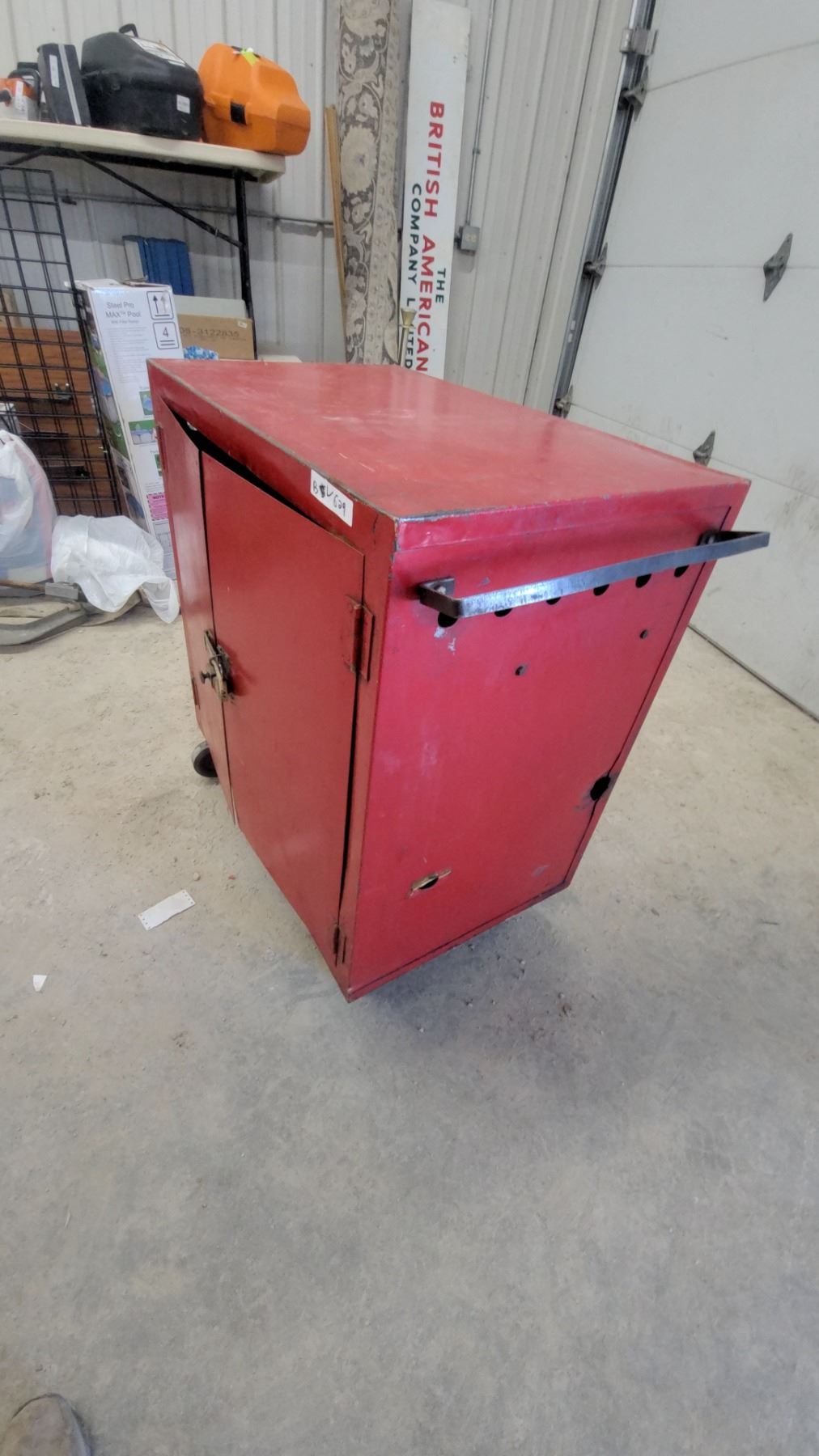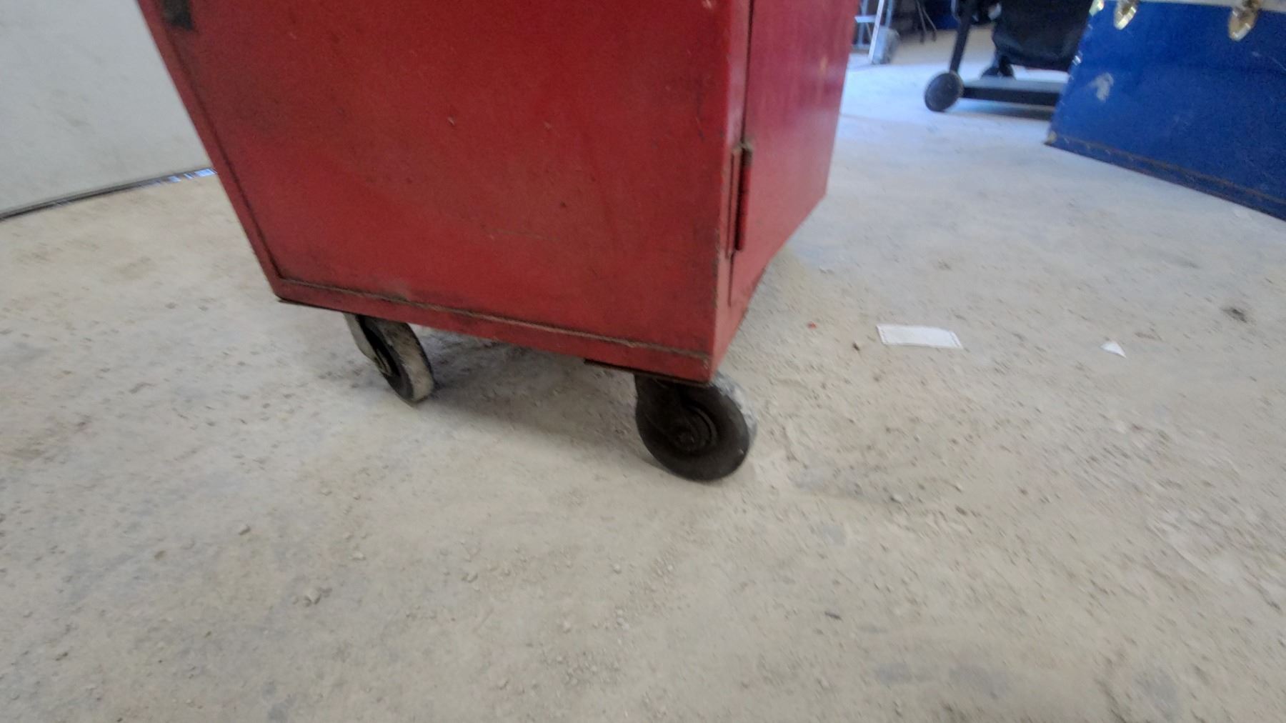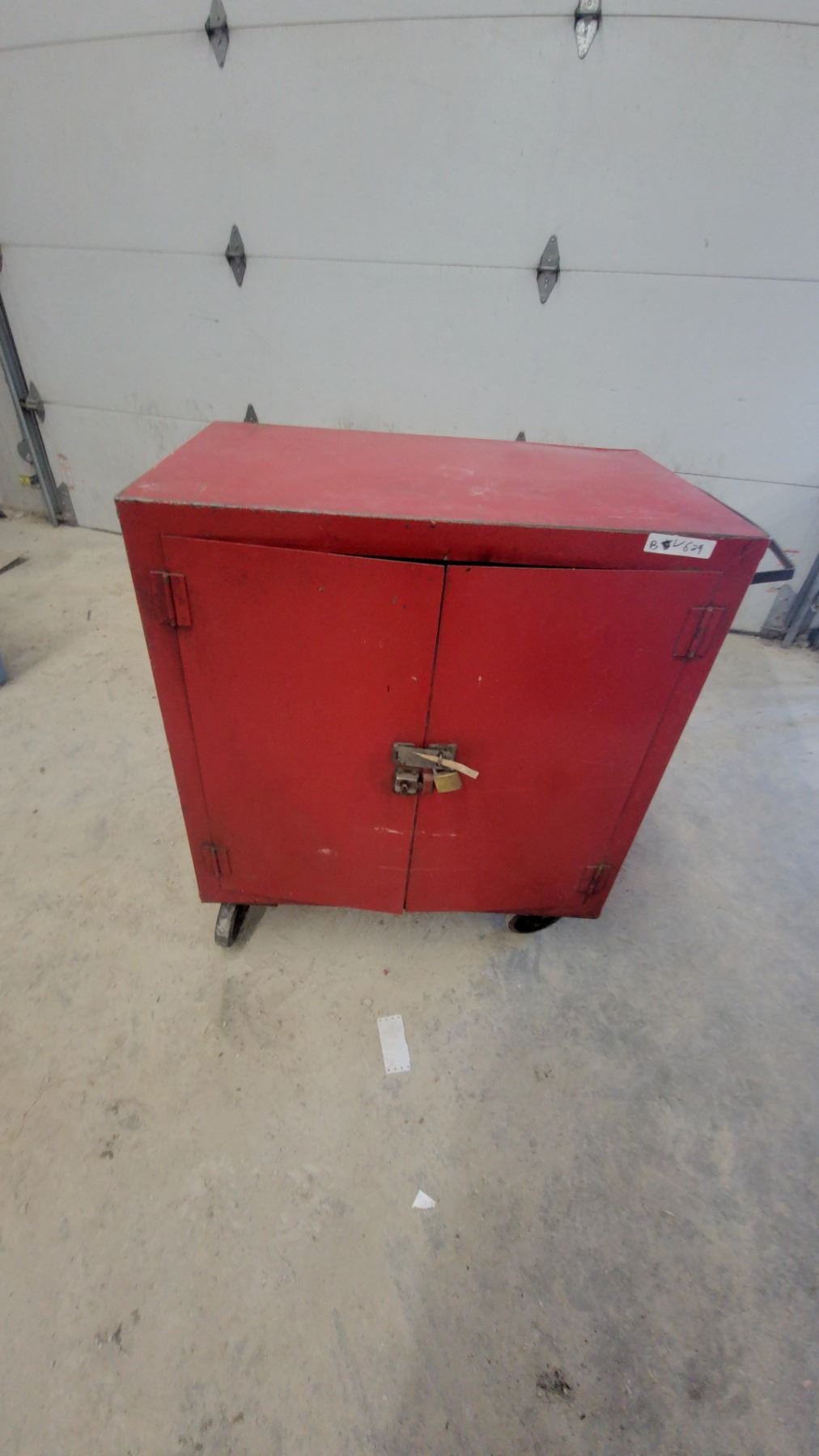 Lot 629 Red Metal Rolling Tool Cabinet with Double Doors,, and Casters 38 x 33 x 21"
