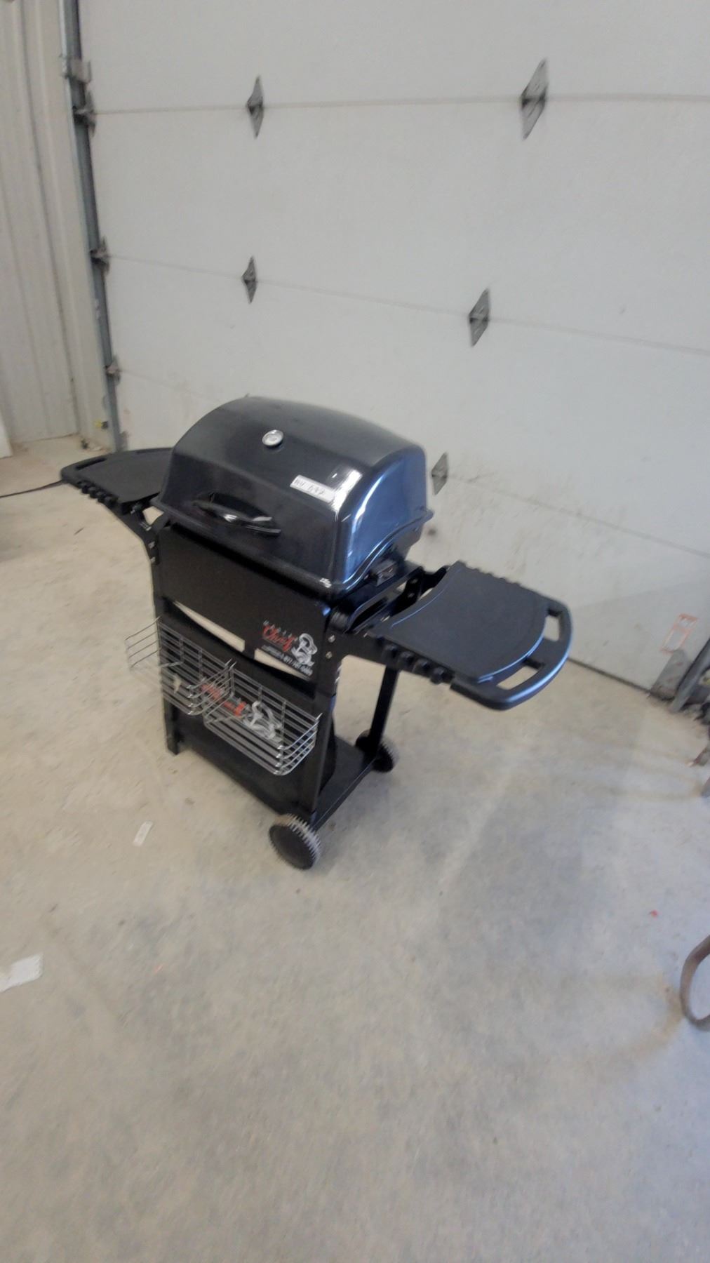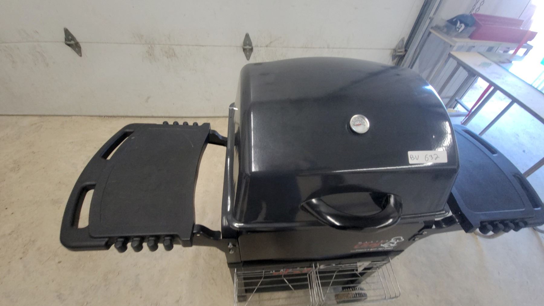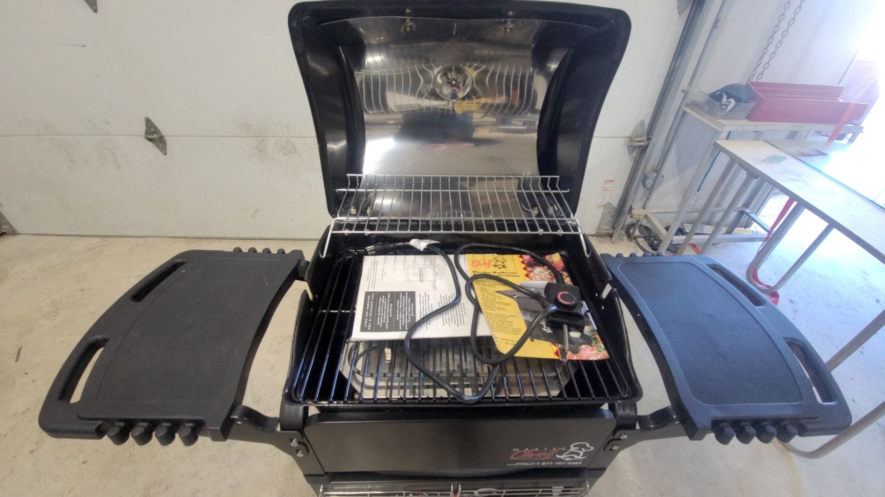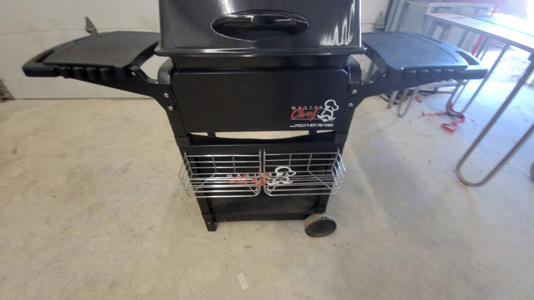 Lot 632 Master Chef 2-burner Electic BBQ Grill with Side Shelf, Warming Rack, and Storage Basket Appears