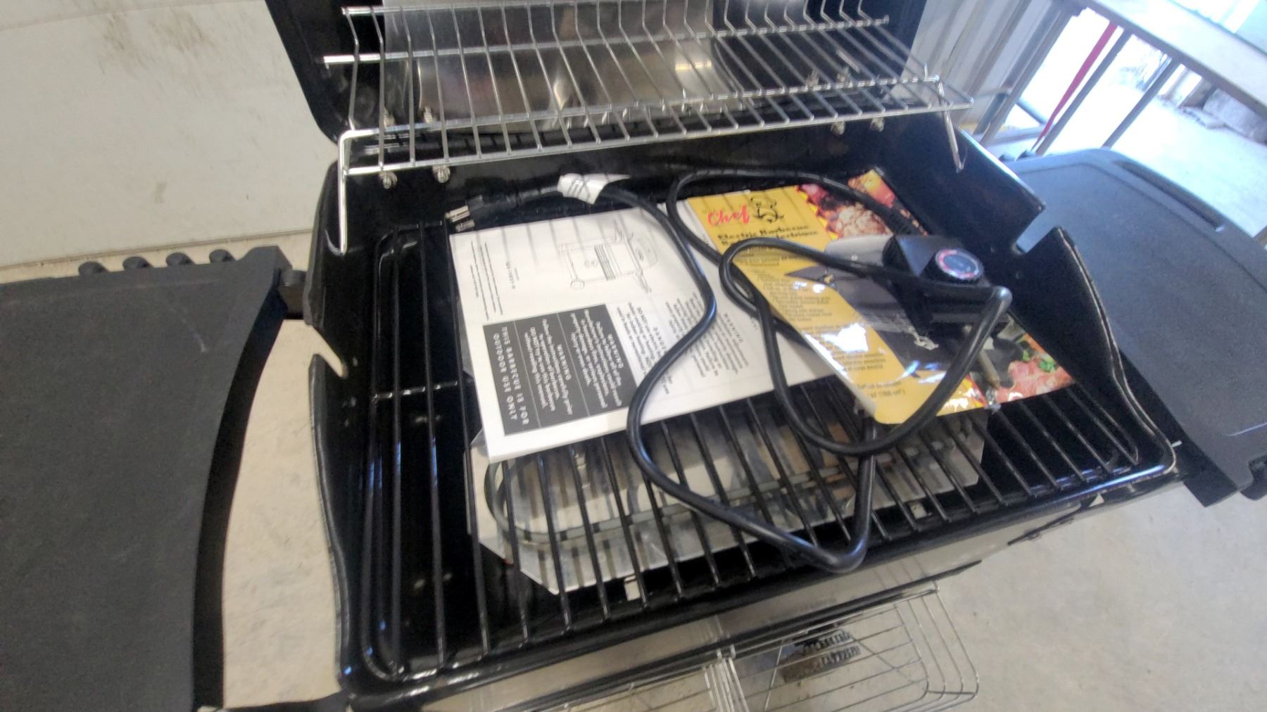 Master Chef 2-burner Electic BBQ Grill with Side Shelf, Warming Rack, and Storage Basket Appears New
