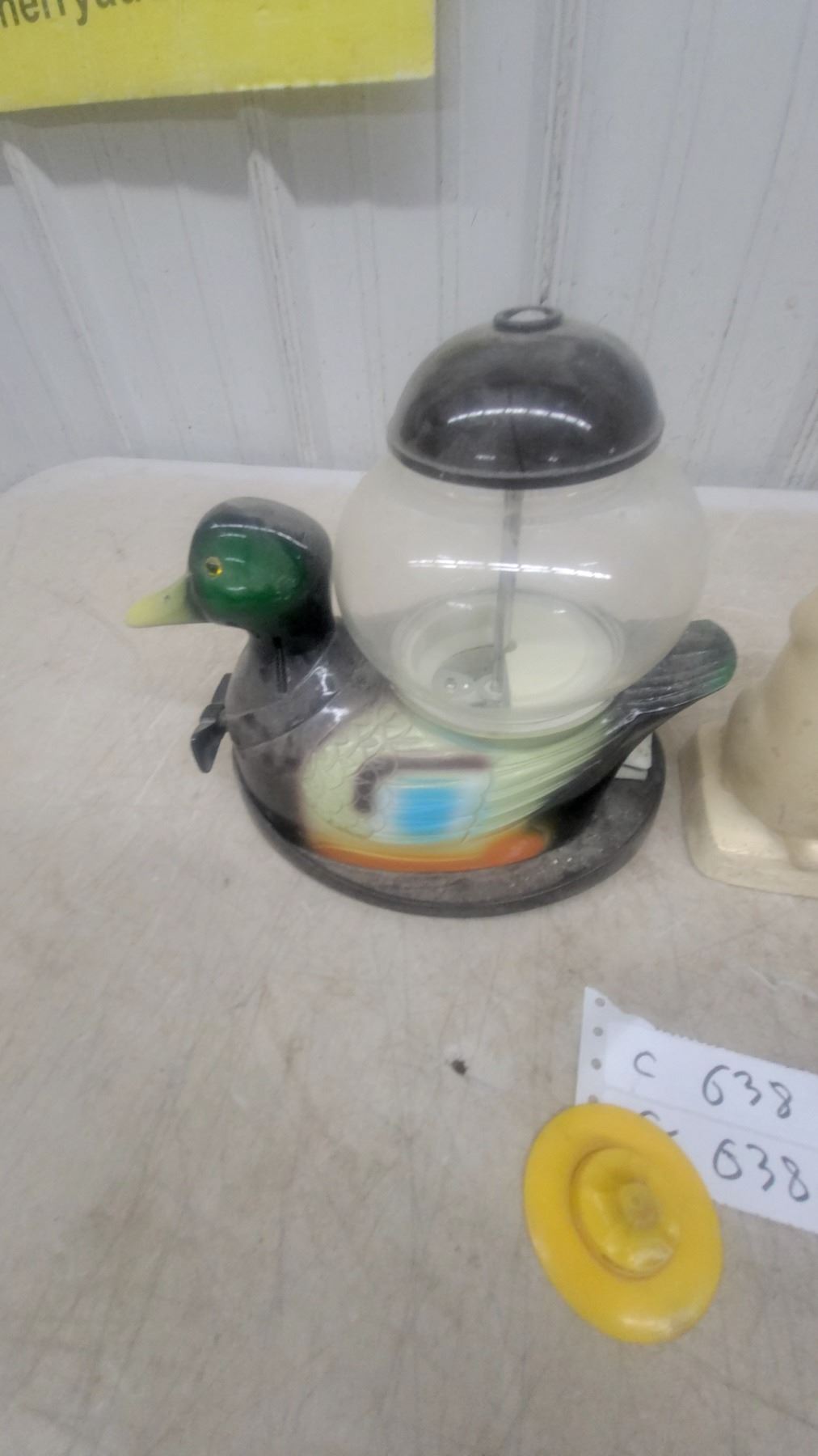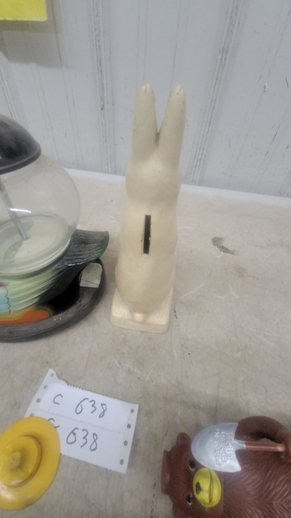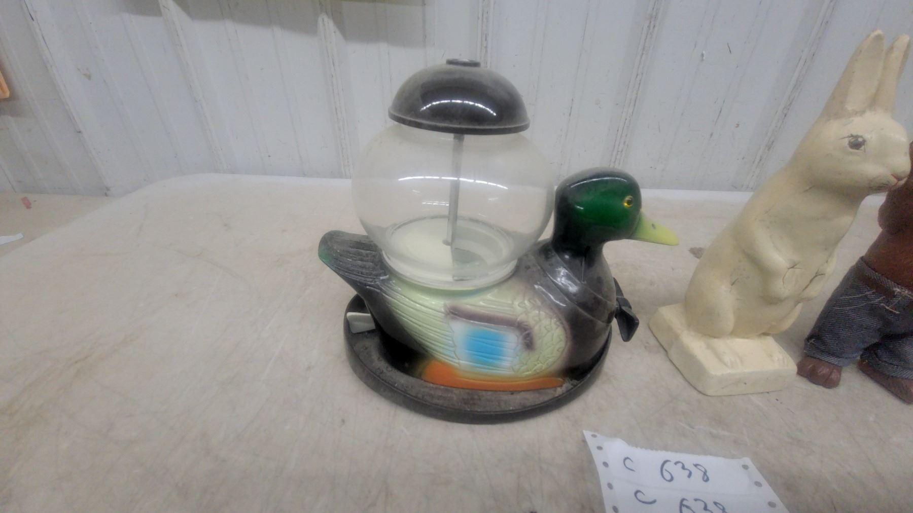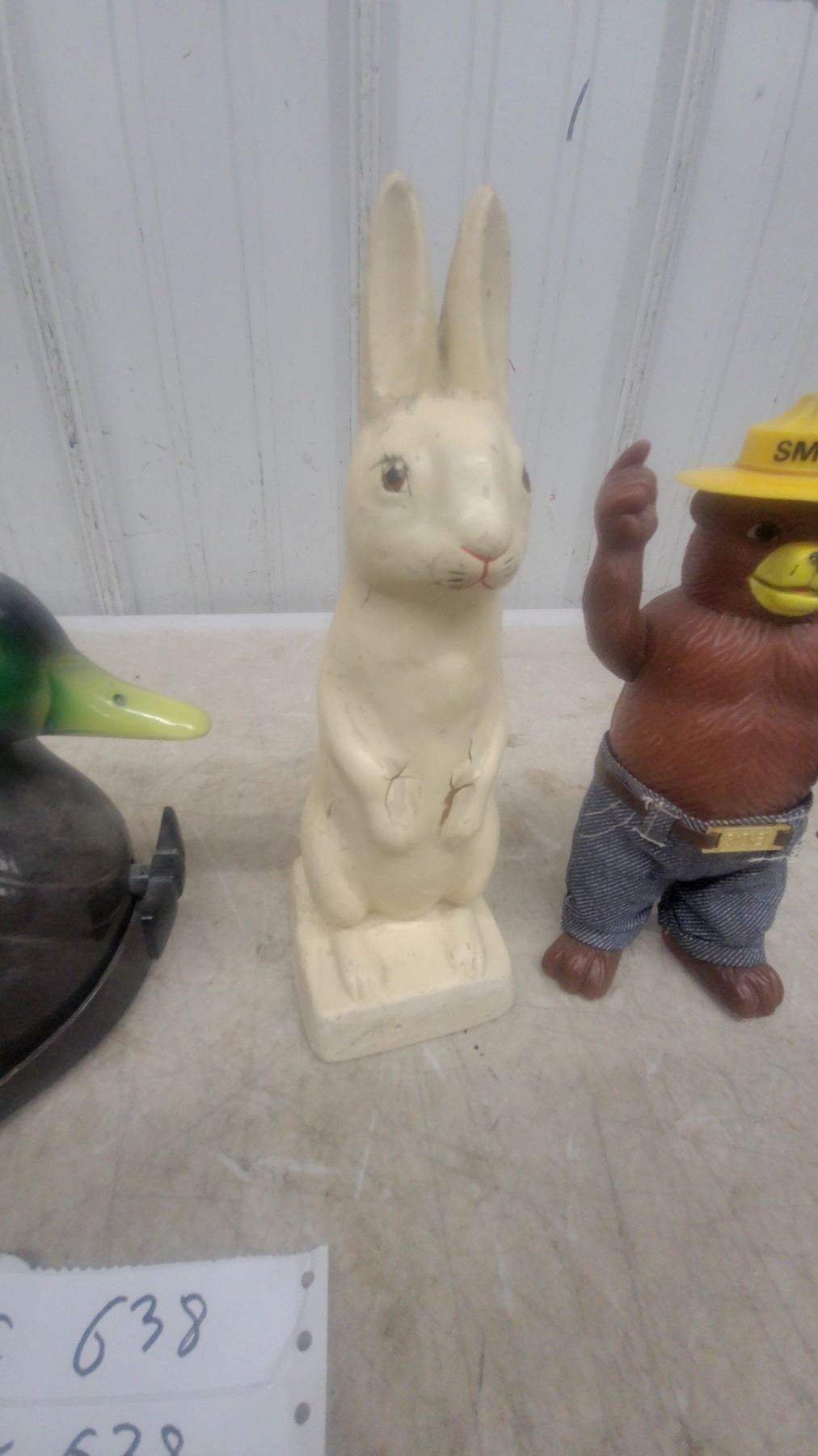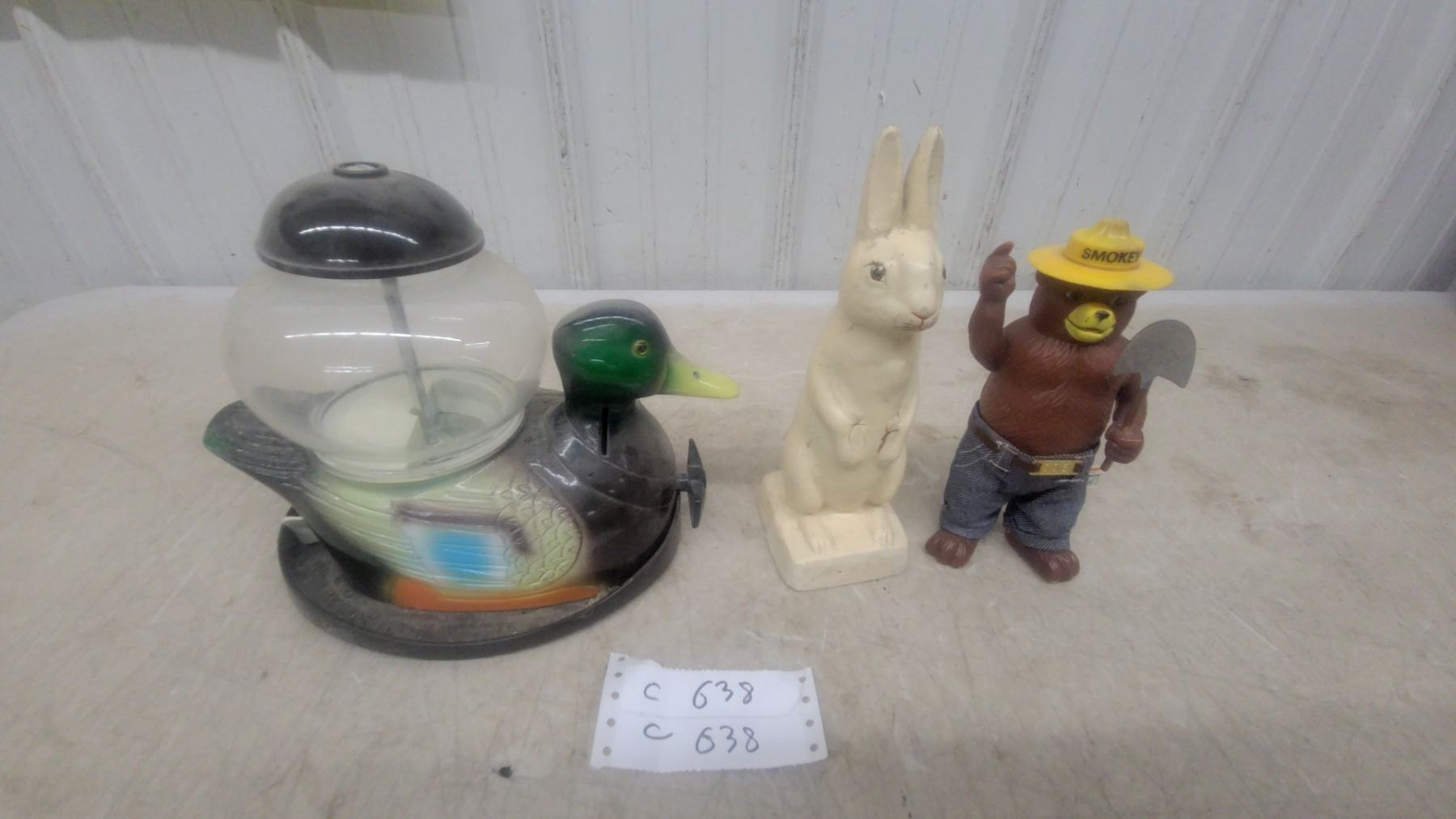 Lot 638 Mallard Duck Gumball Dispenser, Vivtage Rabbit Bank Figurine, and Smokey Bear Figure
