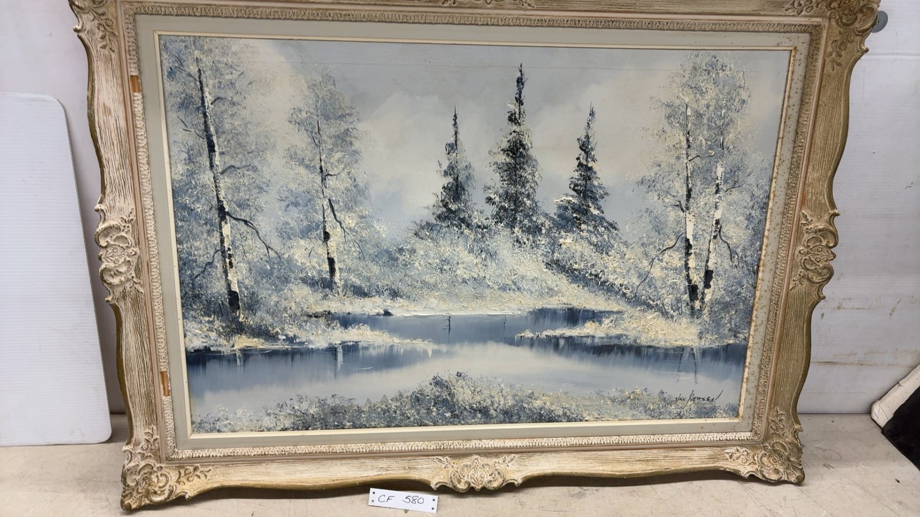Lot 580 Van Hersen Signed Oil Painting, Winter Landscape Scene in Ornate Frame 31 x 42"