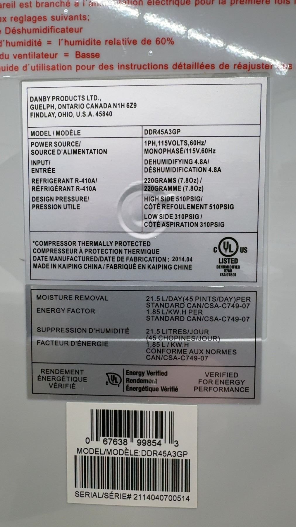 Lot 588 Danby Premiere DDR45A3GP 45-Pint Dehumidifier, Energy Star Rated