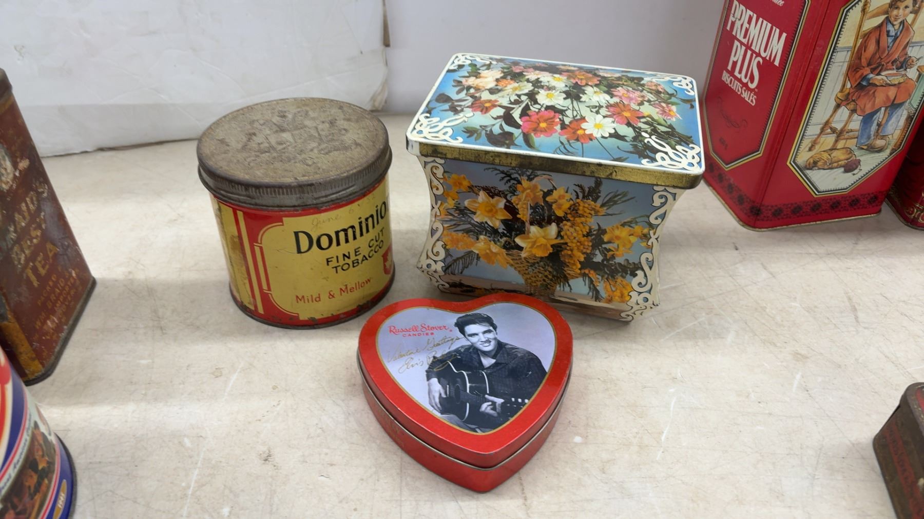 Collection of Vintage Advertising Tins Including Pepsi-Cola, Maxwell House, Ritz, Dominion Tobacco