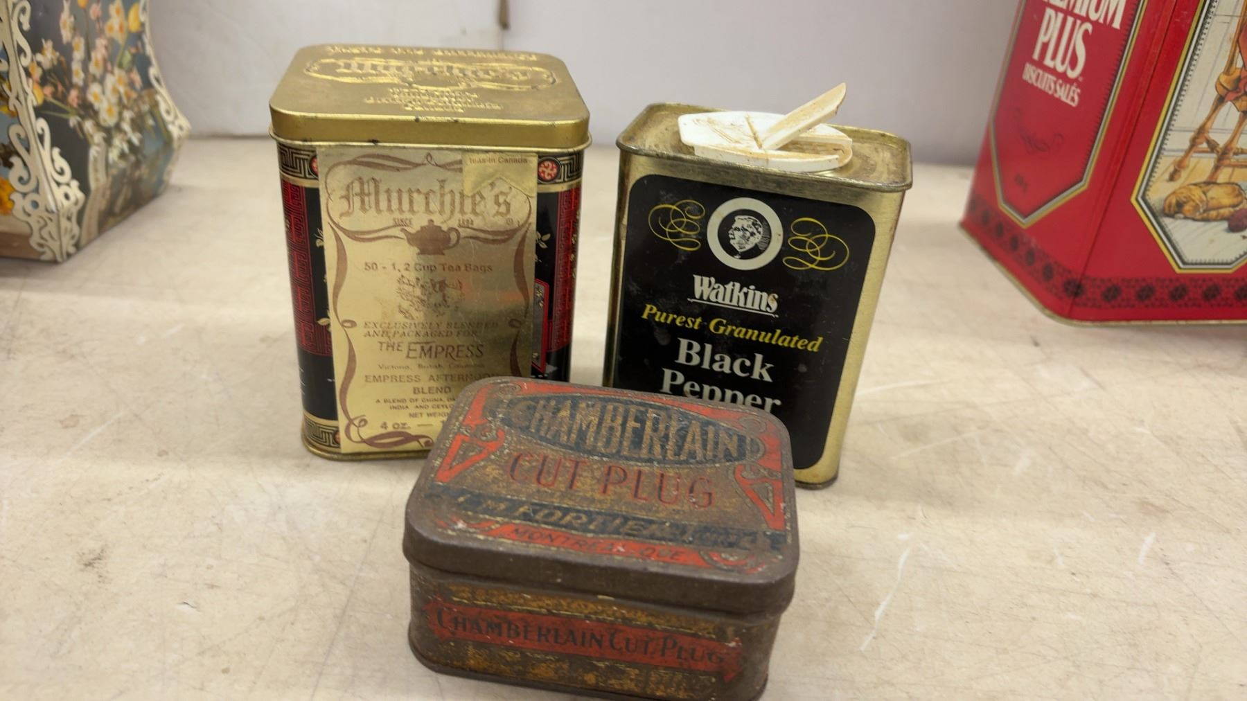 Lot 594 Collection of Vintage Advertising Tins Including Pepsi-Cola, Maxwell House, Ritz, Dominion Tobacco