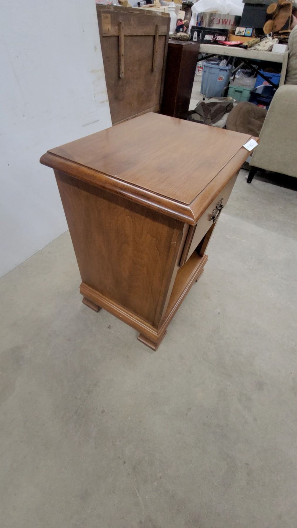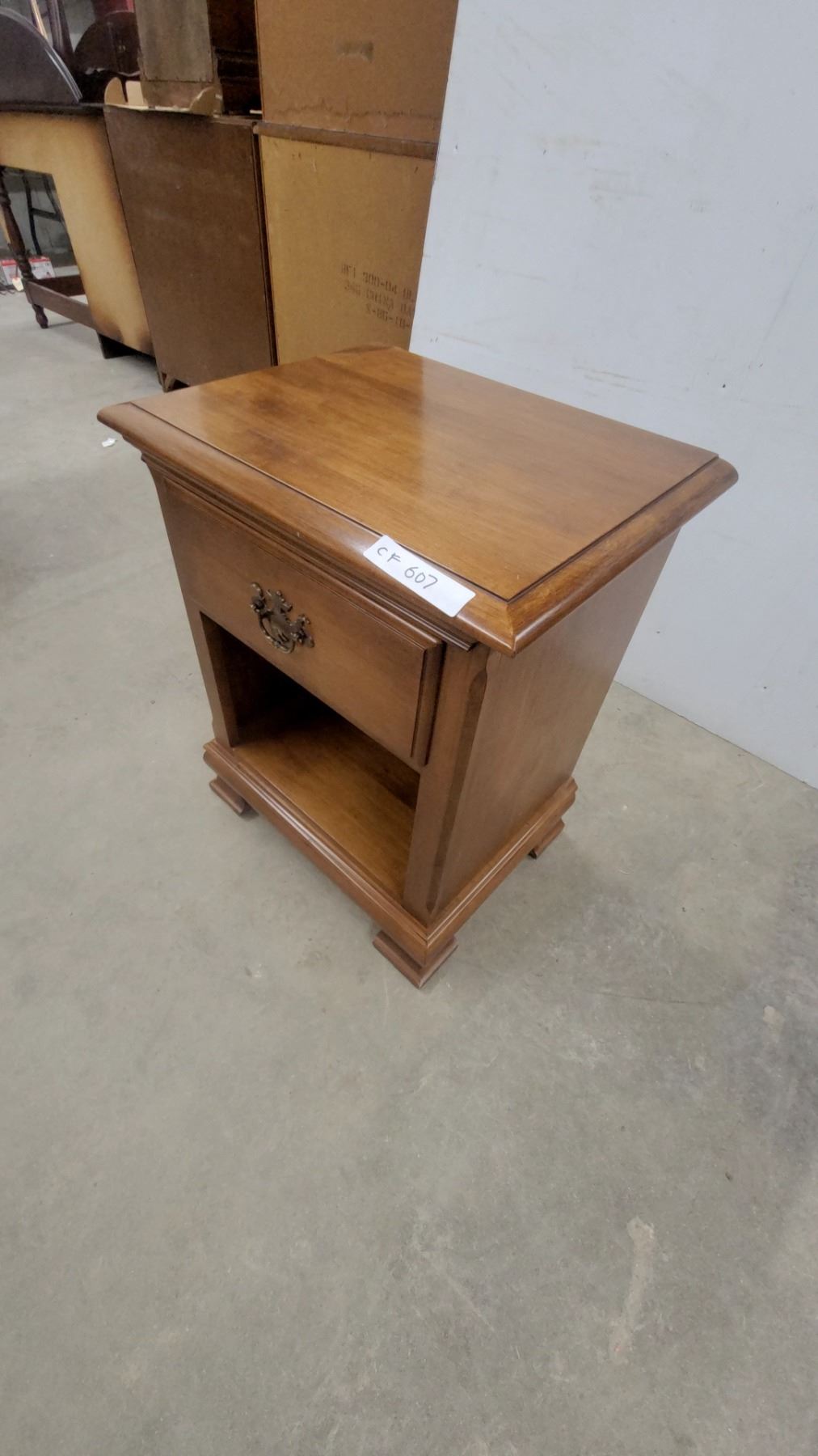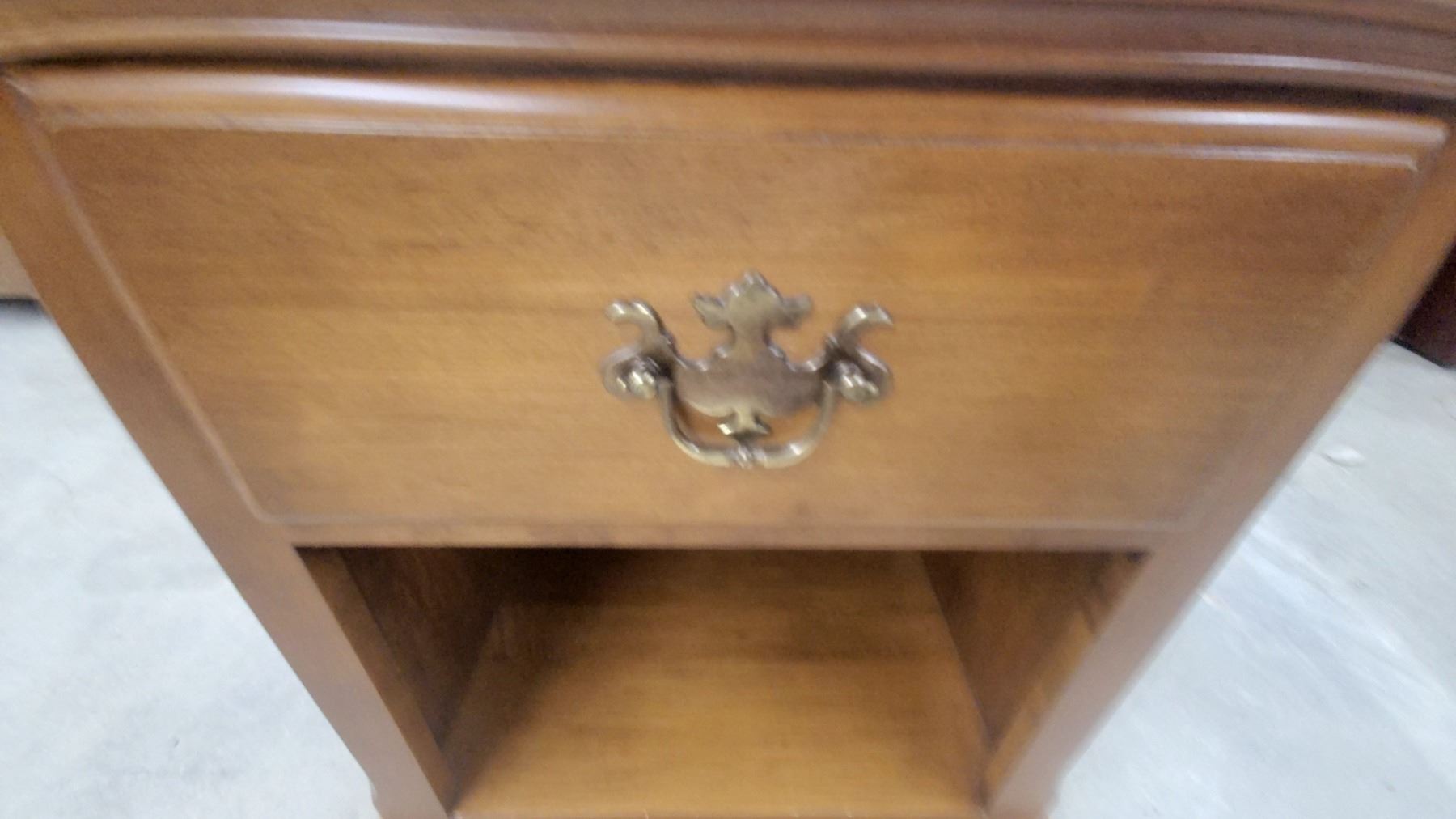 Lot 607 Wooden Nightstand with Single Drawer, Open Shelf, Brass Bail Pull Hardware, Bracket Feet 25"×20 x