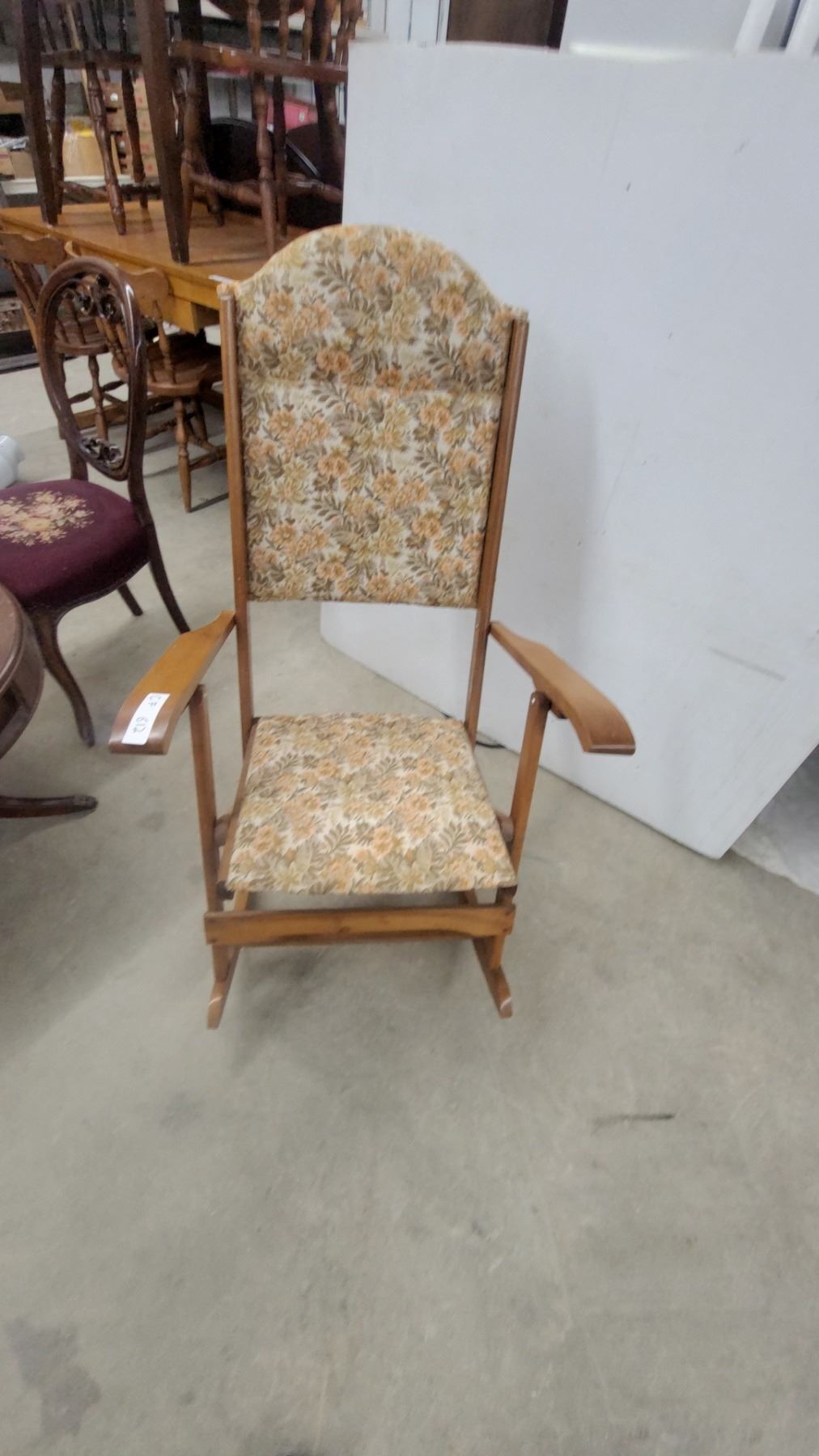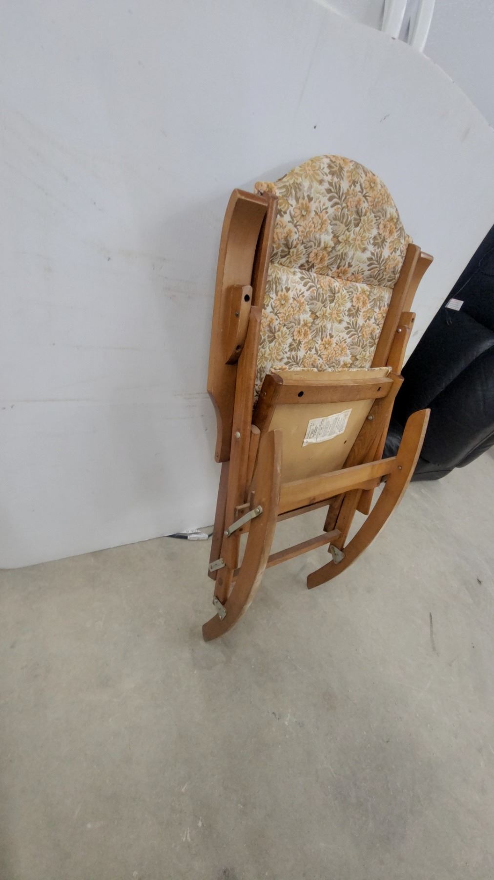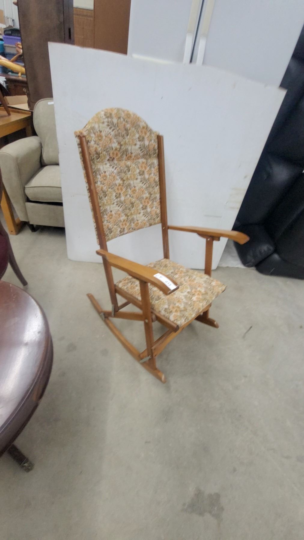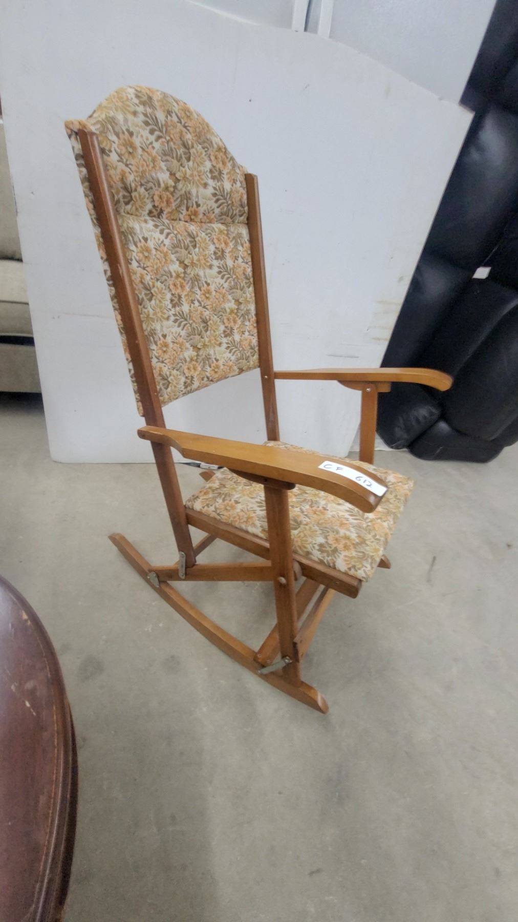 Lot 612 Wooden Folding Rocking Chair with Floral Upholstered Seat and Back, Curved Armrests