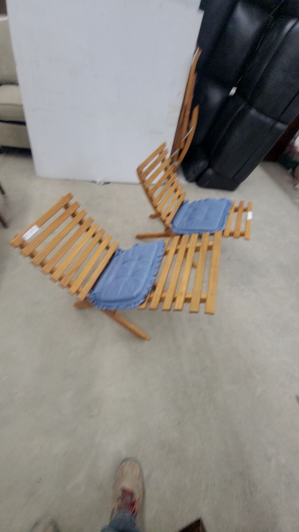 Lot 613 Wooden Slatted Folding Chair with Matching Ottoman and Blue Cushions 2x