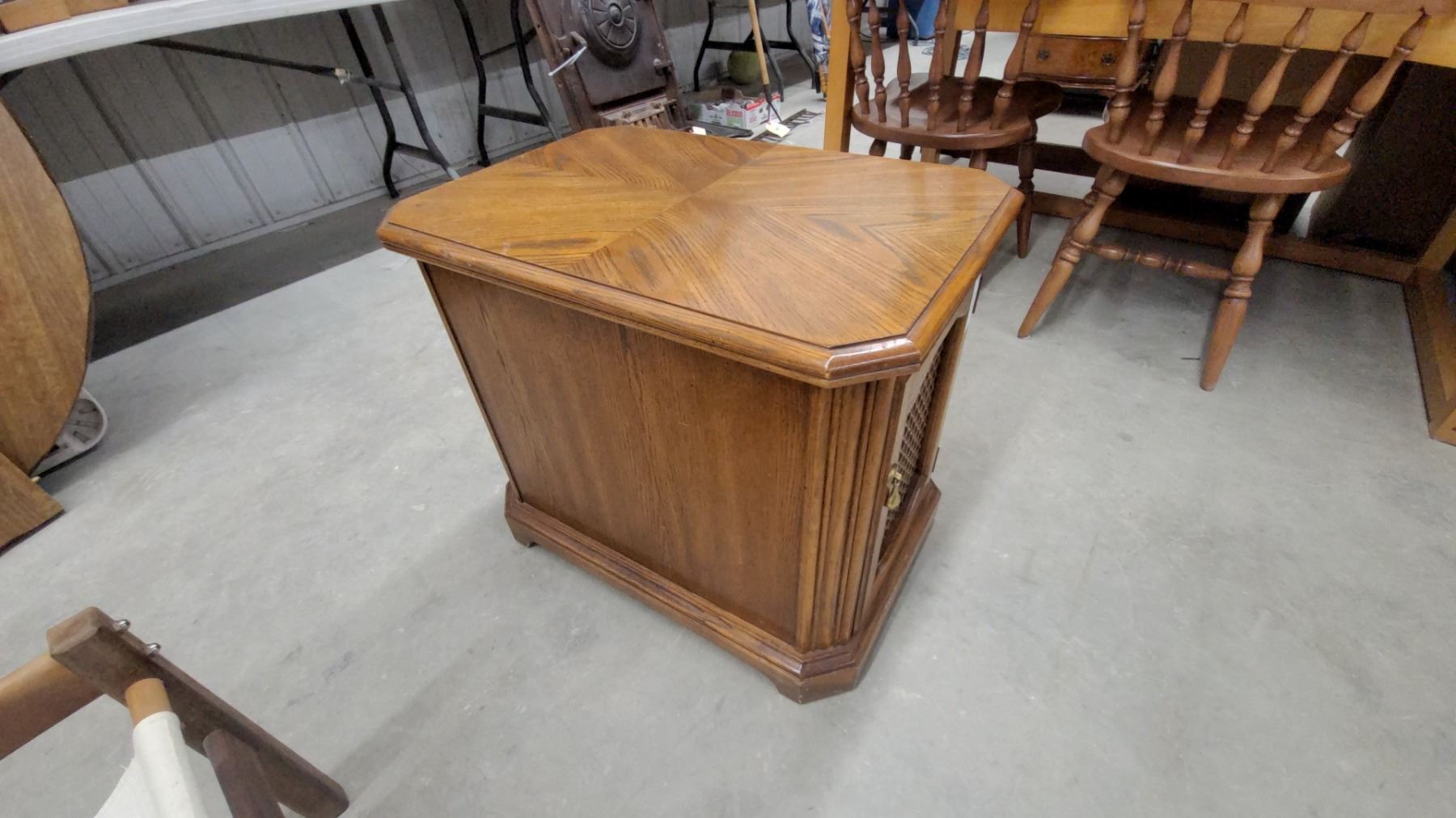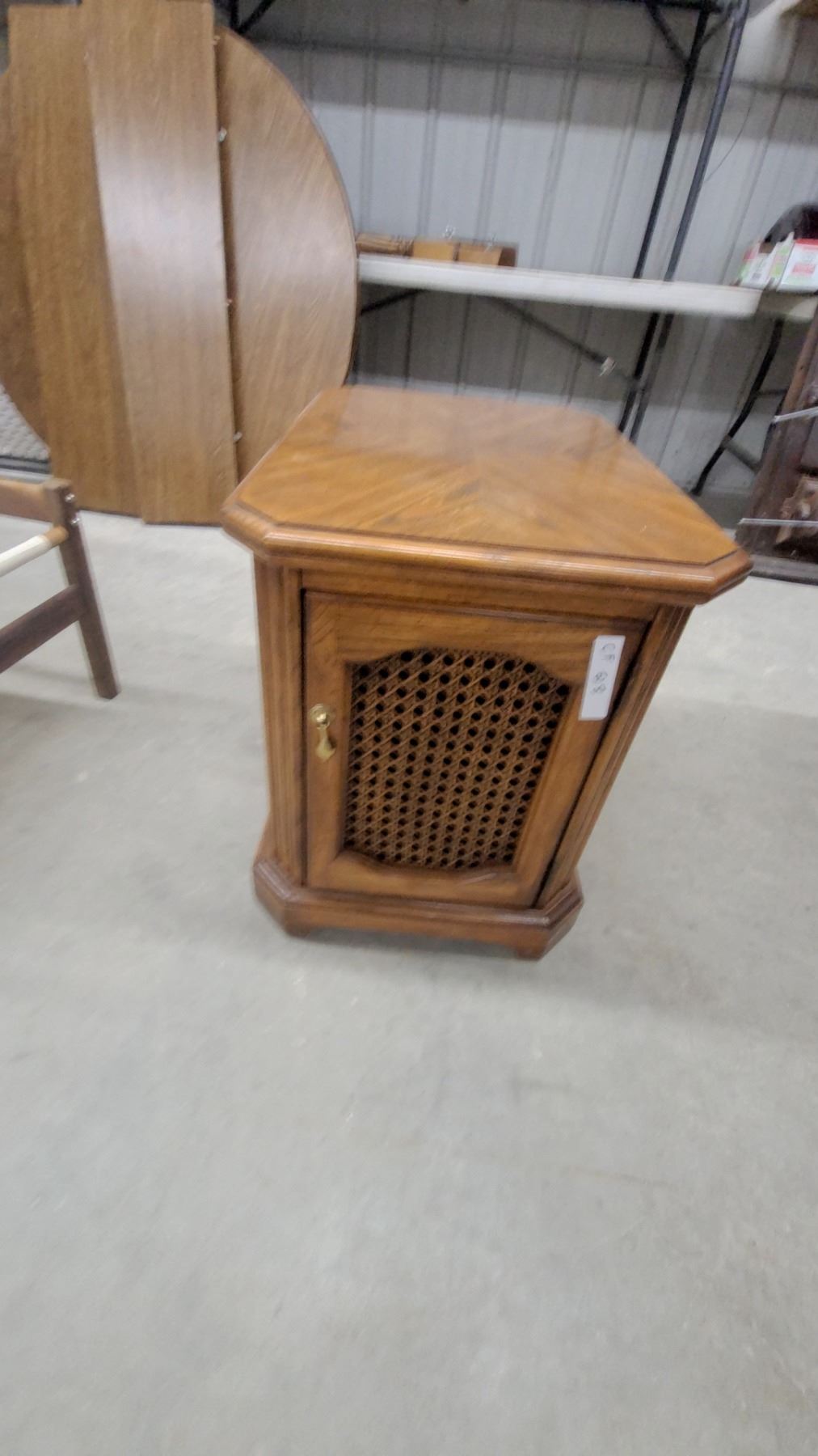 Lot 618 Oak End Table with Cane Door Panel and Brass Handle, Octagonal Top with Parquet Veneer Design 22 x