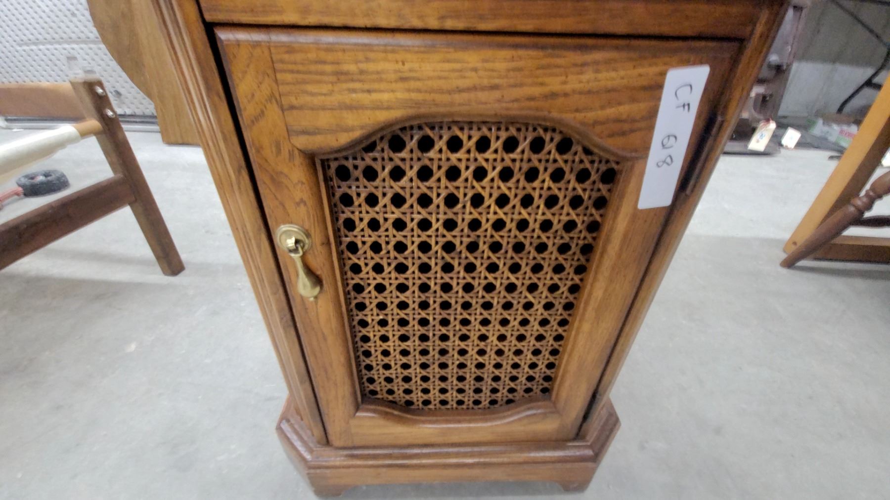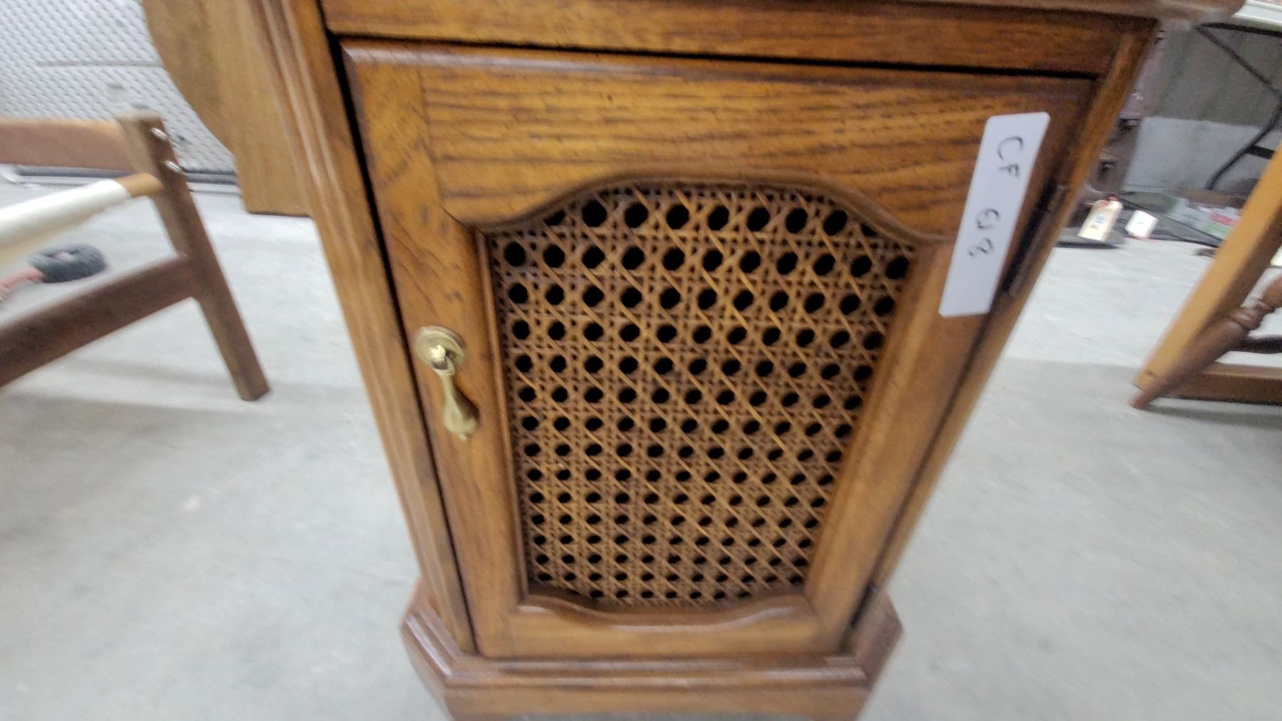 Oak End Table with Cane Door Panel and Brass Handle, Octagonal Top with Parquet Veneer Design 22 x 26 x 18"