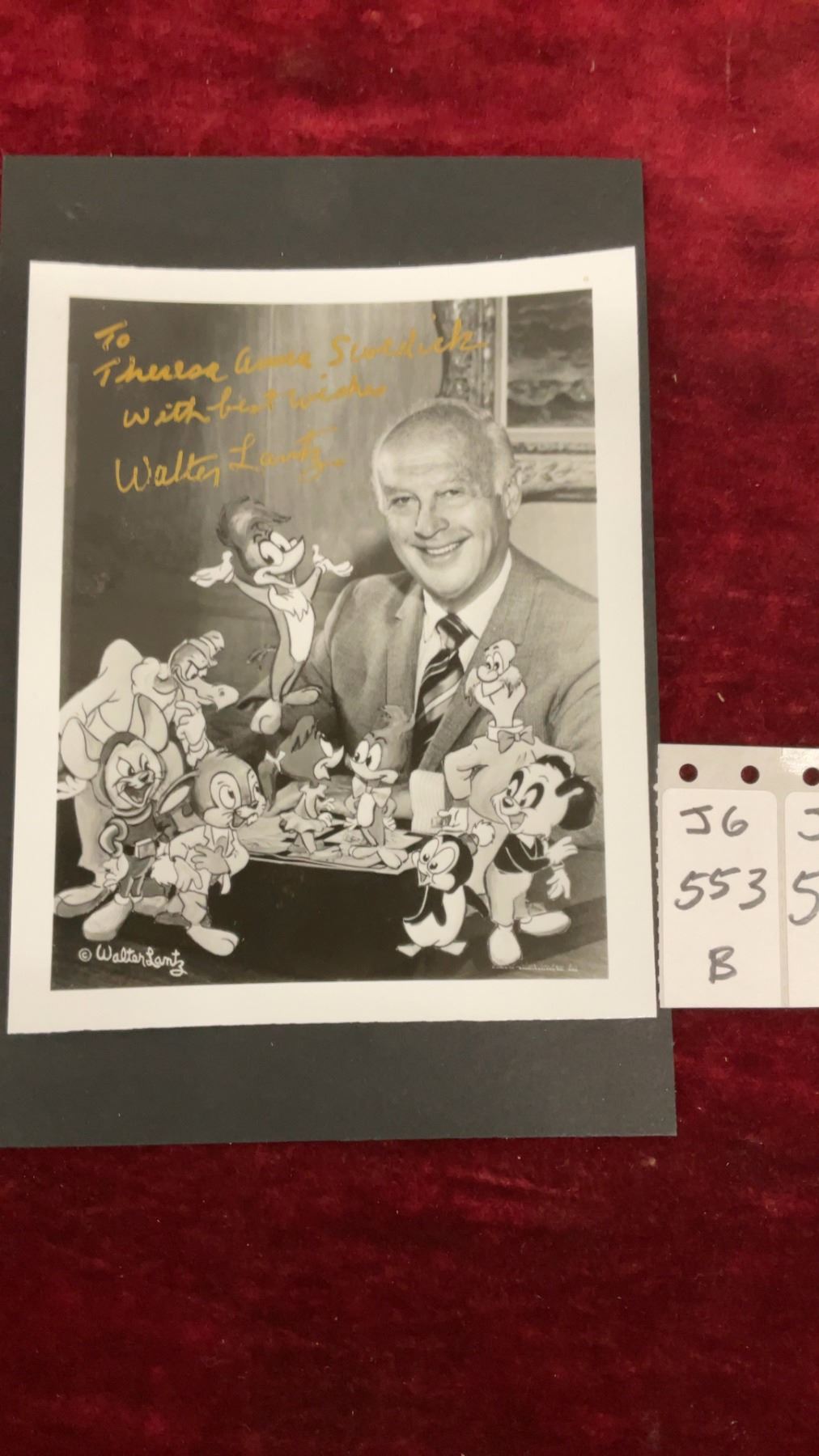 Lot 553B Walter Lantz Autographed Signed Photo with Cartoon Characters, 5 x 6.25"., Personalized to Theresa