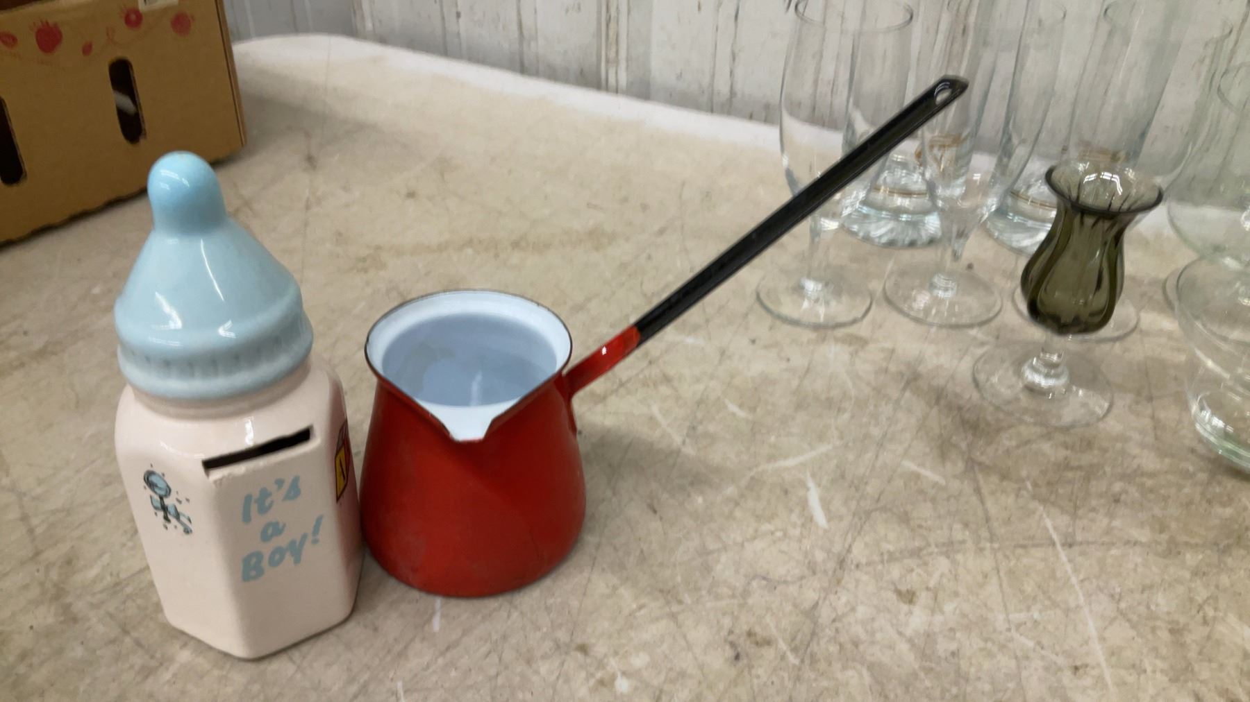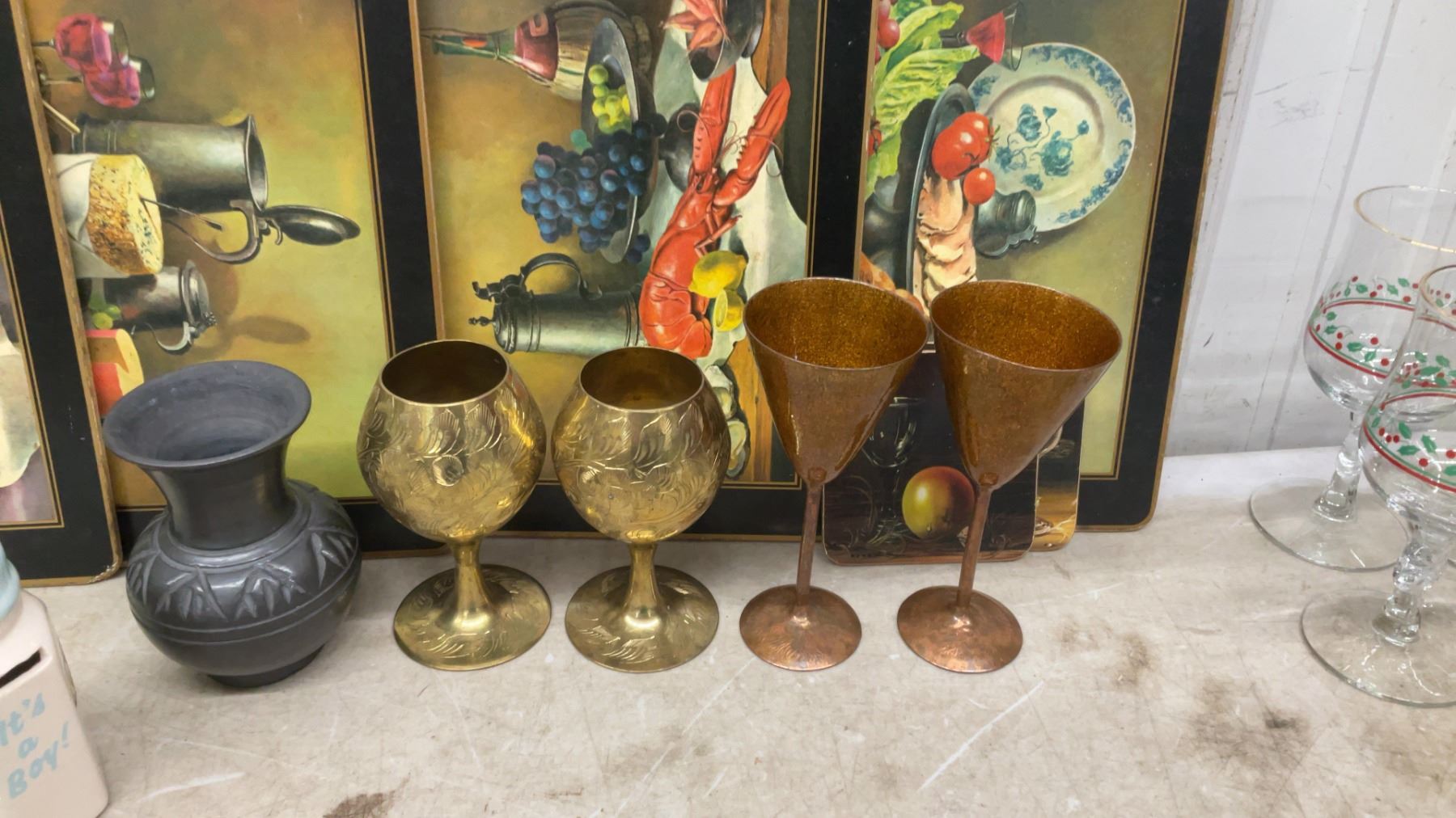 Lot 562 Vintage Glassware, Wine Glasses, Brass Goblets, Modern Dairies Blue Boy Ice-Cream Container and
