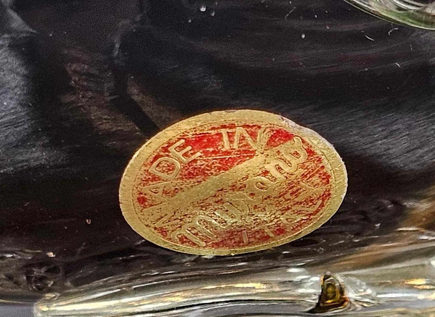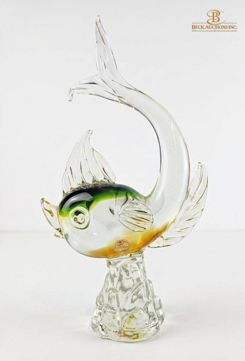 Murano glass fish figurine crafted with vibrant color accents of green, yellow, and clear glass. Measuring 11 inches in height, this piece stands on a textured glass base, capturing intricate detailing in the fins and tail. Featuring a ‘Made in Murano Italy’ label, it exemplifies authentic craftsmanship and artistry. A remarkable display piece for glass art collectors or home decor enthusiasts.