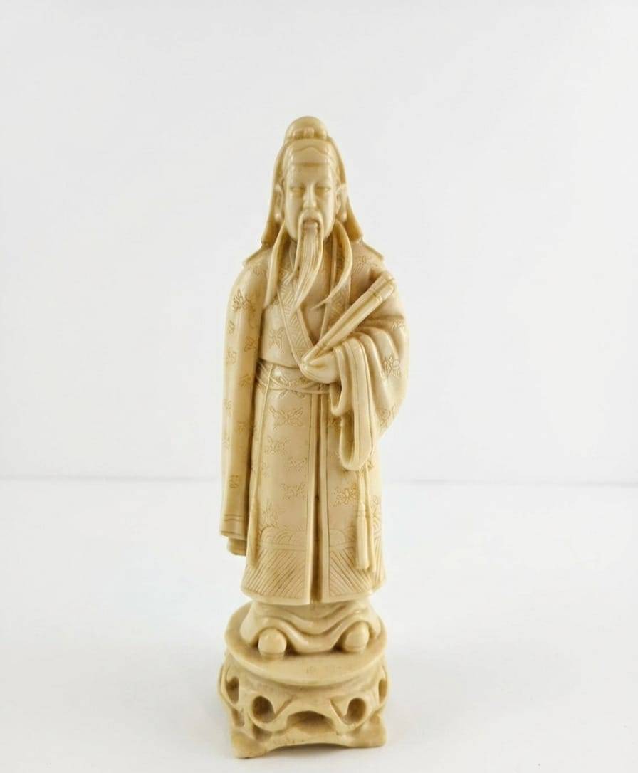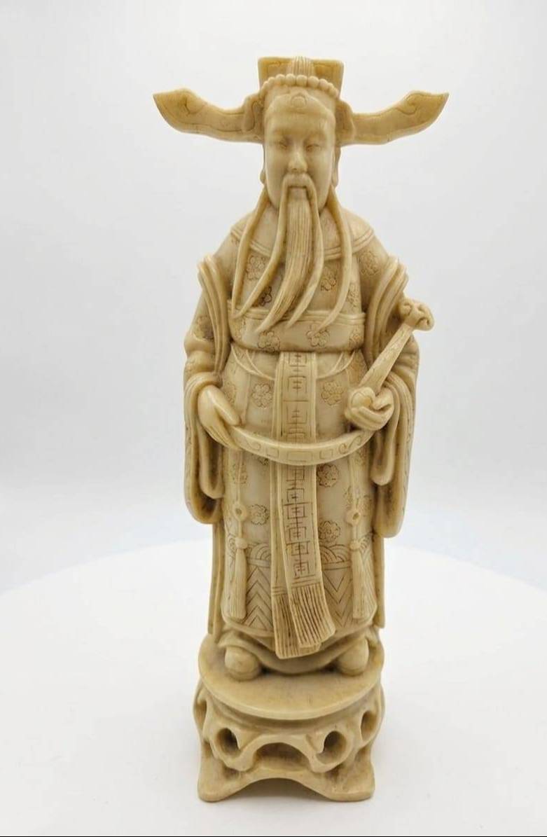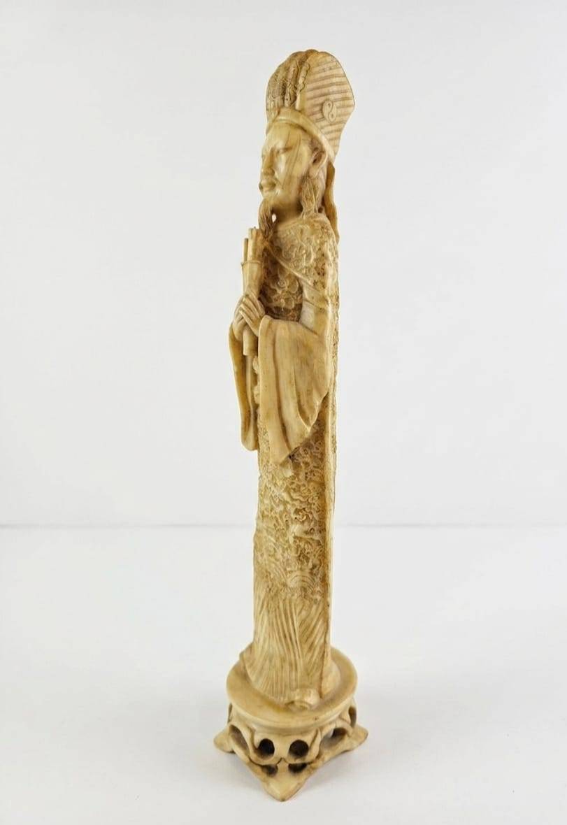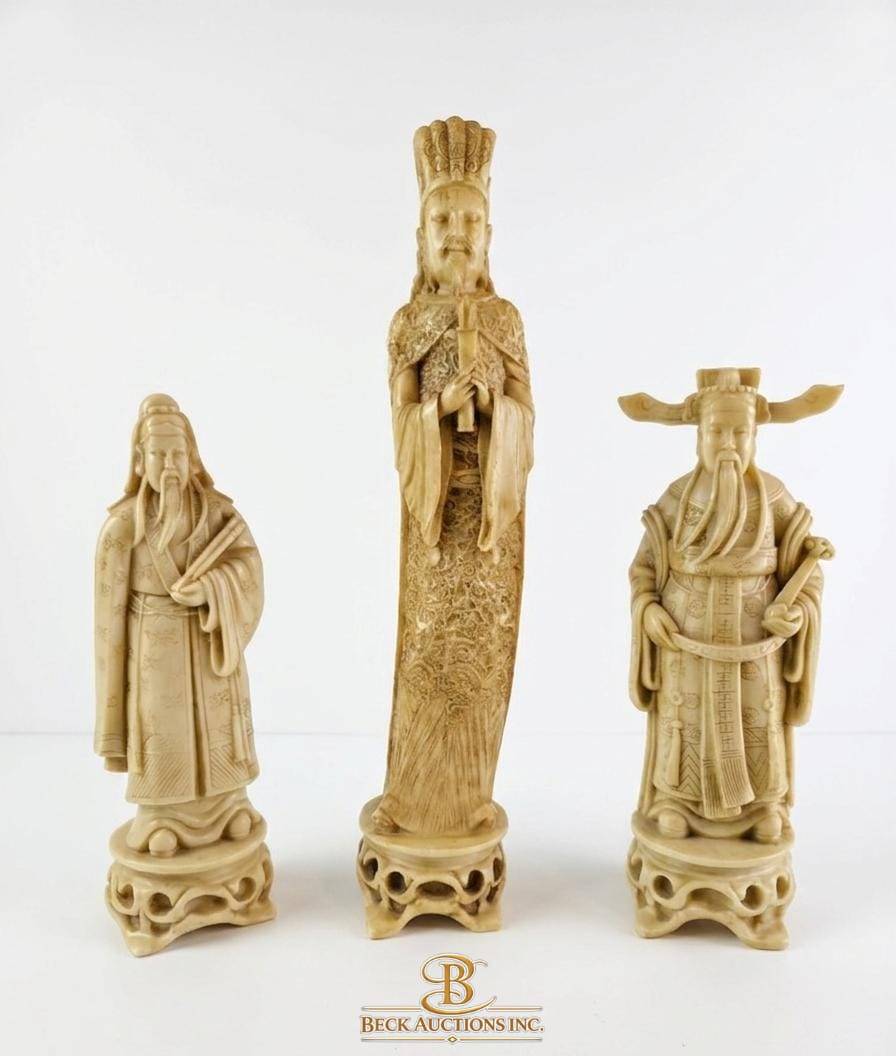 Three intricately crafted figurines with Chinese-inspired designs. The centerpiece figurine stands at 17 inches tall, flanked by two others measuring 11 inches each. These figurines showcase delicate details, elegant robes, and characteristic headpieces, all standing atop ornamental platforms. Perfect for display or as a collectible set.