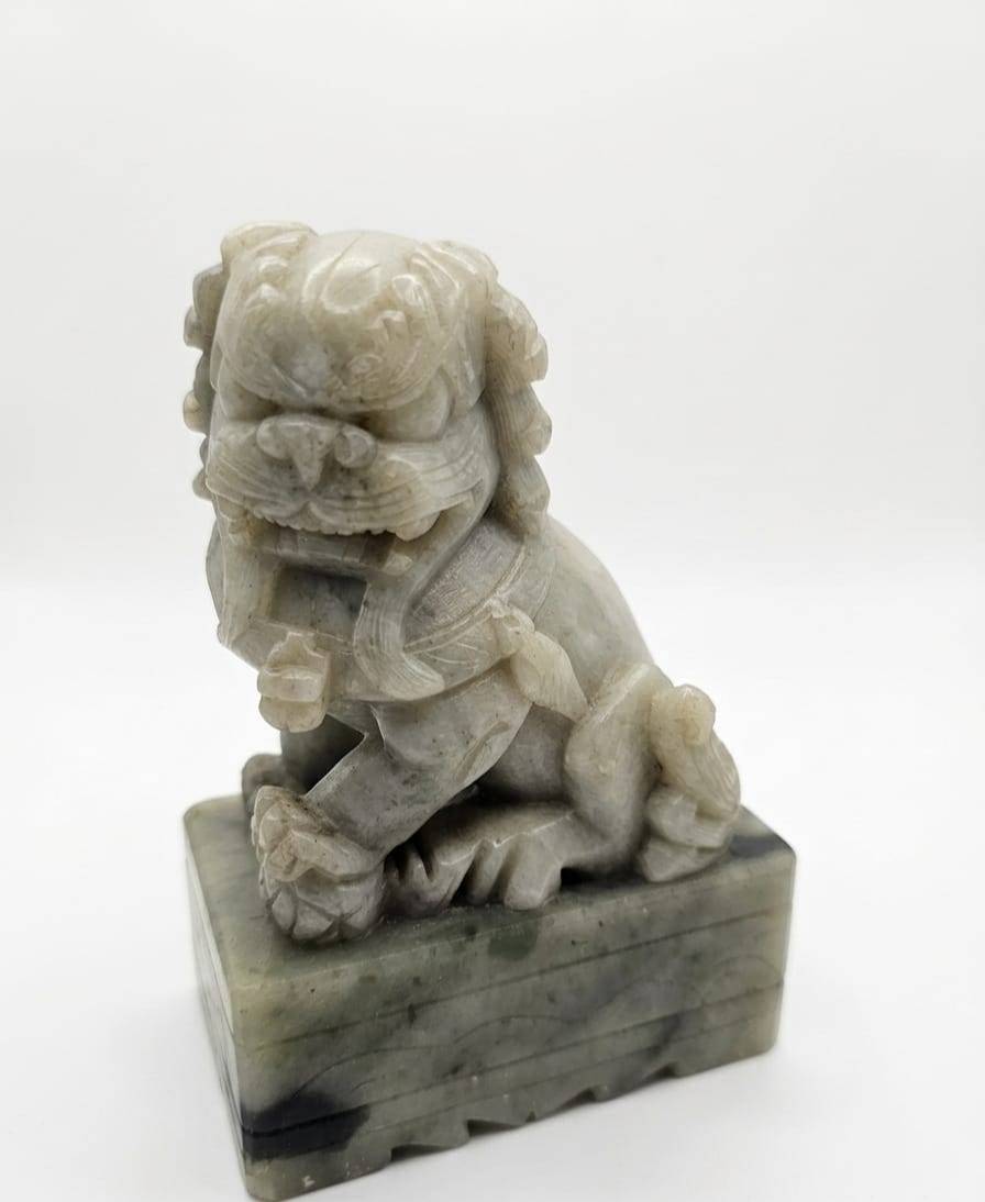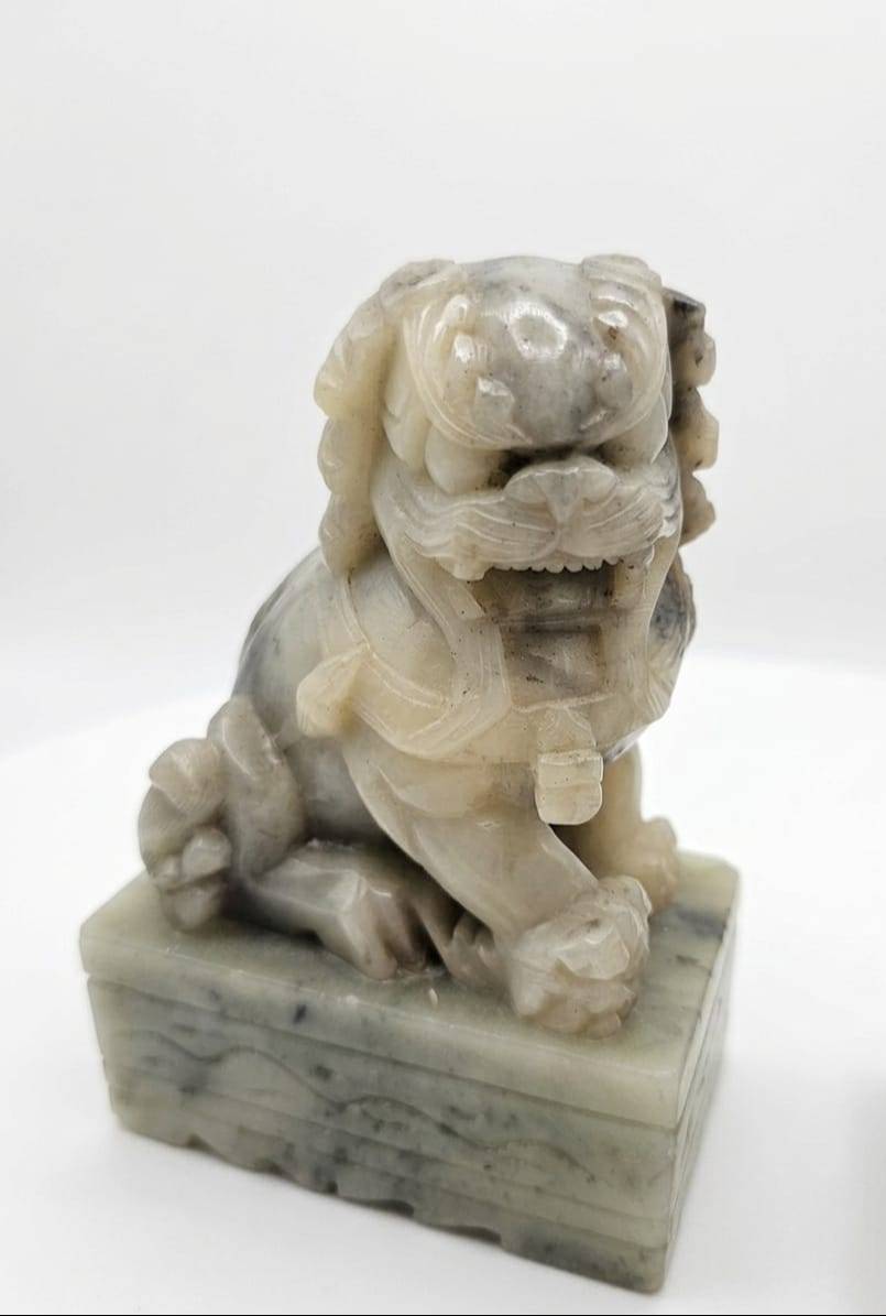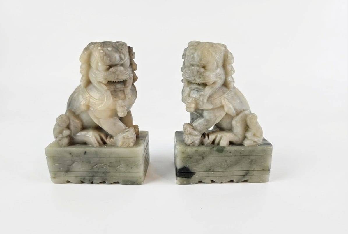 Intricately carved stone Foo Dog figures, standing at 5 inches tall each. These figures feature detailed craftsmanship, from their expressive faces to ornate fur details. Both statues are seated atop rectangular stone bases, making them ideal for display. Their solid construction and timeless design make them a unique addition to collections or decorative spaces.
