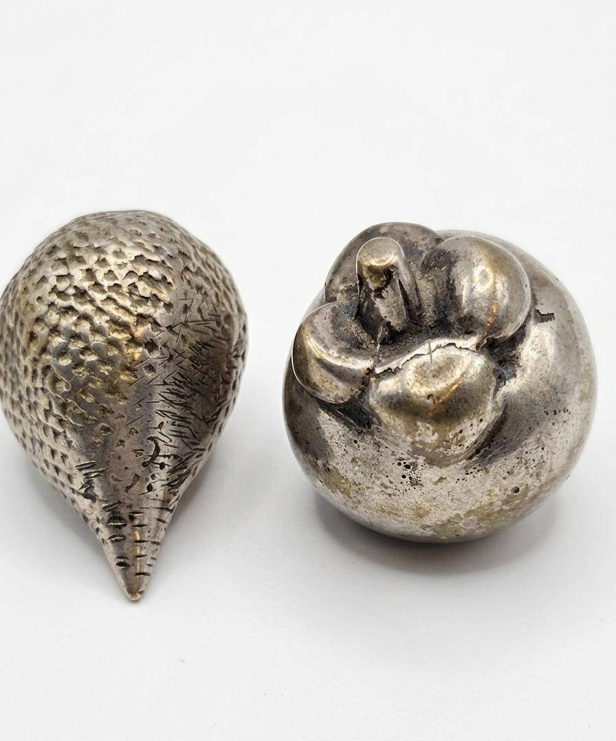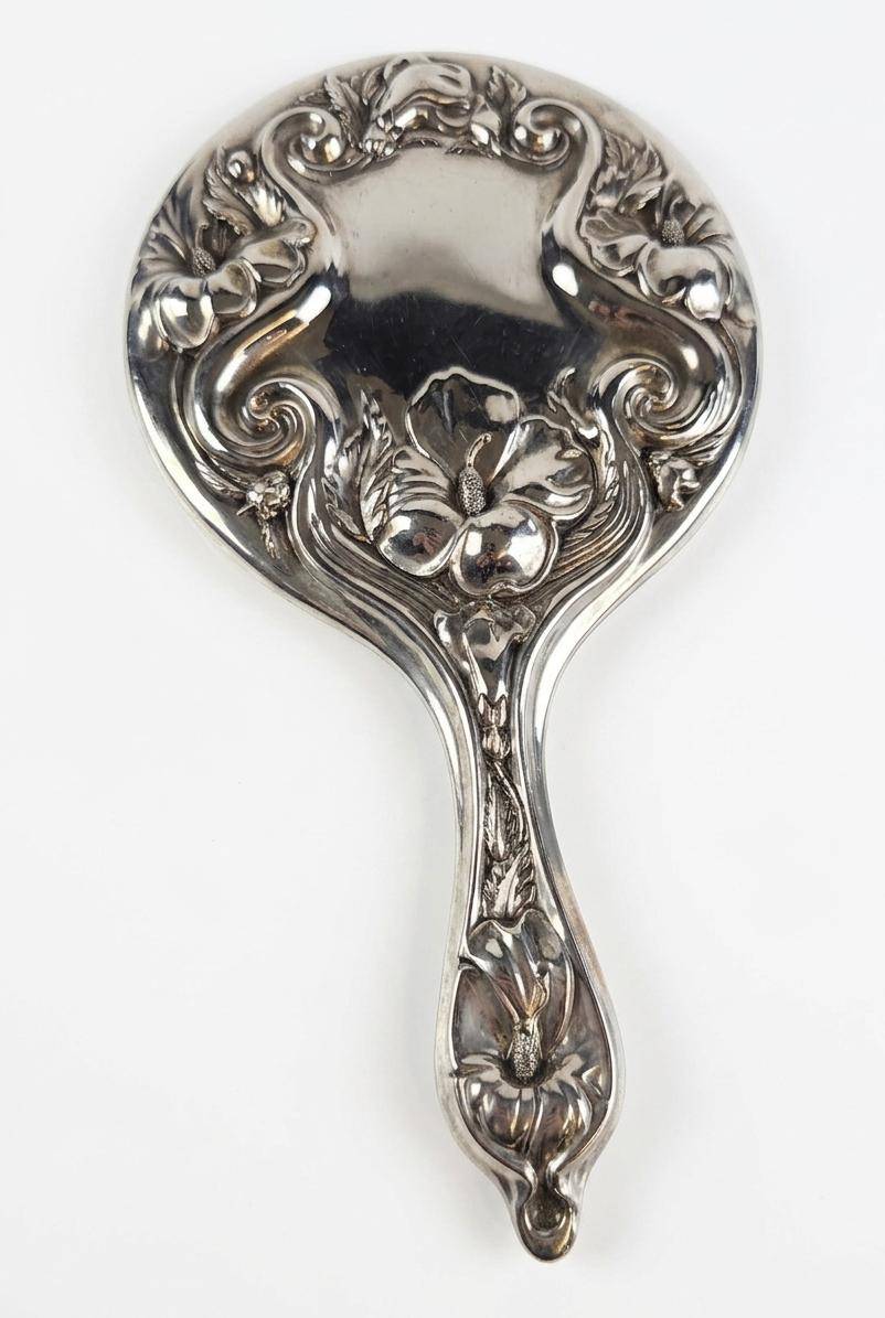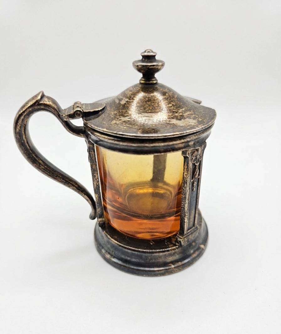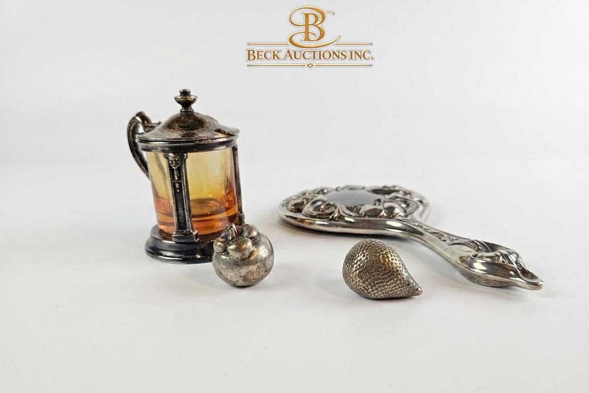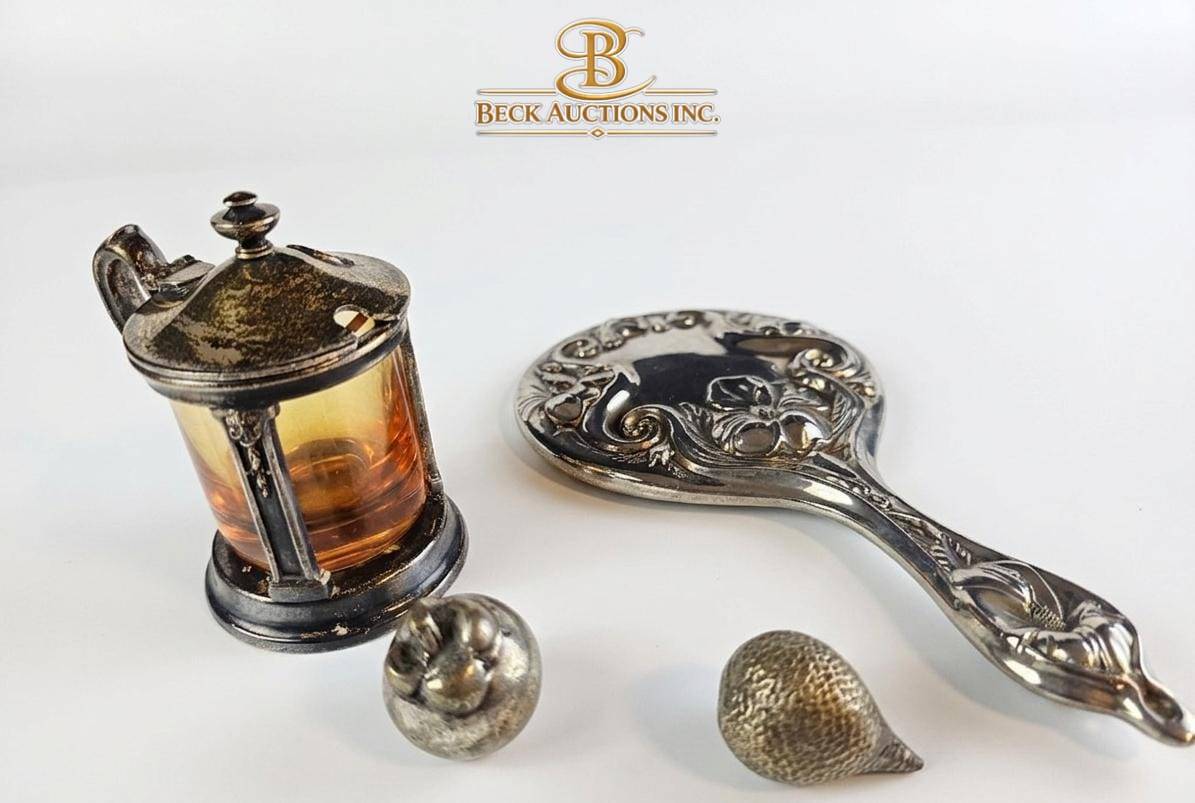 Decorative items, including a silver-toned lidded container with amber-colored glass, a handheld ornate mirror, a small apple-shaped object, and a shell-shaped piece. The container features a hinged lid, ornate handle, and translucent amber-colored sides. The Silver Plated mirror displays intricate floral and scrollwork designs. All items are in silver-toned metal and show a vintage aesthetic. Measurements: mirror approx. 8″ long, the container approx. 5″ tall. Condition exhibits mild tarnishing consistent with age.