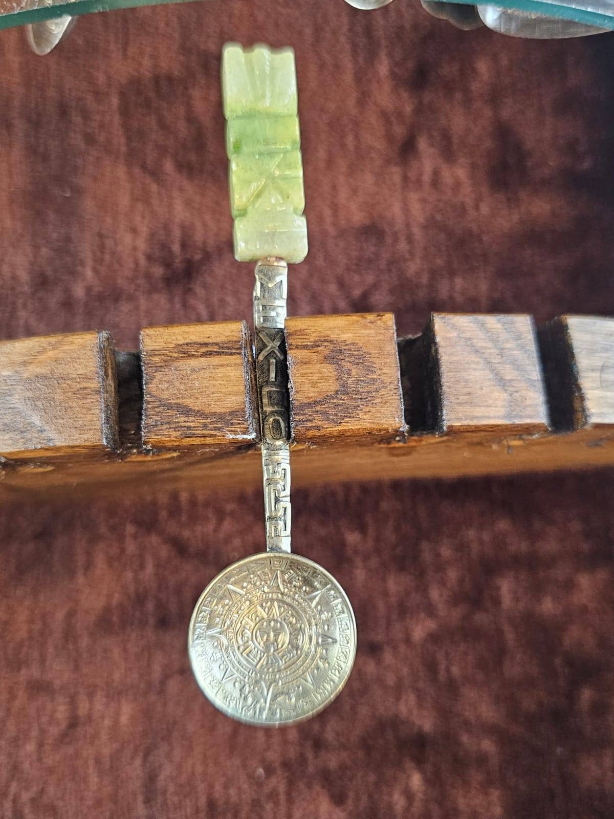 Curved glass display case with a total height of 20 inches, showcasing a collection of decorative, collectible spoons. The case is constructed of wood with three interior shelves and a curved glass front, offering an elegant presentation. Each shelf includes fitted slots, securely holding the unique spoons, many featuring engraved or sculpted designs, including crests and regional motifs.