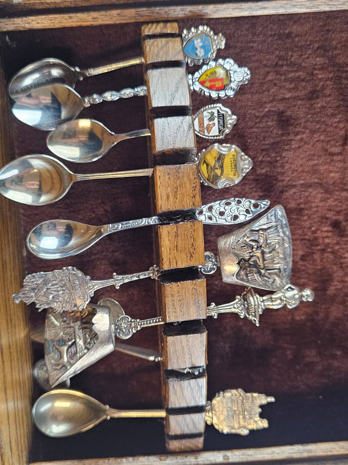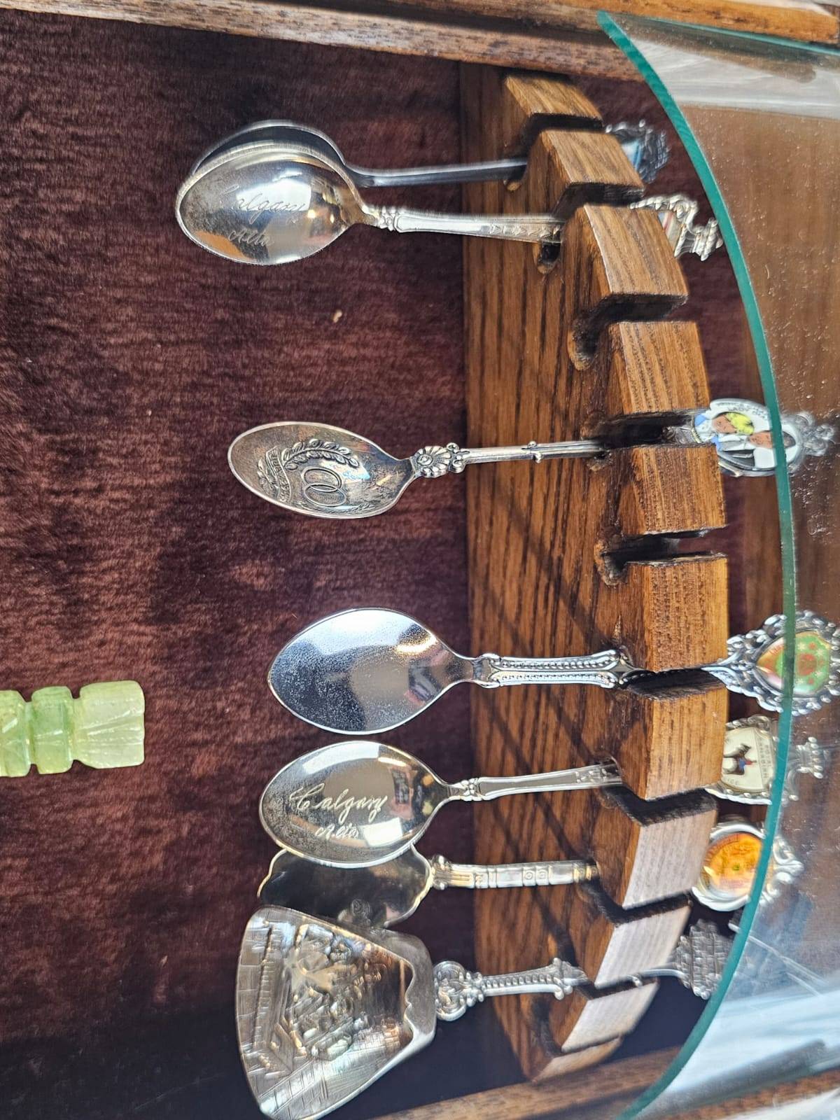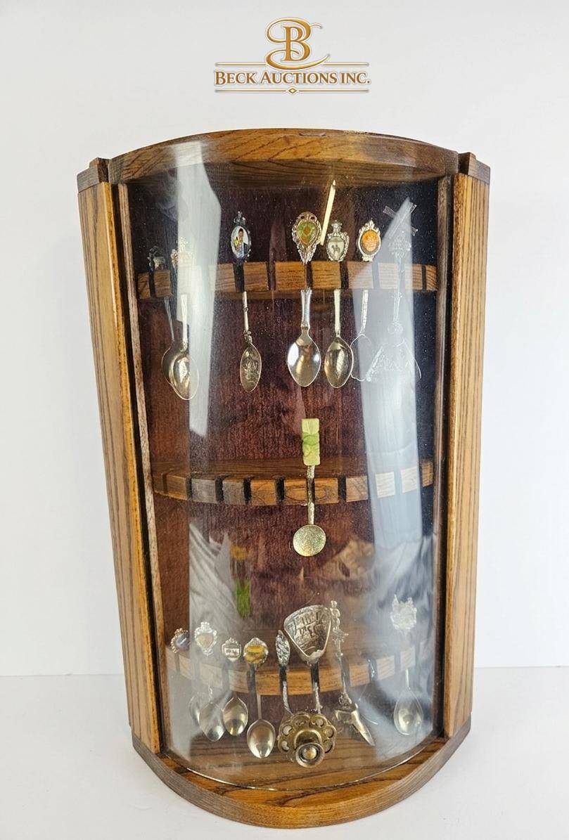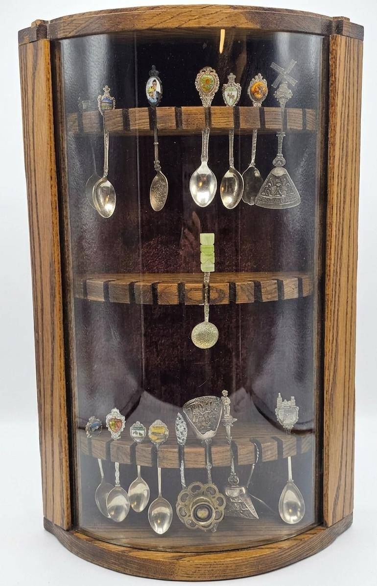 Lot 12 Curved Glass Display Case with 20 Commemorative Spoons
