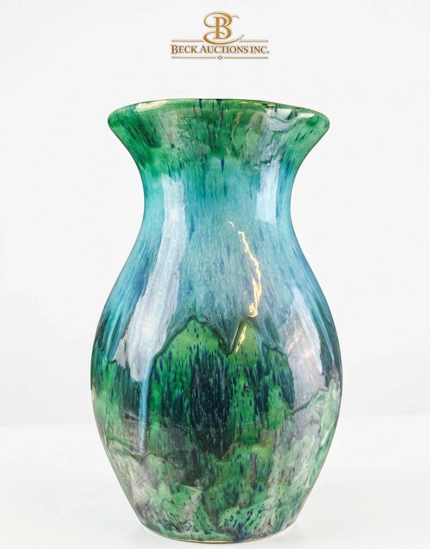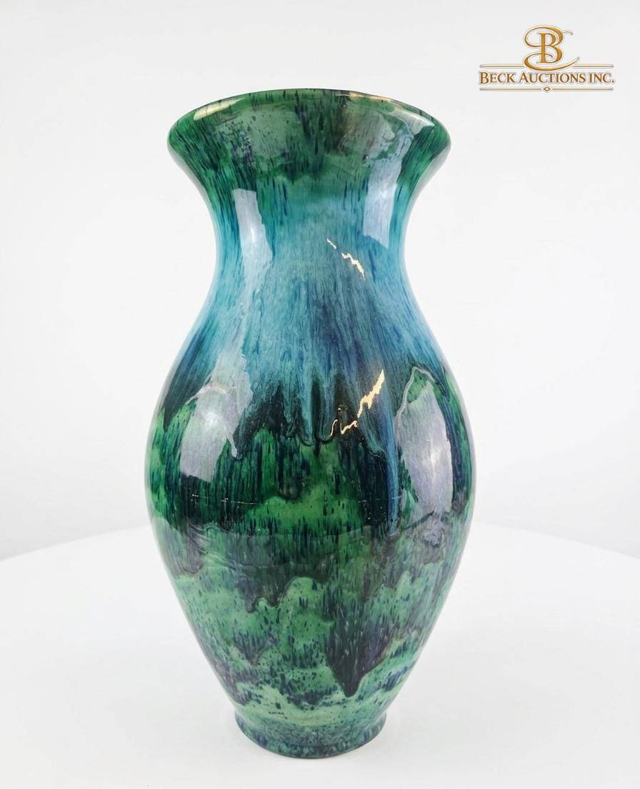 Elegant handcrafted ceramic vase featuring a vibrant green and blue glaze with a high-gloss finish. Measuring approximately 20 inches in height, this vase showcases an artistic blend of colors and textures, perfect for displaying floral arrangements or serving as a decorative focal point. In overall good condition with minor surface wear consistent with age and use.