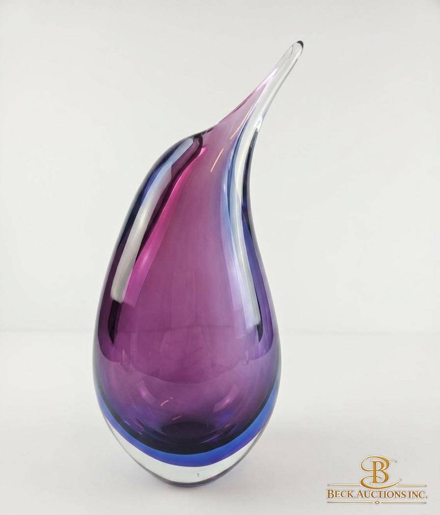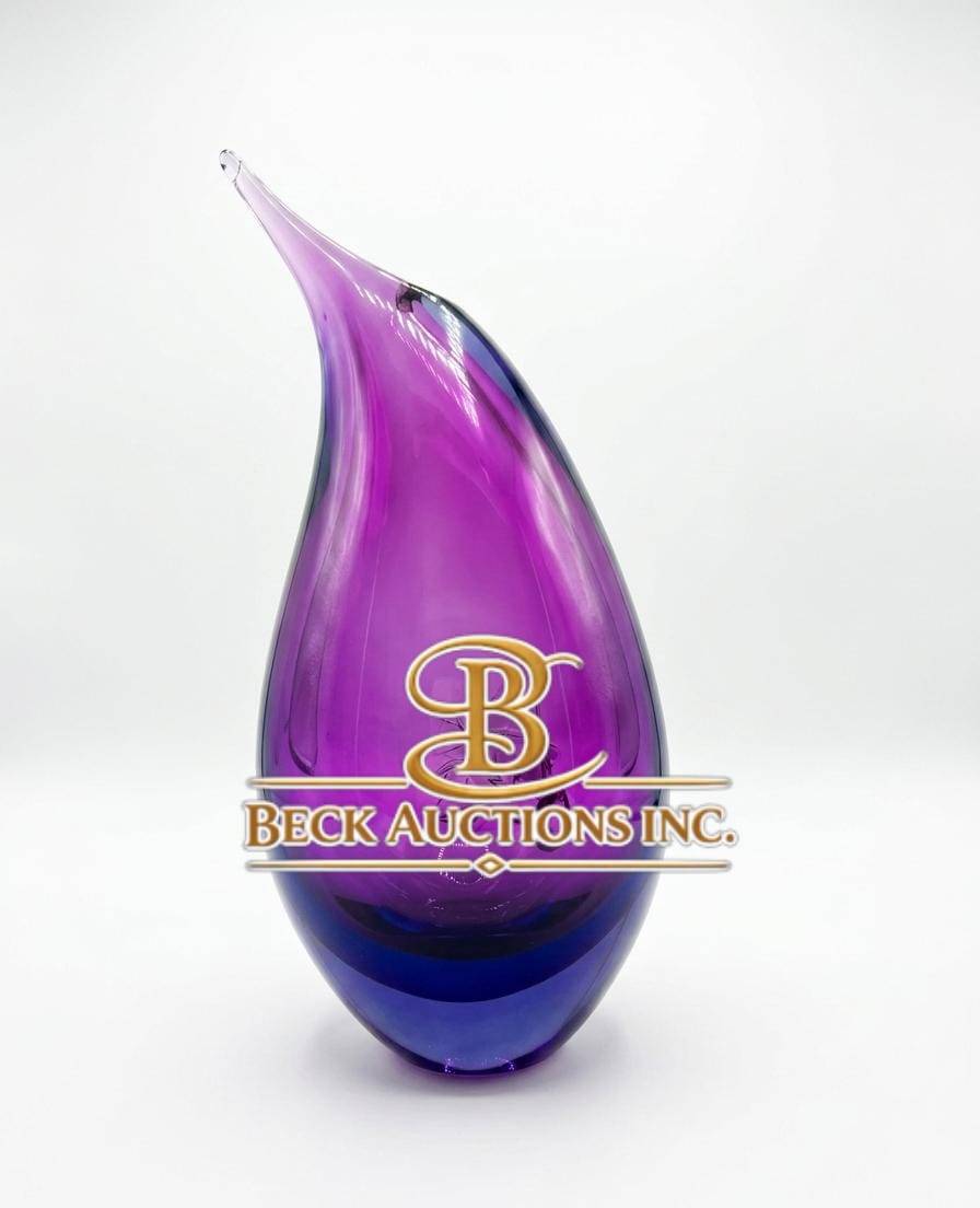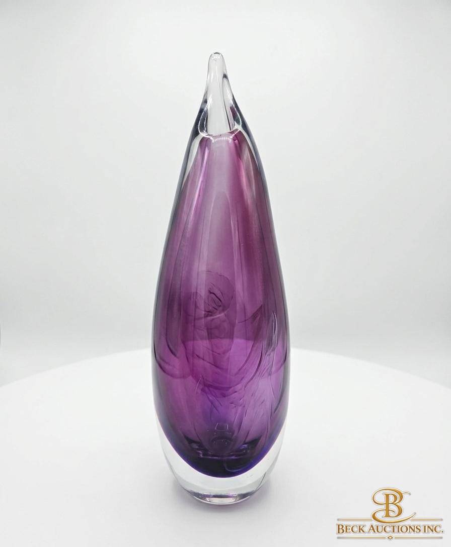 A stunning handblown glass sculpture featuring a gradient purple design that transitions beautifully throughout its tall, teardrop-shaped form. Skillfully crafted with a graceful pointed tip and a smooth, polished surface. Standing at an impressive 15 inches in height, this piece makes an excellent addition to any art glass collection or as a centerpiece for display.