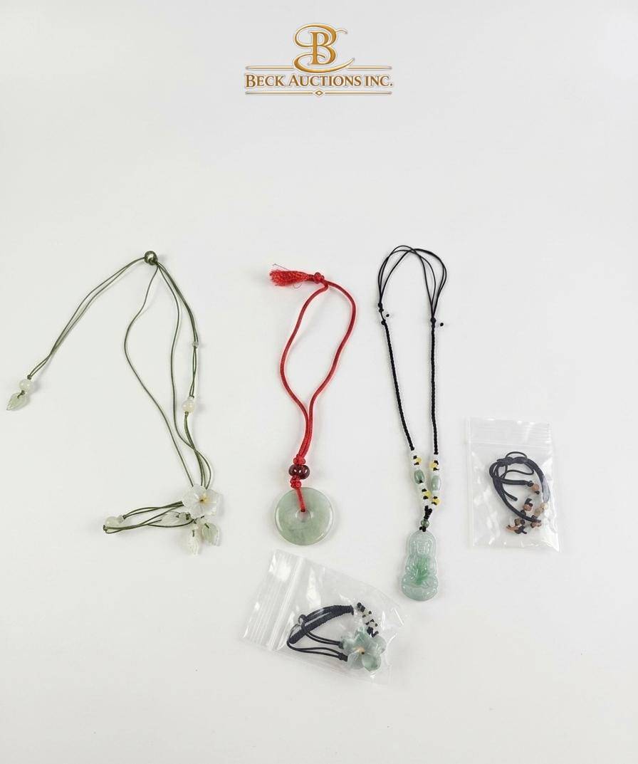 Five jade and cord necklaces featuring diverse designs and colors. Includes a multilayer green cord necklace with floral jade accents, a red cord with a jade circle pendant, a black cord with a carved jade figure, and two smaller jade charms in separate packets. Perfect for showcasing unique craftsmanship. Dimensions and sizes vary per piece in this diverse set.