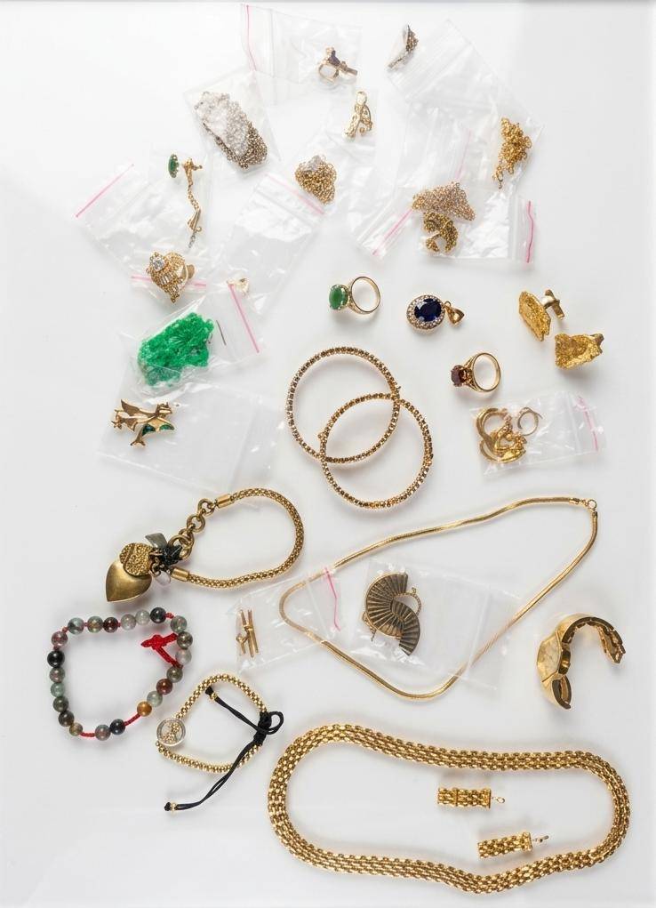 This collection features a varied selection of gold-tone jewelry, including necklaces, bracelets, earrings, pendants, rings, and a wristwatch. Notable pieces include a hexagonal watch with a white dial, a bold link necklace (approx. 22 inches long), a fan-shaped pendant set, and a charm bracelet. The jewelry comes in individual protective bags for safekeeping. Measurements vary across pieces, offering different styles for diverse occasions.