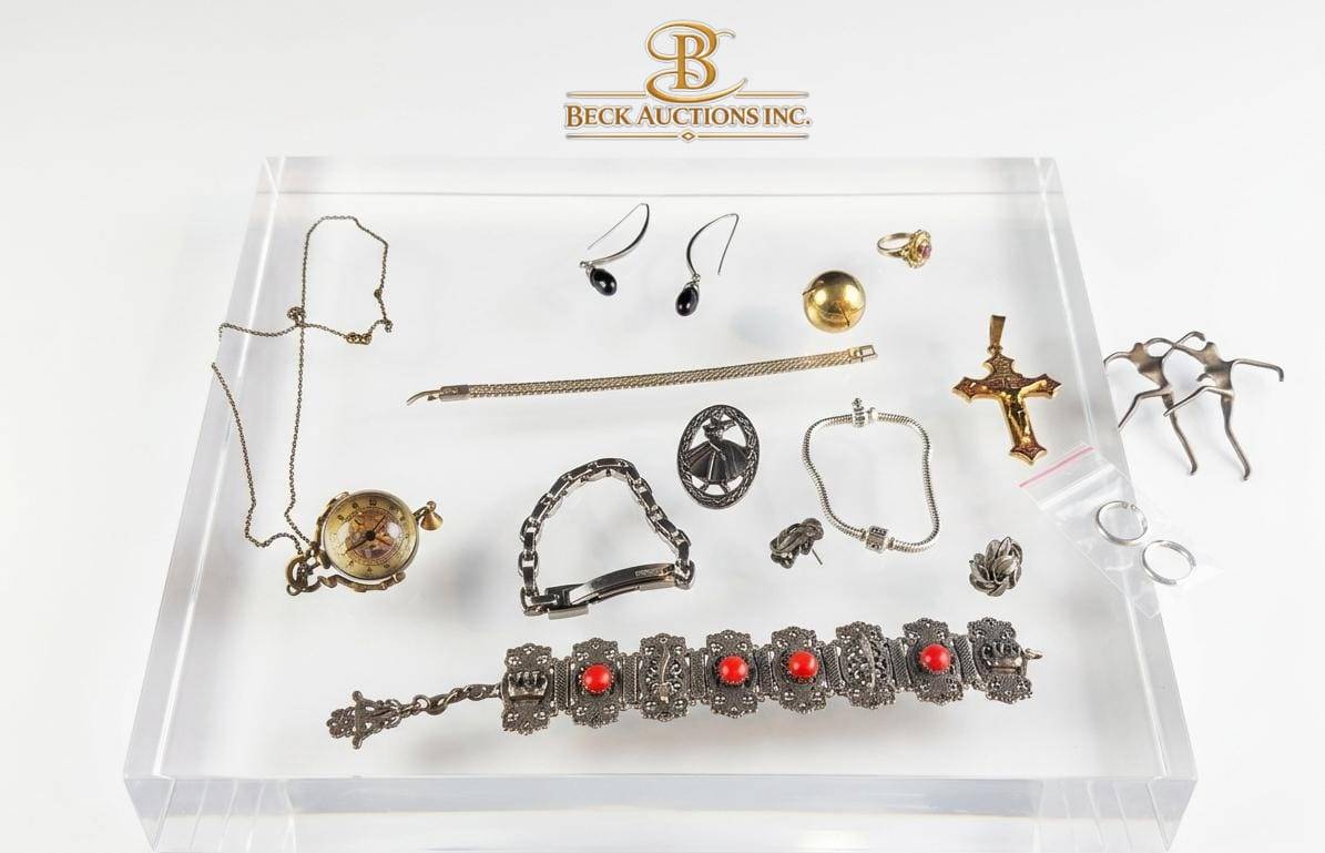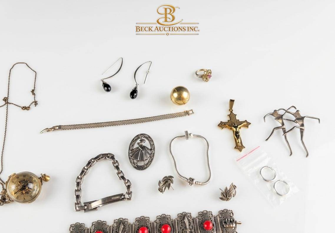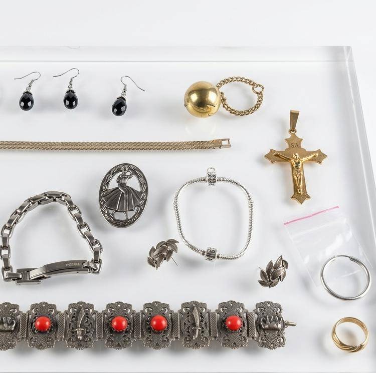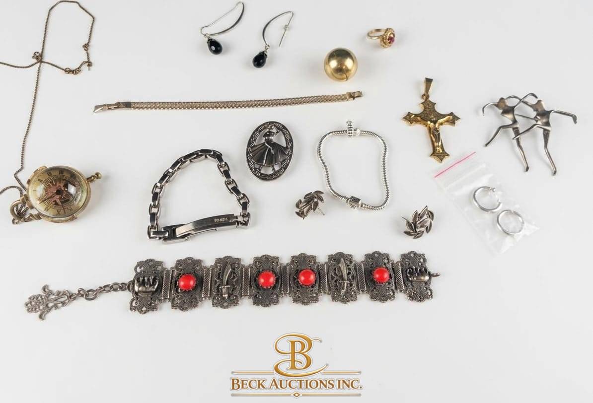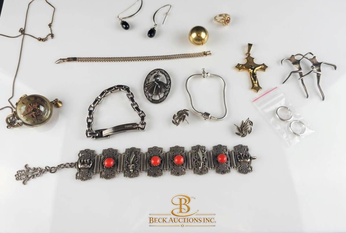 This diverse collection features a variety of vintage and modern jewelry items. Highlights include a pocket watch with visible mechanics (approximately 1.75″ in diameter), a bracelet adorned with red enamel accents (7.5″ in length), a gold-tone cross pendant (2″ in height), and assorted earrings, necklaces, and rings. The items offer a range of styles, including intricate designs and clean-lined pieces. This curated set is ideal for collectors or those seeking signature pieces.