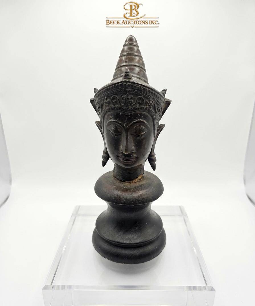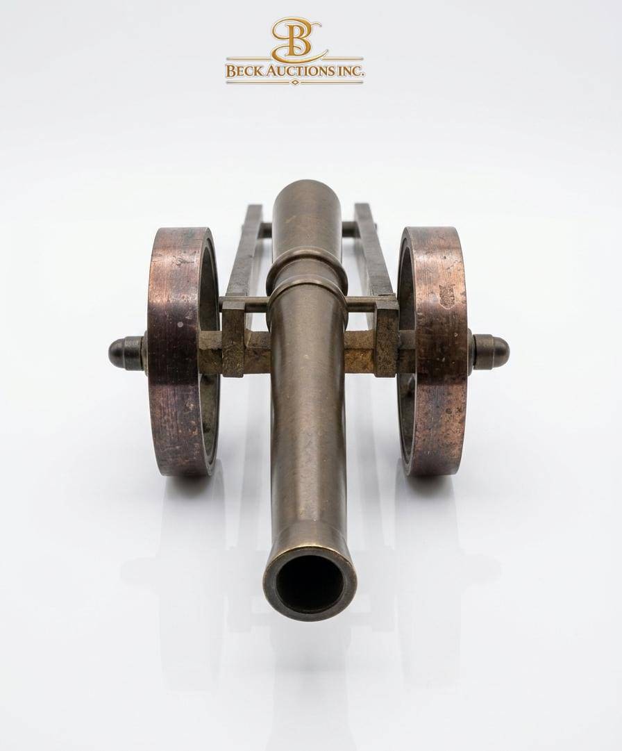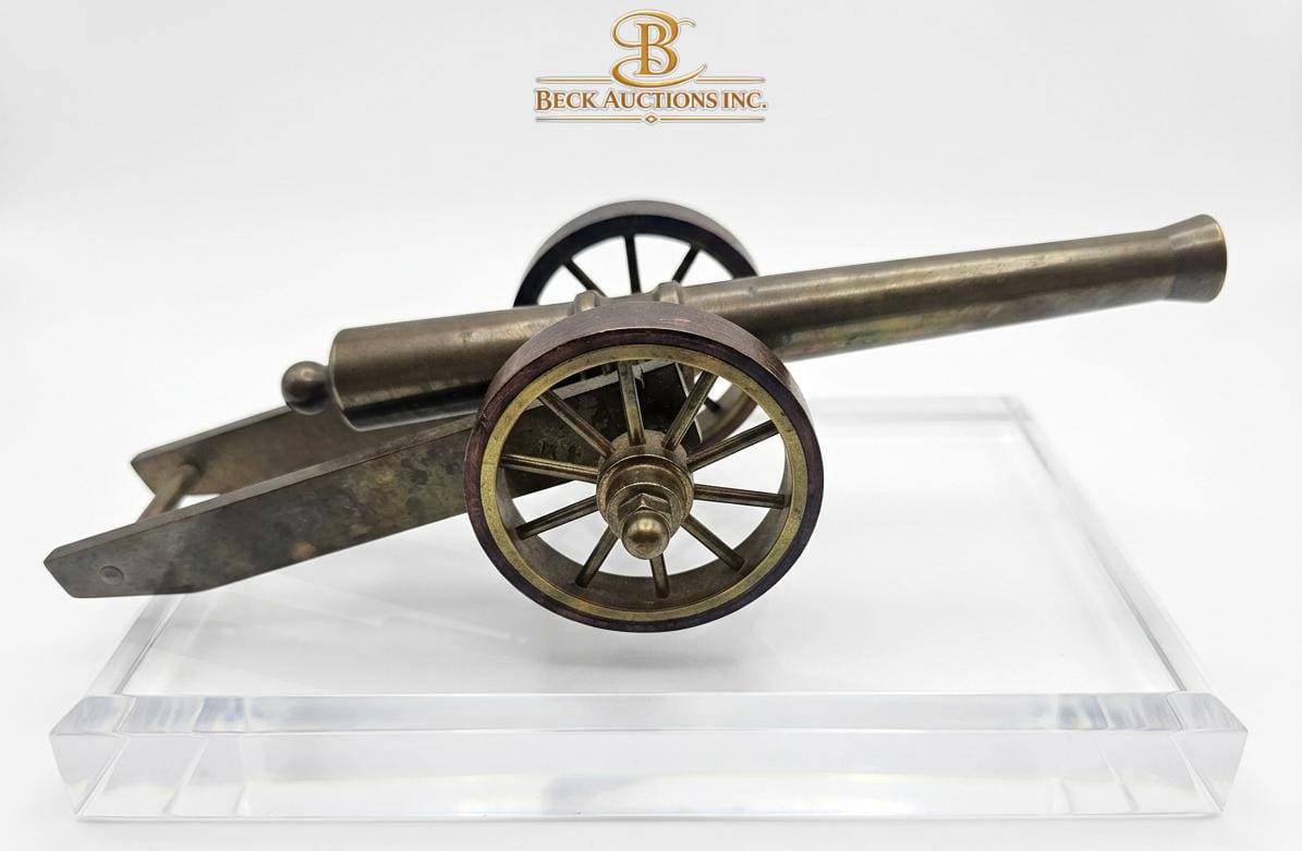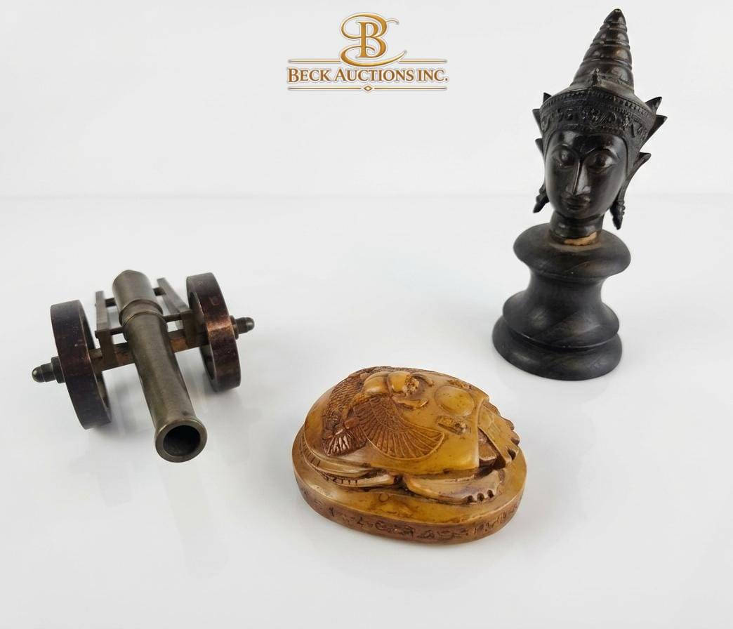 Lot 32 Three Decorative Items: Brass Cannon, Carved Box, and Bust Figurine