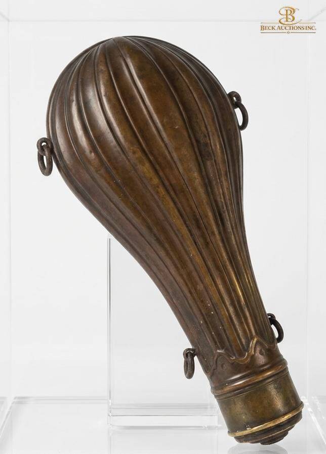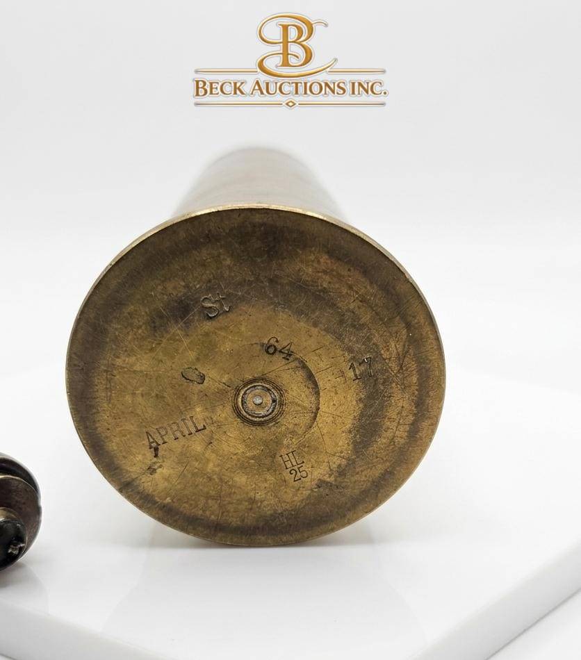 This lot features a brass trench art shell casing and an intricately crafted powder flask. The shell casing, measuring approximately 11 inches in height with a diameter of 3.5 inches at the base, includes embossed details and markings like ‘April H25 64.’ The powder flask showcases a ribbed structure and measures about 10 inches in length and 4.5 inches at its widest point. Together, these items reflect historical craftsmanship and wartime artistry.