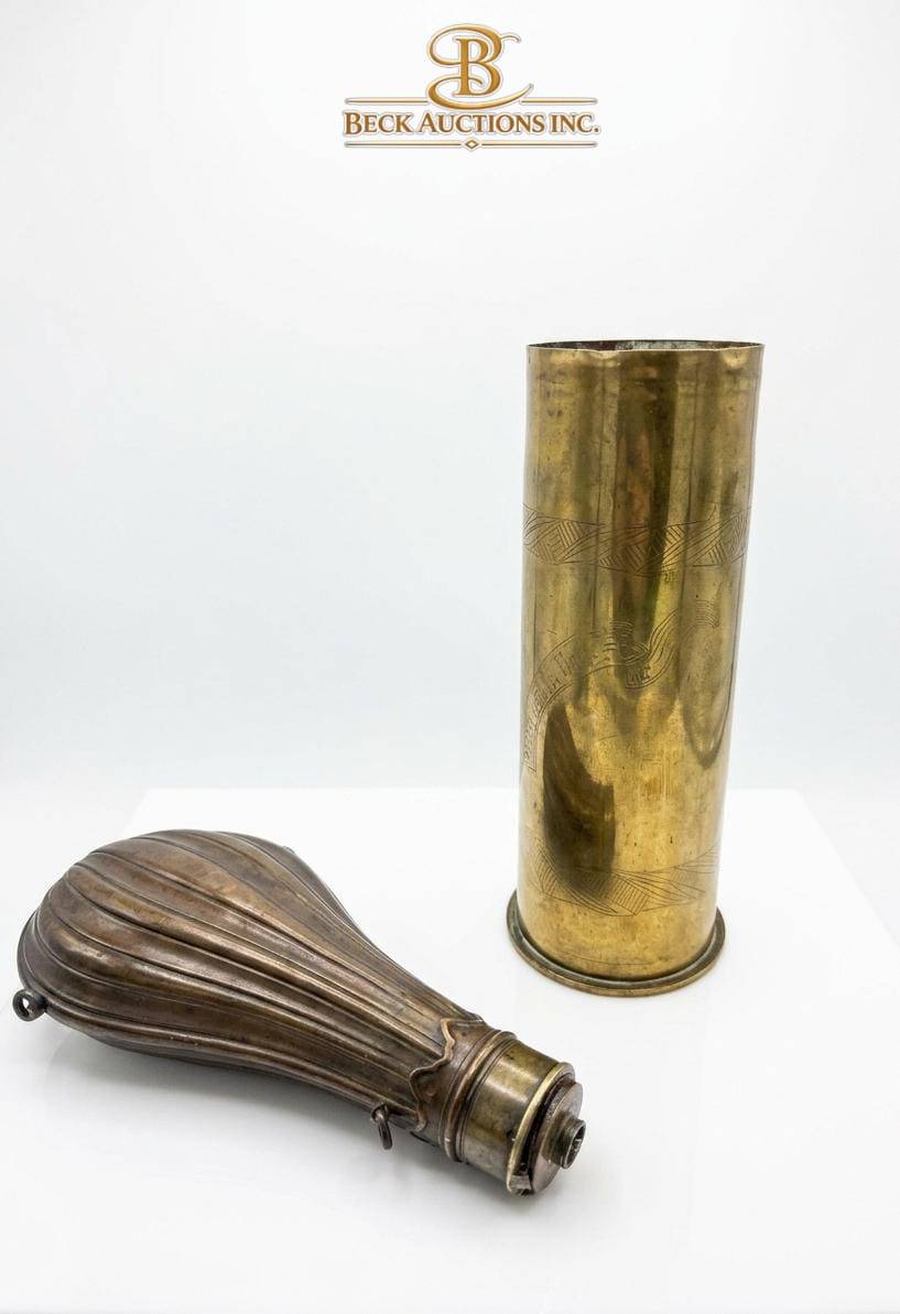 Lot 35 Brass Trench Art Shell Casing and Ornate Powder Flask