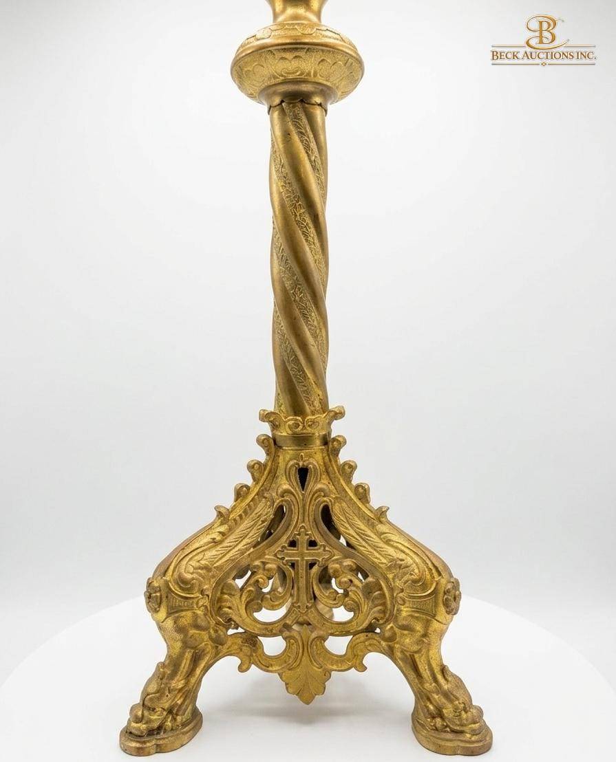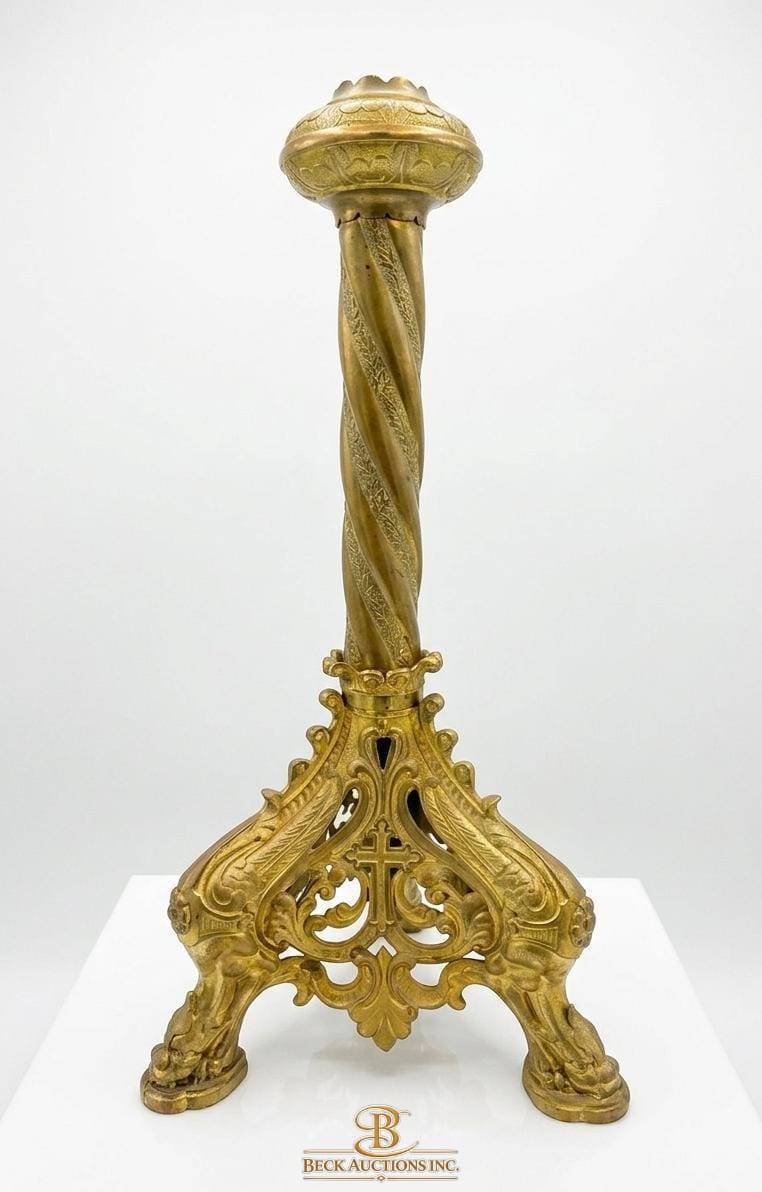 This 21-inch tall gilded metal stand showcases an ornate and meticulously crafted design. The piece features an intricate, openwork base with flowing decorative motifs, supporting a twisted column that culminates in a circular top. Its construction suggests both an aesthetic and functional use, making it a compelling artifact for collectors or decorators seeking distinctively designed metalwork.