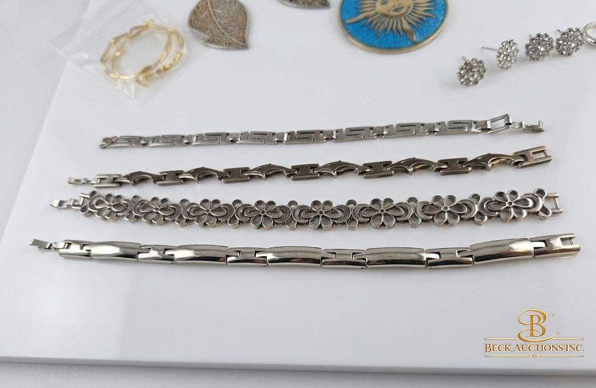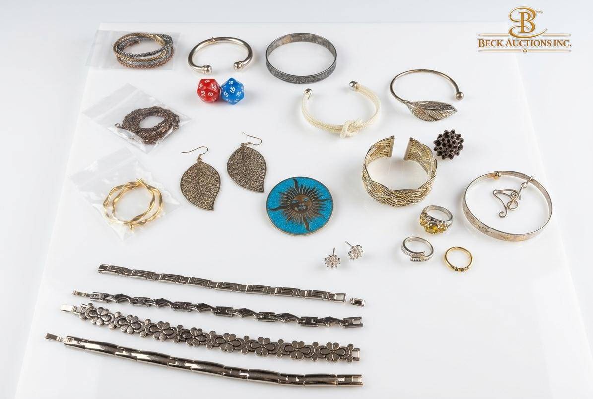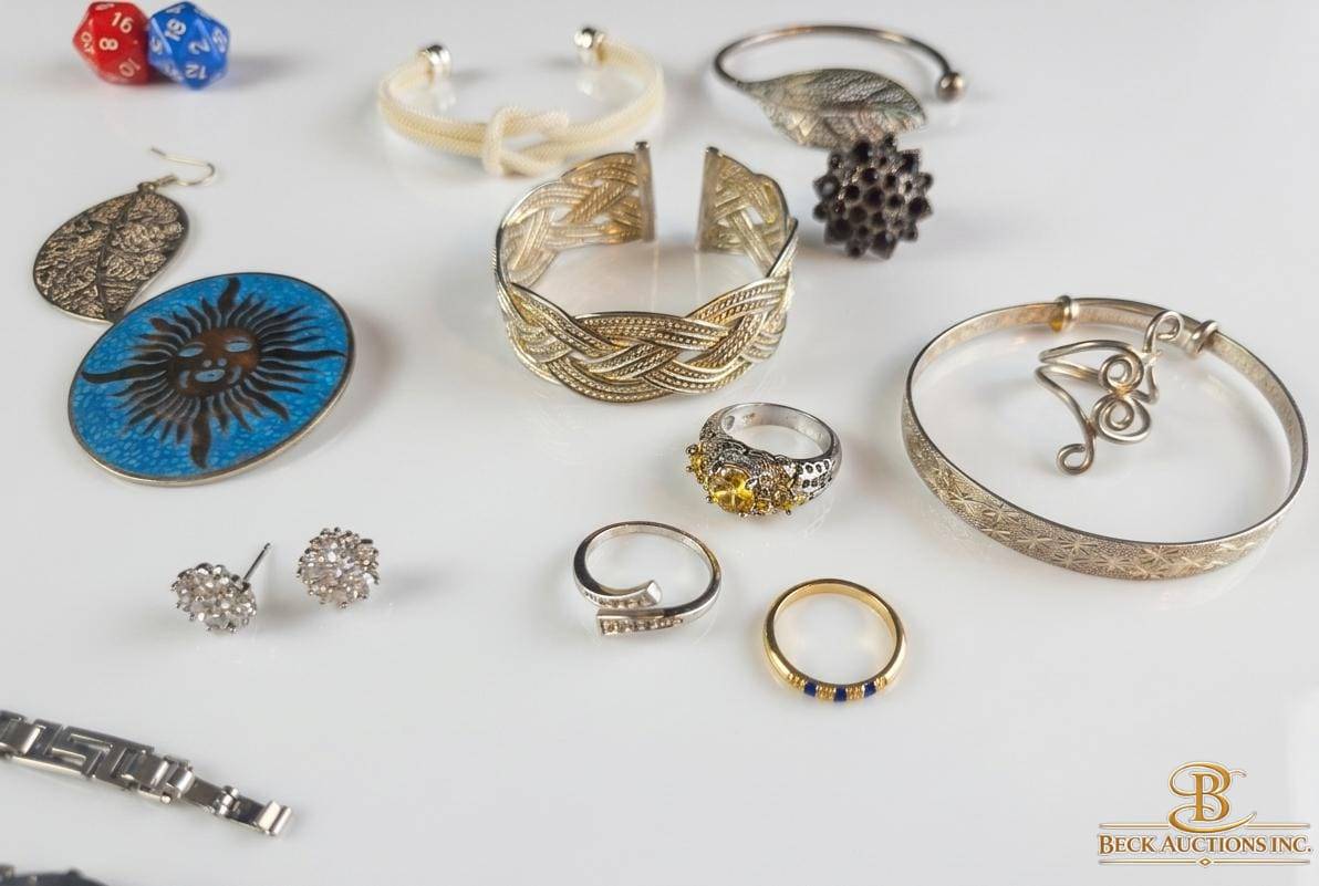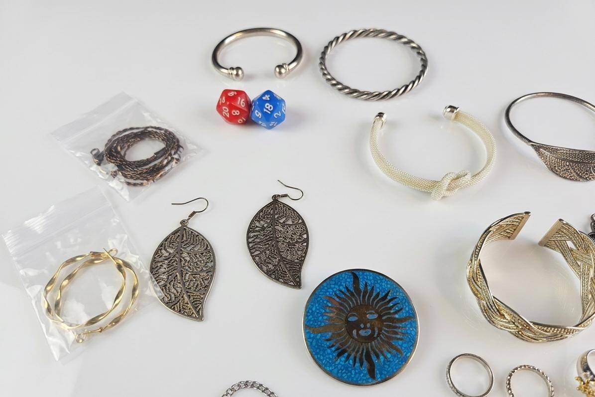 This diverse collection includes over 20 jewelry pieces, featuring bracelets, bangles, earrings, rings, and a brooch. Notable items include a blue circular brooch (approx. 2 in. diameter), floral-decor bracelets (7-8 in. length), and statement rings in various designs (sizes 6-9). Crafted in a mix of materials and finishes, this ensemble offers a broad selection of wearable and collectible accessories.