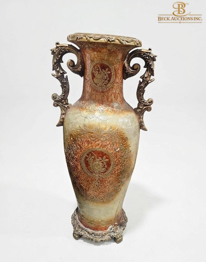 Lot 42 Decorative Vase with Ornate Handles and Embossed Detailing, 40-Inch Height