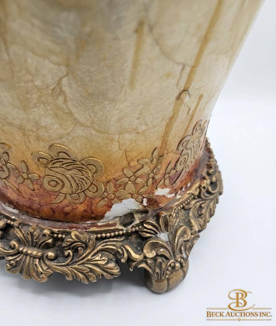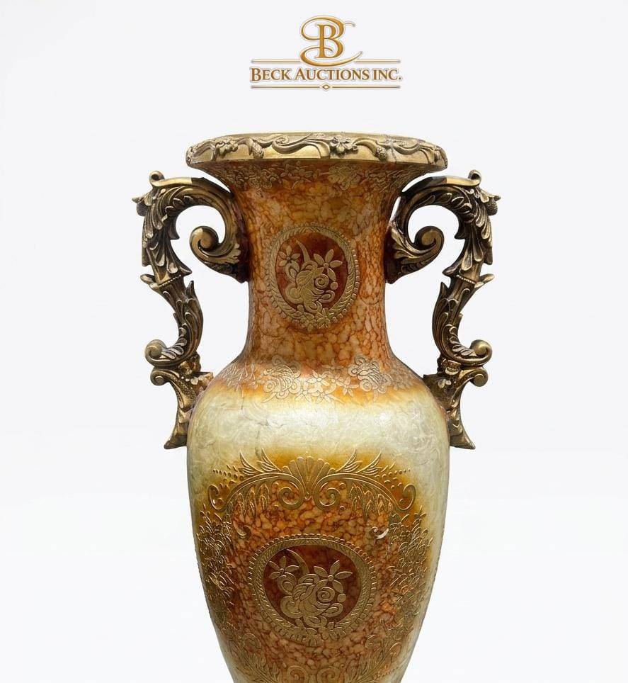This elegantly designed decorative vase measures an impressive 40 inches in height. Its unique features include intricate embossed patterns on the body, ornate handles, and an intricately crafted metallic base. The vase exhibits subtle age wear, contributing to its character and charm. Ideal for display, it boasts exceptional craftsmanship and a commanding presence.