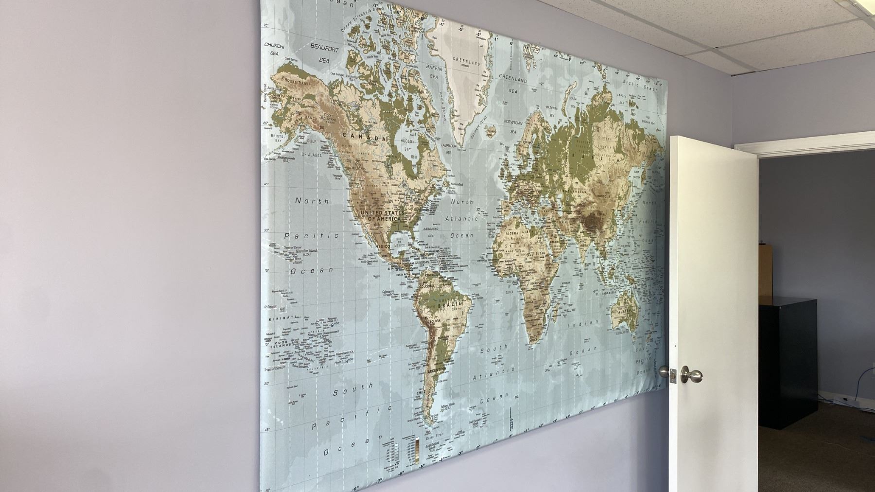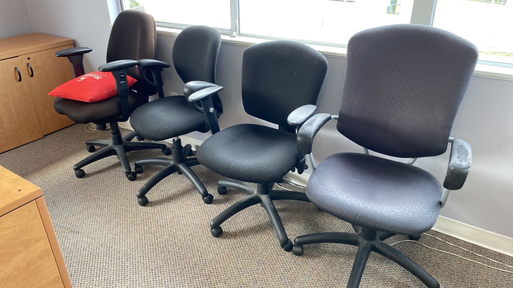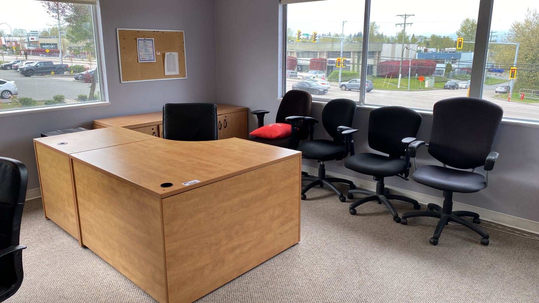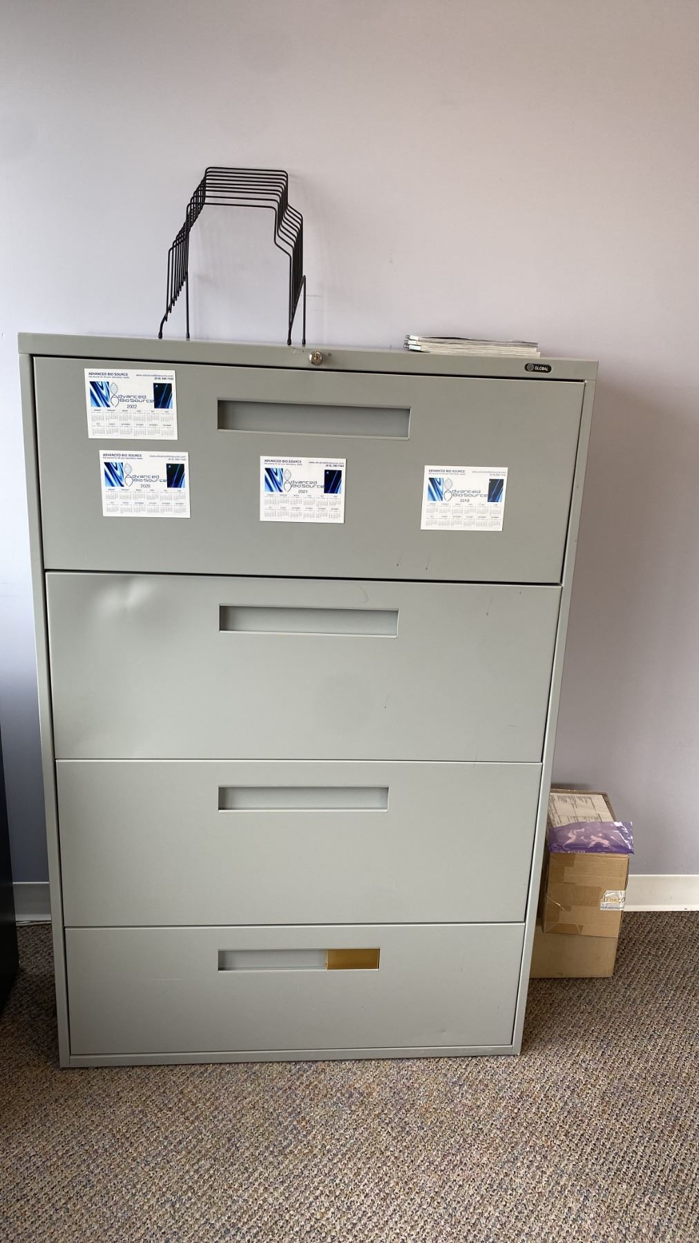 Lot 358 3PCS. OFFICE DESK, 5 OFFICE CHAIRS, 4 DRAWER LATERAL FILING CABINET AND SMALL BLACK METAL