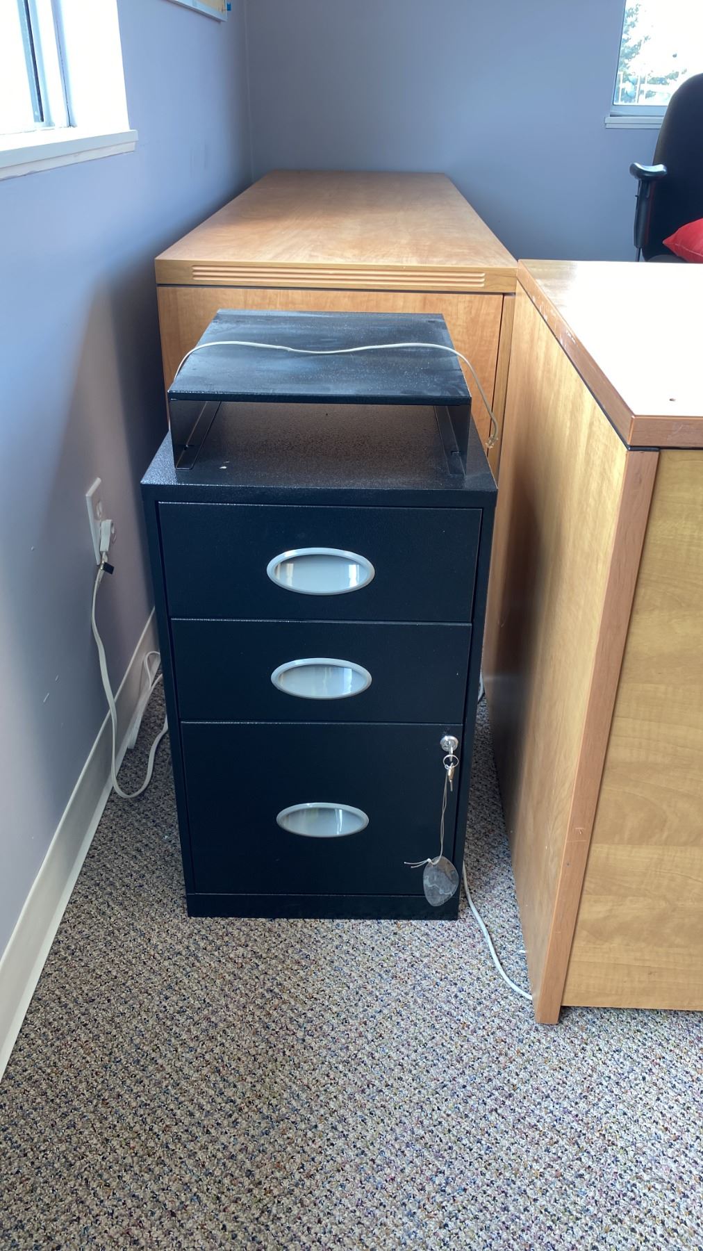 3PCS. OFFICE DESK, 5 OFFICE CHAIRS, 4 DRAWER LATERAL FILING CABINET AND SMALL BLACK METAL 3 DRAWER CABINET