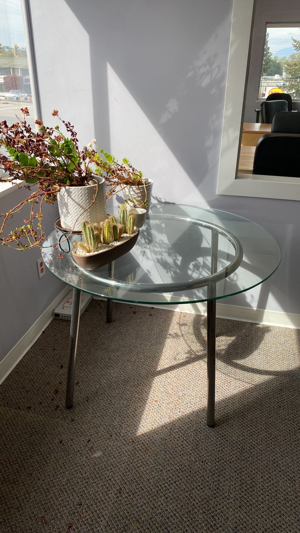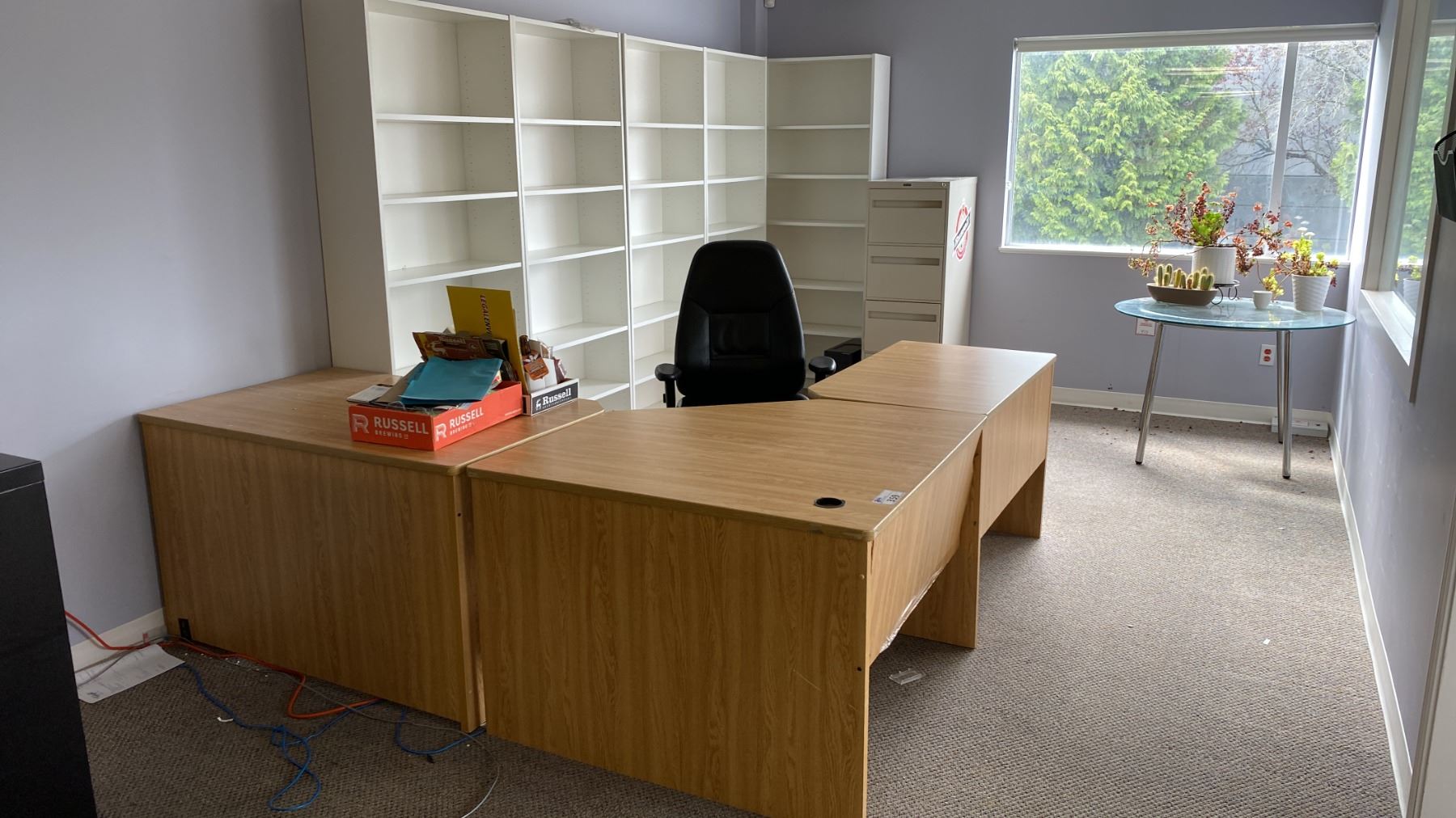 3PCS. OFFICE DESK, 5 WHITE BOOKSHELVES, OFFICE CHAIR, 4 DRAWER FILING CABINET, ROUND GLASS TOP TABLE AND ASSORTED LIVE PLANTS