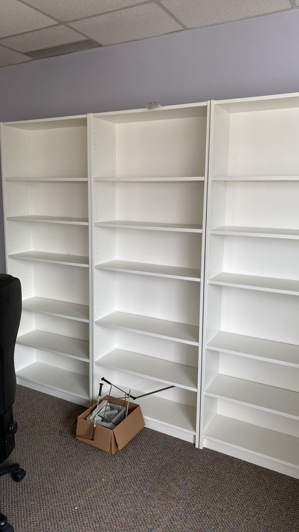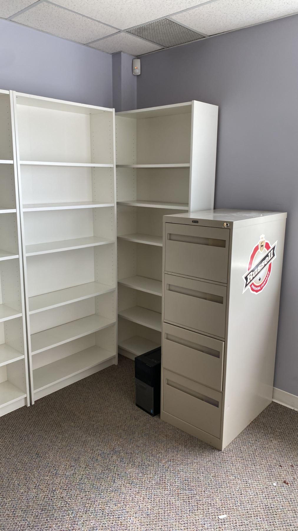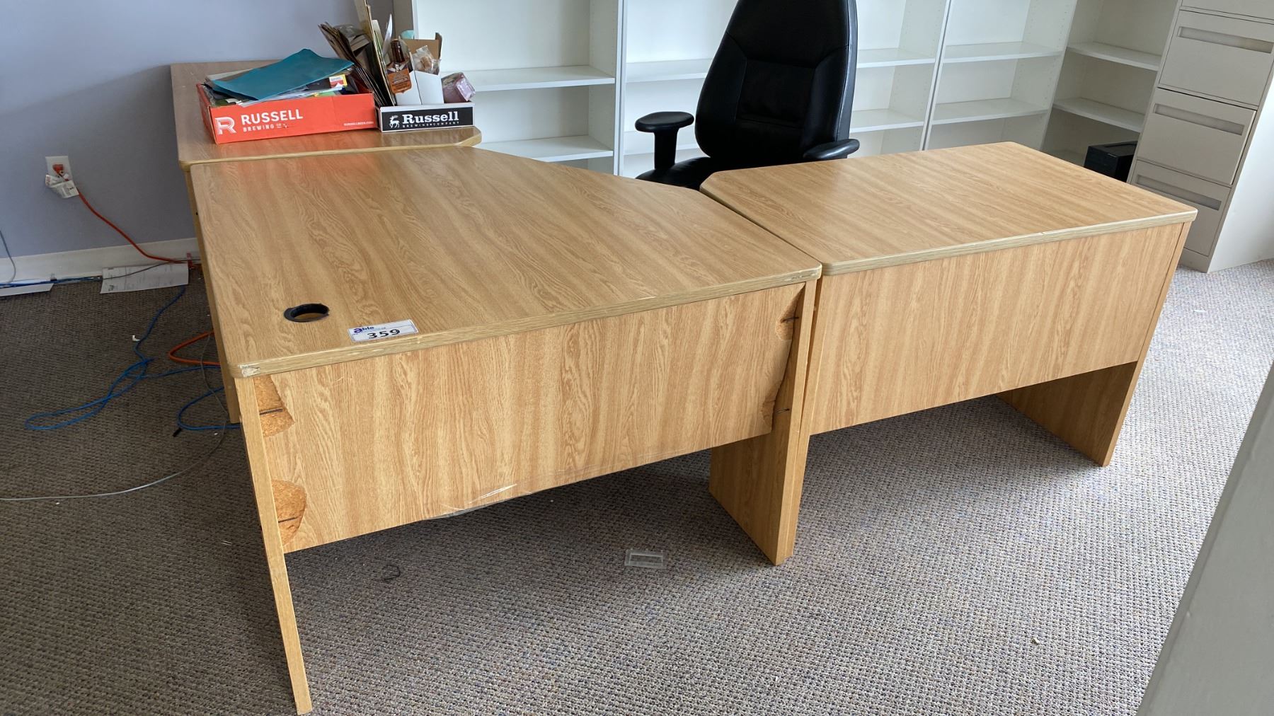 Lot 359 3PCS. OFFICE DESK, 5 WHITE BOOKSHELVES, OFFICE CHAIR, 4 DRAWER FILING CABINET, ROUND GLASS