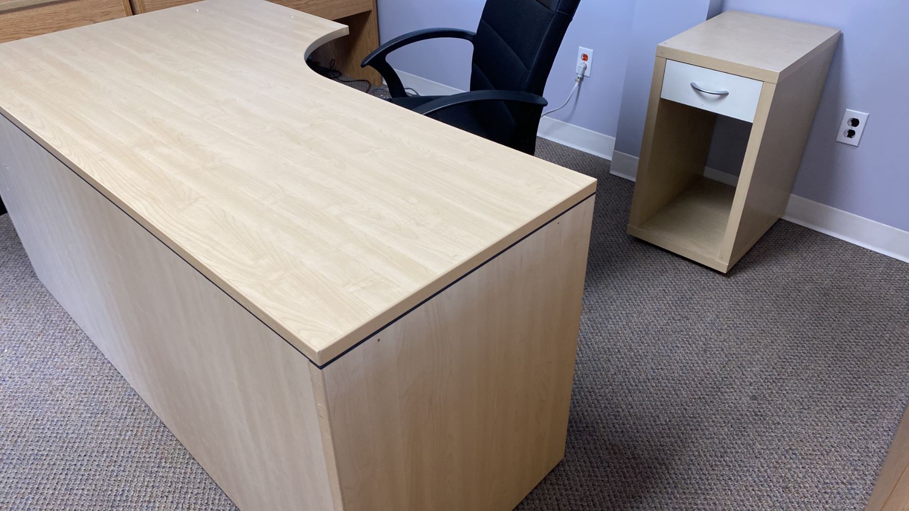 OFFICE DESK WITH SMALL MATCHING SINGLE DRAWER SIDE TABLE AND OFFICE CHAIR