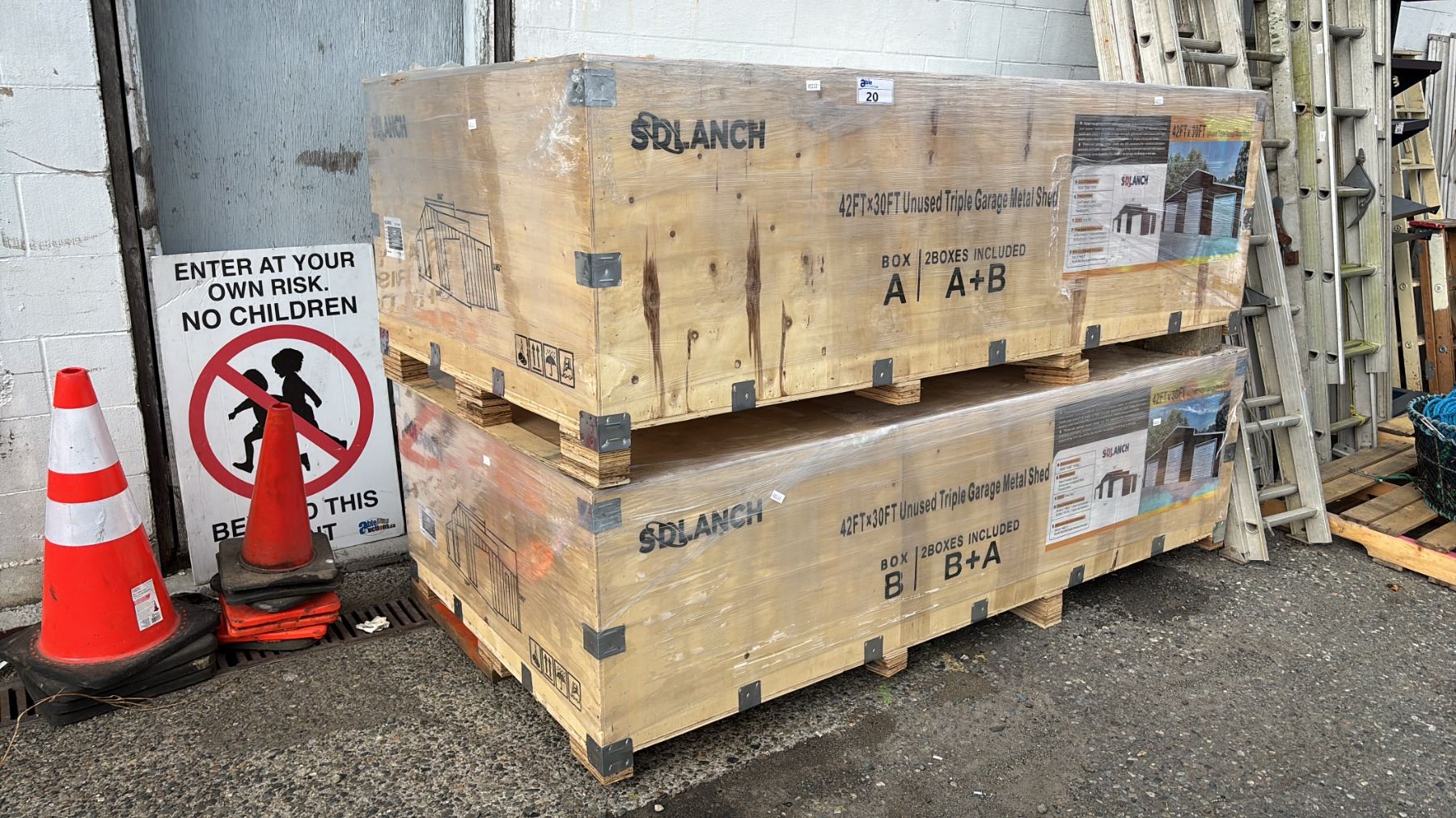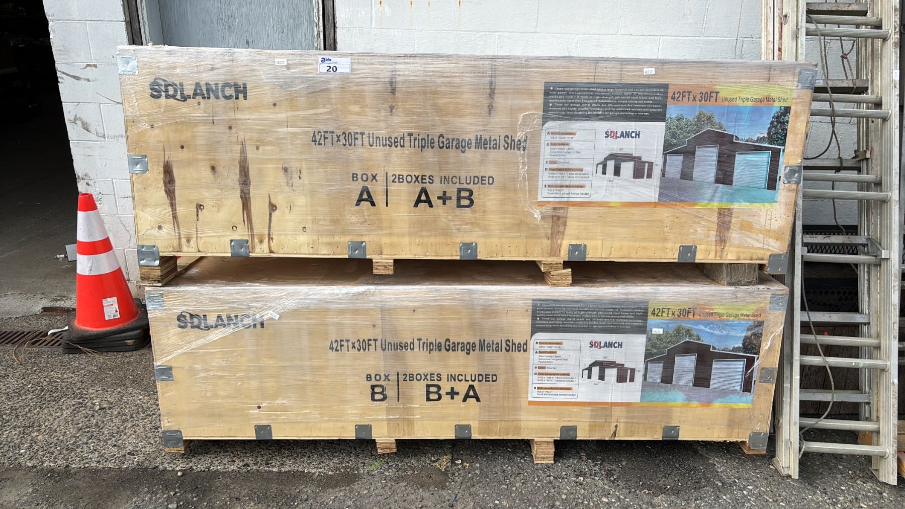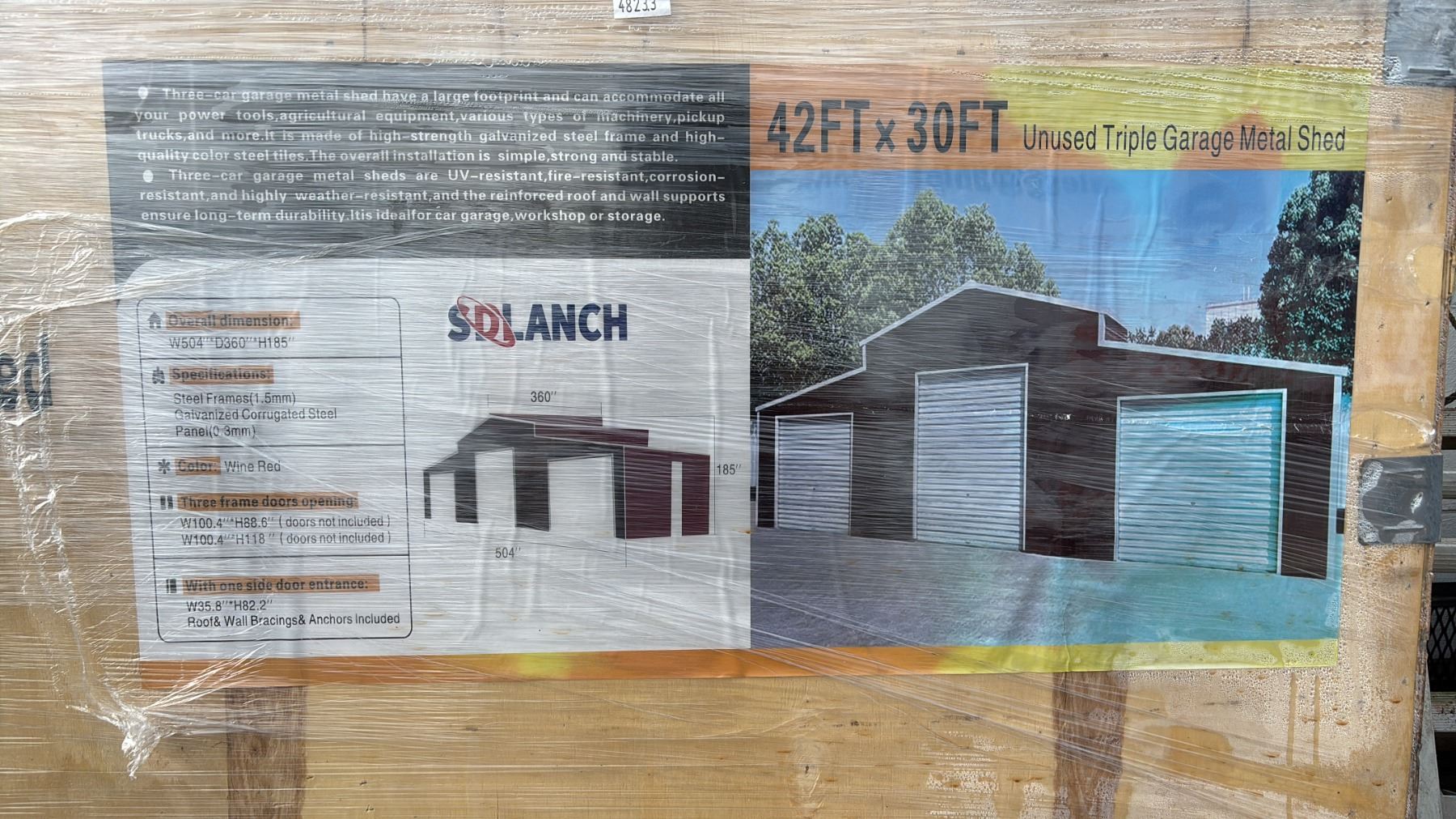Lot 20 *NEW* SDLANCH SDL4230TGMS 42 FT X 30 FT UNUSED TRIPLE GARAGE METAL SHED - WINE RED (2 LARGE CRATES)
