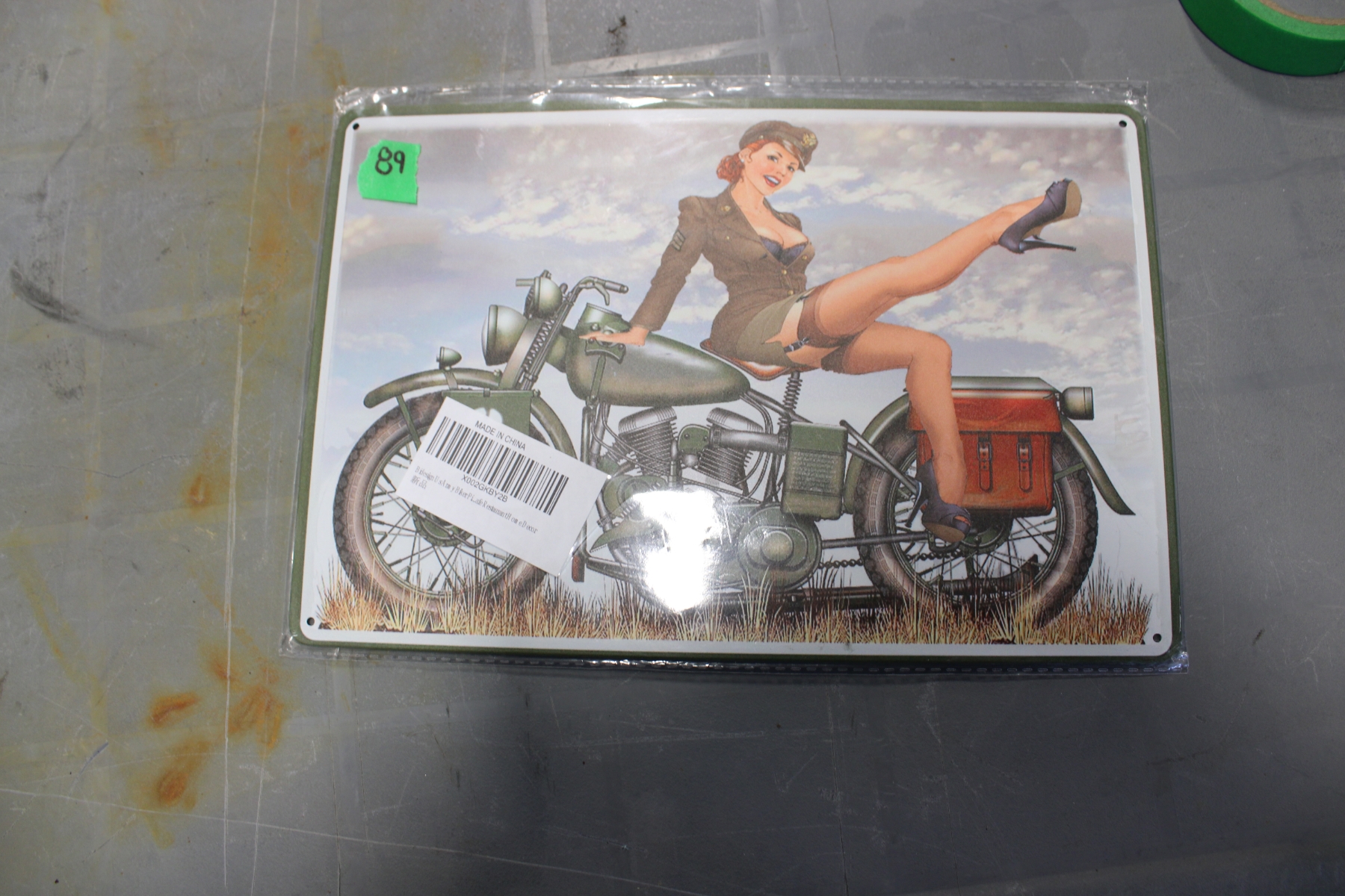 Lot 89 Decorative Metal Sign featuring Lady on Motorcycle