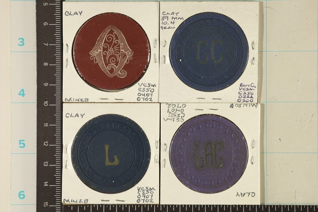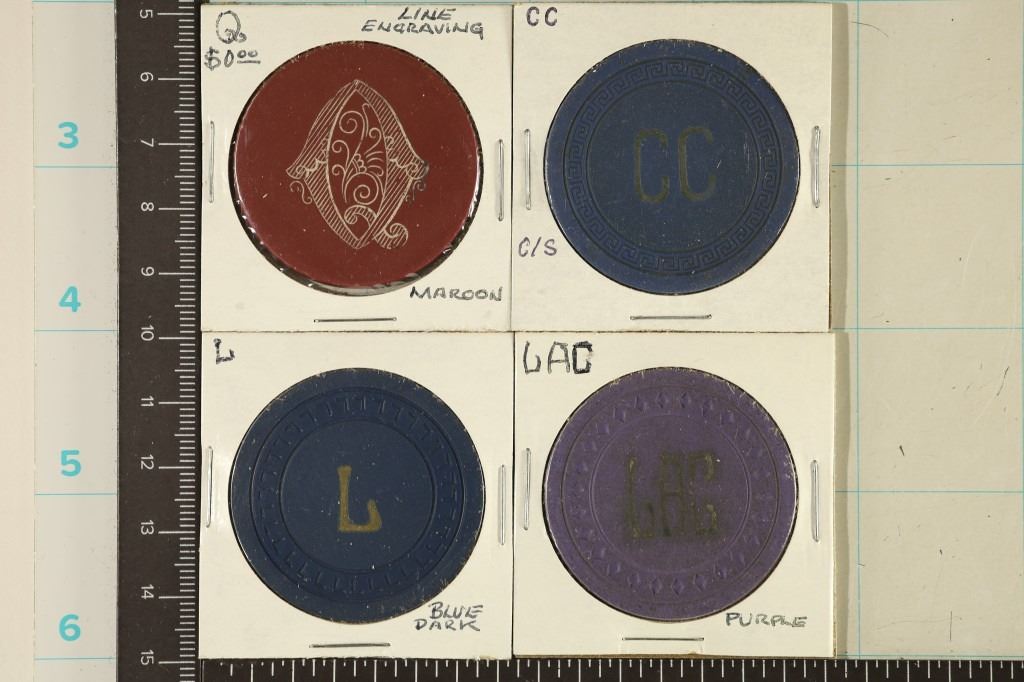 #20 Lot 20 4-CLAY POKER CHIPS: MAROON ENGRAVED, CC, L AND GAC