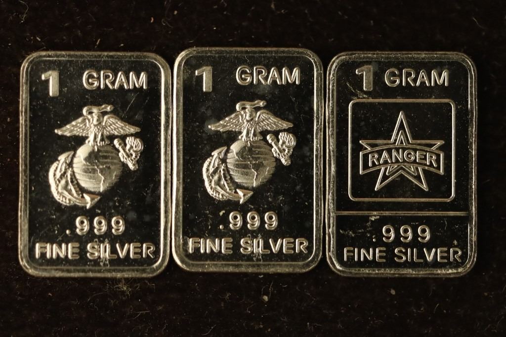 #85 Lot 85 3-1 GRAM .999 SILVER BARS, MARINES, ARMY RANGERS