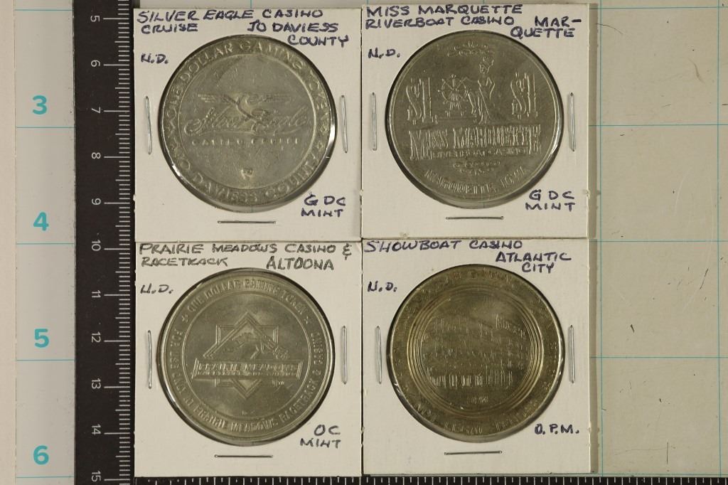 #100 Lot 100 4-METAL CASINO CHIPS: SHOWBOAT CASINO, PRAIRE
