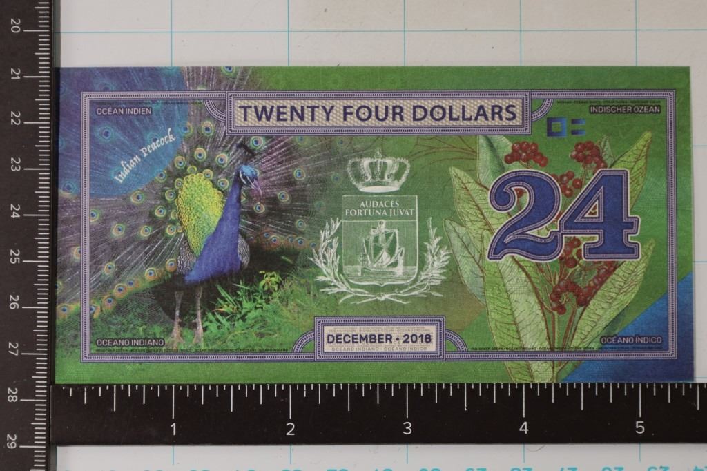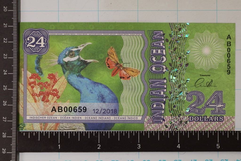 #198 Lot 198 2018 INDIAN OCEAN $24 CRISP UNC COLORIZED BILL